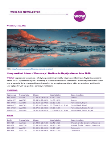 Warszawa, 14.03.2016 Źródło: http://wowair.us/magazine/blog/wow-moments-in-iceland Nowy rozkład lotów z Warszawy i Berlina do Reykjaviku na lato 2016 WOW air zaprasza do korzystania z oferty bezpośrednich przelotów z Warszawy i Berlina do Reykjaviku w sezonie letnim 2016. Częstotliwość rejsów z Warszawy w sezonie letnim została zwiększona z planowanych dwóch do trzech razy w tygodniu! Już w cztery godziny można znaleźć się w magicznym miejscu, jakim bez wątpienia jest Islandia! Loty będą odbywały się zgodnie z poniższym rozkładem: WARSZAWA: Warszawa KEF-WAW WAW-KEF KEF-WAW WAW-KEF KEF-WAW WAW-KEF Numer lotu: WW 502 WW 503 WW 508 WW 509 WW 508 WW 509 Okres: 02.04.16-28.05.16 02.04.16-28.04.16 03.06.16-30.09.16 03.06.16-30.09.16 18.07.16-26.08.16 18.07.16-26.08.16 Czas lokalny: 07:10-13:05 14:05-16:10 15:10-21:05 22:05-00:10 + 1 dzień 15:10-21:05 22:05-00:10 + 1 dzień Dzień tygodnia: Sobota Sobota Poniedziałek, Piątek Poniedziałek, Piątek Poniedziałek, Środa, Piątek Poniedziałek, Środa, Piątek Numer lotu: WW 723 WW 720 WW 721 WW 720 Okres: 27.03.16-31.05.16 27.03.16-31.05.16 01.06.16-16.09.16 01.06.16-16.09.16 Czas lokalny: 12:40-14:25 06:10-11:40 12:40-14:25 06:10-11:40 Dzień tygodnia: Wtorek, Środa, Czwartek, Niedziela Wtorek, Środa, Czwartek, Niedziela Codziennie Codziennie BERLIN: Berlin BER-KEF KEF-BER BER-KEF KEF-BER Hello California! Nowe połączenia WOW air do Los Angeles i San Francisco Z przyjemnością informujemy, że latem 2016 WOW air planuje uruchomienie tanich połączeń do z Reykjaviku do Californii. Rejsy do Los Angeles oraz San Francisco będą odbywały się odpowiednio 4 i 5 razy w tygodniu. Flota WOW air wzbogaci się o nowe samoloty Airbus A330-300, które na tych trasach będą mogły przewieźć 340 pasażerów w klasie ekonomicznej. Sprzedaż biletów została otwarta w styczniu. Atrakcyjne stawki grupowe na połączenia WAW-KEF, BER-KEF oraz VNO-KEF Zapraszamy do składania zamówień na stawki grupowe na połączenia WAW-KEF, BER-KEF oraz VNO-KEF. Polska wersja strony internetowej: Zachęcamy do odwiedzania jej pod adresem : http://wowair.pl/ , na której znajdą Państwo między innymi odpowiedzi na najczęściej zadawane pytania związane z podróżą WOW Air. a także do śledzenia nas na Facebooku: https://www.facebook.com/wowiceland?fref=ts oraz Instagramie: http://instagram.com/wowair Link agencyjny i taryfy TO WOW zaprasza wszystkie biura podróży do współpracy. WOW bilety można kupić w tradycyjnych systemach rezerwacyjnych—stock FlexFlight /W2/ lub na stronie internetowej poprzez link agencyjny - aby go założyć napisz na adres [email protected] . O WOW net rates oraz stawki grupowe także pytaj w naszym biurze: [email protected] Með kveðju / Best Regards Zespół WOW air Tel: +48 22 632 32 05 Email: [email protected] wowair.com / Iceland’s high performance low-cost airline