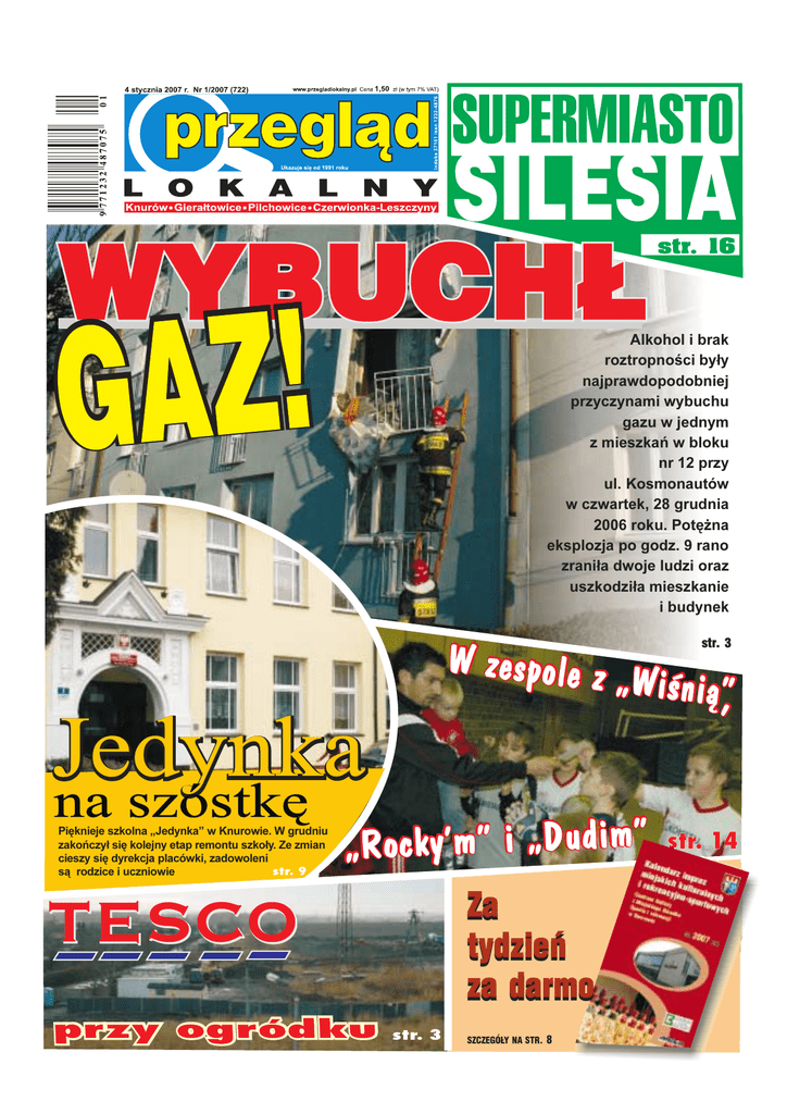 www.przegladlokalny.pl Micha³ Kêdzierski, zastêpca redaktora naczelnego Przegl¹du Lokalnego wygra³ w s¹dzie z Kazimierzem Lubowickim, przewodnicz¹cym KZW ZZ Sierpieñ 80 kopalni Szczyg³owice. Zwi¹zkowiec, wed³ug s¹dów pierwszej i drugiej instancji, nies³usznie oskar¿y³ naszego dziennikarza o znies³awienie. Alkohol i brak roztropnoci by³y najprawdopodobniej przyczynami wybuchu gazu w jednym z mieszkañ w bloku nr 12 przy ul. Kosmonautów w czwartek, 28 grudnia 2006 roku. Potê¿na eksplozja po godz. 9 rano zrani³a dwoje ludzi oraz uszkodzi³a mieszkanie i budynek str. 3 Piêknieje szkolna Jedynka w Knurowie. W grudniu zakoñczy³ siê kolejny etap remontu szko³y. Ze zmian cieszy siê dyrekcja placówki, zadowoleni s¹ rodzice i uczniowie Za tydzieñ za darmo Przegl¹d Lokalny Nr 1 (722) 4 stycznia 2007 roku SZCZEGÓ£Y NA STR. 8 1 aktualnoci KNURÓW Z³omiarzpodpalacz 27 grudnia, oko³o godziny 14, wybuch³ po¿ar w niezamieszka³ym domu przy ul. Wilsona. Widzielimy pijanego mê¿czyznê, który wczeniej opala³ tam kable mówili wiadkowie wydarzenia Wed³ug opowieci s¹siadów, budynek jest w³asnoci¹ knurowianina, który wyjecha³ do Niemiec. Nie potrafi³ znaleæ chêtnych na jego kupno, wiêc odda³ go pod opiekê mê¿czyzny, który ma byæ sprawc¹ po¿aru. Opala³ tam kable, aby po stopieniu izolacji uzyskaæ mied. W rodku by³o pe³no g¹bek i innych mieci, które bardzo szybko zajê³y siê ogniem mówi nastoletni wiadek po¿aru. - Budynek by³ kiedy naszym klubem, ale od momentu, w którym knurowianie zrobili sobie z niego szalet wynielimy siê stamt¹d. Po¿ar ugasi³a Jednostka Ratowniczo-Ganicza przy pomocy Ochotniczej Stra¿y Po¿arnej z Knurowa. Na szczêcie w rodku nie by³o nikogo. Pijany wed³ug relacji, oko³o 30-letni mê¿czyzna, podejrzewany o zaprószenie ognia uciek³ z miejsca zdarzenia. Pawe³ Gradek ZAPROSZENIE Smyczkowy kabaret Grupa MoCarta, znany polski kabaret muzyków graj¹cych na instrumentach smyczkowych wyst¹pi na deskach Gliwickiego Teatru Muzycznego. Artystów bêdzie mo¿na podziwiaæ w czwartek, 11 stycznia, o godz. 19.00. M. Kêdzierski PRZYSZOWICE Zabrzañscy wandale 30 grudnia o godz. 23.15 knurowscy policjanci zatrzymali na ul. Gliwickiej dwóch mê¿czyzn 34 i 42latka, mieszkañców Zabrza, którzy uszkodzili bramê posesji, zniszczyli lusterka boczne samochodu marki Hyundai oraz zniewa¿yli s³ownie funkcjonariuszy. Gradek KNURÓW Hasz go skusi³ 29 grudnia o godz. 16.30 policjanci z sekcji kryminalnej zatrzymali na ul. Kozie³ka 23-letniego mê¿czyznê, który mia³ przy sobie 20 g haszyszu. Gradek 2 EDUKACJA Naucz¹ wszystkich Dr Jerzy Gorzelik, wyk³adowca Uniwersytetu l¹skiego bêdzie jednym prelegentów styczniowej edycji Uniwersytetu dla Wszystkich w gliwickim muzeum, przy ul. Dolnych Wa³ów 8a. 11 stycznia naukowiec wyg³osi odczyt Terra catholica gliviciensis sztuka Ziemi Gliwicko-Toszeckiej w dobie kontrreformacji. Siedem dni póniej dr Gorzelik omówi sztukê Górnego l¹ska doby industrializacji. Styczniow¹ edycjê uniwersytetu zamknie 25 stycznia wyk³ad dr Irmy Kozina z U, która opowie o malarstwie Rembrandta. Wszystkie spotkania, w cenie biletu wstêpu do muzeum, rozpoczynaj¹ siê o godz. 17.00. Polecamy. KNURÓW KNURÓW Kilkaset osób bawi³o siê w parku przy ul. Ogana podczas zorganizowanego przez Centrum Kultury Sylwestra pod chmurk¹. Nie zabrak³o muzyki mechanicznej (wystêp zamówionego zespo³u zosta³ odwo³any z powodu choroby wokalisty), fajerwerków i ¿yczeñ noworocznych. Jak zapewni³ nas Jerzy Kosowski, dyrektor knurowskiego CK, na Bollywoodzkiej Nocy Sylwestrowej w kinie Casino nie zabrak³o fanów tego rodzaju filmów. Seans wzbogaci³y wystêpy zespo³ów tanecznych. 5 stycznia, po godz. 10 w knurowskim punkcie poboru krwi nast¹pi uroczyste oddanie szóstego tysi¹ca litra krwi przez cz³onków klubu Honorowych Dawców Krwi w im. dra Ogana w Knurowie. - Zachêcamy do oddawania krwi jak najwiêcej osób zaprasza Stanis³aw Bogumi³, prezes knurowskich krwiodawców. By³y fajerwerki M. Kêdzierski KNURÓW Do stajenki! Dzieci z oddzia³u integracyjnego 5- i 6-latków Miejskiego Przedszkola nr 13 przygotowa³y jase³ka. Mali aktorzy wcielaj¹c siê w postacie anio³ów, pasterzy, Trzech Króli i wiêtej Rodziny przedstawili historiê niezwyk³ych narodzin Jezusa Chrystusa. Ca³oæ dope³ni³o wspólne kolêdowanie, ³amanie siê op³atkiem i wiele ¿yczeñ. Przedszkolakom w przygotowaniu jase³ek pomaga³y ich nauczycielki: Barbara Pawlus i Izabela Kierchner. oprac. M. Kêdzierski KNURÓW Szarpa³ za mundur 24 grudnia o godz. 00.30 funkcjonariusze policji zatrzymali na ul. Puszkina 20-letniego, nietrzewego mê¿czyznê, który nie chc¹c dopuciæ do przeprowadzenia czynnoci s³u¿bowych szarpa³ za mundur jednego z policjantów. Gradek KNURÓW M³odzi gniewni 22 grudnia podczas interwencji domowej przy ul. £okietka, funkcjonariusze z knurowskiego Komisariatu Policji zatrzymali 17 i 19-latka, którzy szarpali siê z policjantami i kierowali pod ich adresem groby. Gradek Kolejny tysi¹c KNURÓW Dary serc Stowarzyszenie na Rzecz Rozwoju Gmin Powiatu Gliwickiego podsumowa³o wi¹teczny, charytatywny koncert Dary Serc w Domu Kultury w Szczyg³owicach, który odby³ siê na pocz¹tku grudnia ubieg³ego roku. Przed i w trakcie koncertu przedstawiciele Stowarzyszenia sprzedawali cegie³ki, z których dochód wyniós³ 5 tys. z³. Jak zapewnia W³odzimierz Gwi¿d¿, odpowiedzialny za rozliczenie sprzeda¿y cegie³ek, wszystkie pieni¹dze trafi³y do domów opieki spo³ecznej na terenie powiatu gliwickiego i orodka Caritas w Knurowie. Micha³ Kêdzierski na Koloniji Nowe trendy w wi¹tecznym wystroju podwórka wyznaczaj¹ mieszkañcy ul. Kociuszki. W przydomowym ogródku stan¹³ wielki dmuchany Miko³aj, który cieszy oko zarówno mieszkañców Koloniji, jak i przejezdnych. Gradek KNURÓW Amator dwóch kó³ek W wigilijny wieczór nieznany sprawca zerwa³ k³ódkê, zabezpieczaj¹c¹ wejcie do 