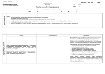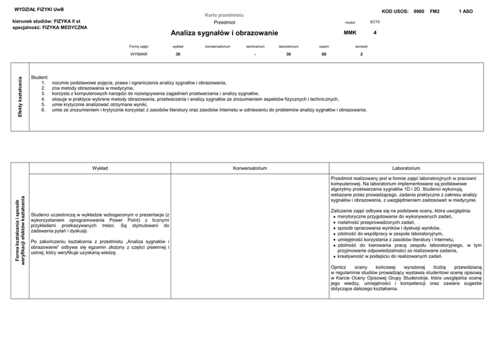 WYDZIAŁ FIZYKI UwB KOD USOS: Karta przedmiotu Efekty kształcenia kierunek studiów: FIZYKA II st specjalność: FIZYKA MEDYCZNA Student: 1. 2. 3. 4. 5. 6. moduł ECTS Analiza sygnałów i obrazowanie MMK 4 Formy zajęć wykład WYMIAR 30 konwersatorium seminarium laboratorium razem semestr - 30 60 2 FM2 1 ASO rozumie podstawowe pojęcia, prawa i ograniczenia analizy sygnałów i obrazowania, zna metody obrazowania w medycynie, korzysta z komputerowych narzędzi do rozwiązywania zagadnień przetwarzania i analizy sygnałów, stosuje w praktyce wybrane metody obrazowania, przetwarzania i analizy sygnałów ze zrozumieniem aspektów fizycznych i technicznych, umie krytycznie analizować otrzymane wyniki, umie ze zrozumieniem i krytycznie korzystać z zasobów literatury oraz zasobów Internetu w odniesieniu do problemów analizy sygnałów i obrazowania. Wykład Forma kształcenia i sposób weryfikacji efektów kształcenia Przedmiot 0900 Konwersatorium Laboratorium Przedmiot realizowany jest w formie zajęć laboratoryjnych w pracowni komputerowej. Na laboratorium implementowane są podstawowe algorytmy przetwarzania sygnałów 1D i 2D. Studenci wykonują, wskazane przez prowadzącego, zadania praktyczne z zakresu analizy sygnałów i obrazowania, z uwzględnieniem zastosowań w medycynie. Studenci uczestniczą w wykładzie wzbogaconym o prezentacje (z wykorzystaniem oprogramowania Power Point) z licznymi przykładami przekazywanych treści. Są stymulowani do zadawania pytań i dyskusji. Po zakończeniu kształcenia z przedmiotu „Analiza sygnałów i obrazowanie” odbywa się egzamin złożony z części pisemnej i ustnej, który weryfikuje uzyskaną wiedzę. Zaliczenie zajęć odbywa się na podstawie oceny, która uwzględnia: merytoryczne przygotowanie do wykonywanych zadań, rzetelność przeprowadzonych zadań, sposób opracowania wyników i dyskusji wyników, zdolność do współpracy w zespole laboratoryjnym, umiejętność korzystania z zasobów literatury i Internetu, zdolność do kierowania pracą zespołu laboratoryjnego, w tym przyjmowanie odpowiedzialności za realizowane zadania, kreatywność w podejściu do realizowanych zadań. Oprócz oceny końcowej wyrażonej liczbą przewidzianą w regulaminie studiów prowadzący wystawia studentowi ocenę opisową w Karcie Oceny Opisowej Grupy Studenckije, która uwzględnia ocenę jego wiedzy, umiejętności i kompetencji oraz zawiera sugestie dotyczące dalszego kształcenia. HARMONOGRAM ZAJĘĆ Semestr 2 Wykład Konwersatorium Laboratorium tydzień Podstawowe pojęcia z zakresu przetwarzania i analizy sygnałów. Źródła sygnałów. Klasyfikacja sygnałów. Parametry sygnałów. Biblioteki przetwarzania sygnałów 1D i 2D 1 Akwizycja i przetwarzanie sygnałów. Dyskretne reprezentacje sygnałów analogowych. Tor przetwarzania analogowocyfrowego. Generowanie sygnałów. Edycja sygnału na przykładzie plików dźwiękowych. Wyznaczanie parametrów sygnału dźwiękowego. 2 Analiza sygnałów w dziedzinie czasu: wartość średnia i energia sygnału, obwiednia amplitudowa sygnału. Analiza korelacyjna. Analiza widmowa sygnałów okresowych. 3 Analiza częstotliwościowa sygnałów dyskretnych i jej interpretacja. Widmowa gęstość mocy. Spektrogramy. Analiza częstotliwościowa sygnałów dyskretnych - metody nieparametryczne. 4 Filtracja cyfrowa. Filtry rekursywne i nierekursywne. Filtracja adaptacyjna. Algorytmy filtracji cyfrowej. Analiza częstotliwościowa sygnałów – charakterystyki częstotliwościowe filtrów. 5 Podstawowe metody cyfrowej analizy sygnału. Rozpoznawanie sygnałów fonicznych. Spektrogram sygnałów niestacjonarnych. 6 Obraz – definicja i struktura. Rodzaje obrazów. Biblioteki przetwarzania obrazów 7 Zasady tworzenia obrazu cyfrowego. Dyskretyzacja obrazu. Metody pozyskiwania obrazów cyfrowych. Urządzenia do pozyskiwania obrazów. Sposoby pozyskiwania różnych zobrazowań medycznych (RTG, CT, NMR, PET, USG, termowizja, obrazowania radioizotopowe). Reprezentacje obrazów cyfrowych. Wczytywanie i zapisywanie obrazów. 8 Wyświetlanie i zapisywanie obrazów, formaty plików. Obrazy barwne, modele barw. Modele barwne – RGB, CMYK, HSL, CIE Lab, gray scale. 9 Klasyczne metody przetwarzania obrazu. Podział i ogólna charakterystyka algorytmów. Przekształcenia bezkontekstowe obrazu ( punktowe, arytmetyczne i geometryczne). Transformacje geometryczne obrazu - translacja, rotacje, skalowanie. Korekcja jasności, kontrastu i gamma obrazu cyfrowego. 10 Kontekstowa filtracja obrazów. Filtry liniowe i nieliniowe. Dwuwymiarowa dyskretna transformata Fouriera. Filtracja przestrzenna. Histogram obrazu – wizualizacja i transformacje histogramu. Transformacja obrazu za pomocą krzywych jasności. 11 Przekształcenia morfologiczne. Rodzaje i schemat wykonywania operacji morfologicznej na obrazie cyfrowym. Ogólna charakterystyka typowych i złożonych przekształceń morfologicznych. Maskowanie obrazu - definiowanie maski, wizualizacja maski. Przekształcenia obrazu z uwzględnieniem zdefiniowanej maski. 12 Metody przetwarzania obrazów do zastosowań medycznych: łączenie obrazów CT i NMR, rekonstrukcja obiektów trójwymiarowych na podstawie serii przekrojów tomograficznych. Transformata Fouriera i odwrotna transformata Fouriera (DFT lub FFT), wizualizacja transformaty, filtracja w dziedzinie częstotliwości. 13 Analiza obrazów cyfrowych. Metody segmentacji i indeksacji obrazu. Pomiary na obrazach cyfrowych w tym ocena rozmiarów i kształtów obiektów, analiza tekstury, tworzenie statystyk. Wybrane przekształcenia morfologiczne. Pomiary na obrazach cyfrowych. 14 Rozpoznawanie obiektów w obrazie. Analiza obrazów w medycynie. Rekonstrukcja obrazu. Zaliczenie LITERATURA DODATKOWA ZALECANA LITERATURA LITERATURA J. Szabatin, Podstawy teorii sygnałów, WKiŁ, Warszawa 2002. T.P. Zieliński, Cyfrowe przetwarzanie sygnałów, WKiŁ, Warszawa 2005. R. Tadeusiewicz, P. Kohoroda, Komputerowa anali
