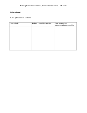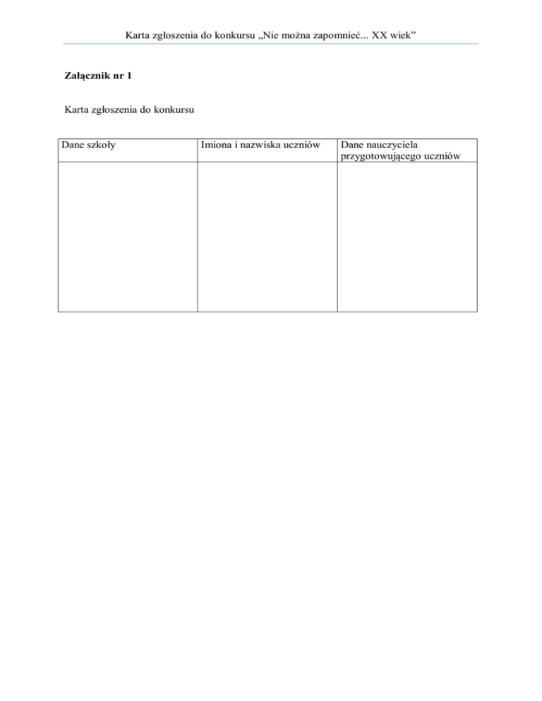 Karta zgłoszenia do konkursu „Nie można zapomnieć... XX wiek” Załącznik nr 1 Karta zgłoszenia do konkursu Dane szkoły Imiona i nazwiska uczniów Dane nauczyciela przygotowującego uczniów