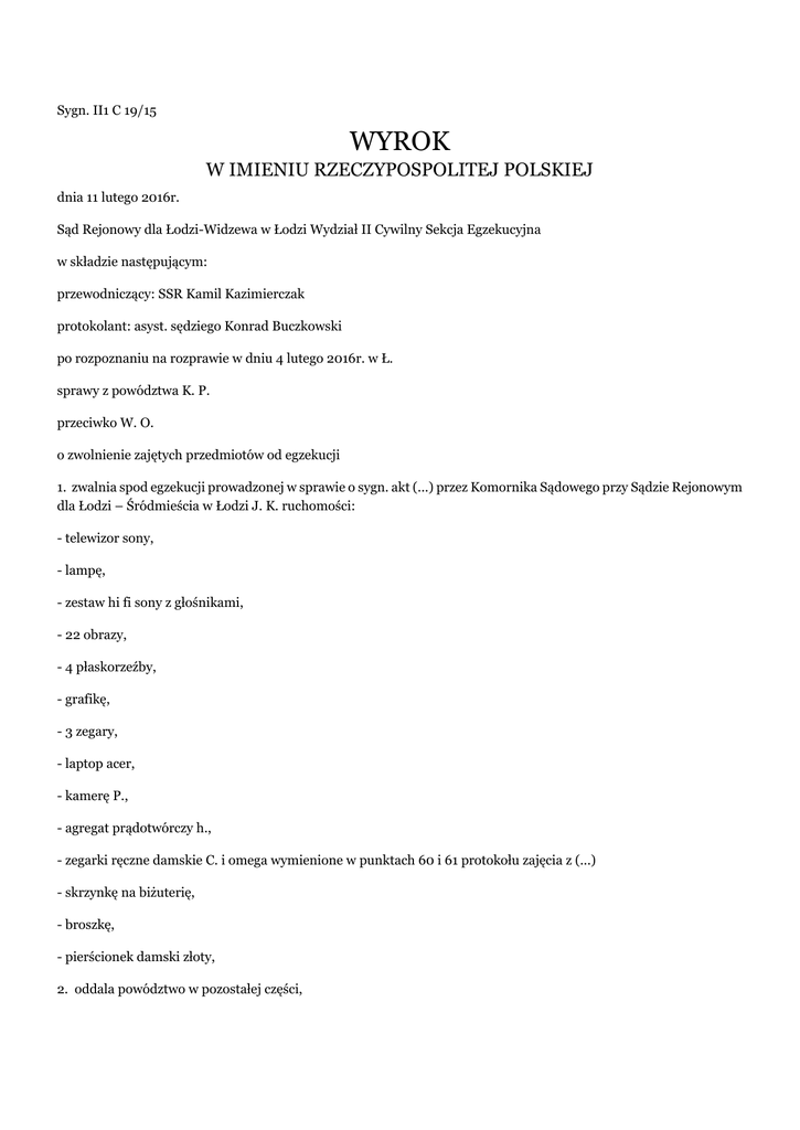 Sygn. II1 C 19/15 WYROK W IMIENIU RZECZYPOSPOLITEJ POLSKIEJ dnia 11 lutego 2016r. Sąd Rejonowy dla Łodzi-Widzewa w Łodzi Wydział II Cywilny Sekcja Egzekucyjna w składzie następującym: przewodniczący: SSR Kamil Kazimierczak protokolant: asyst. sędziego Konrad Buczkowski po rozpoznaniu na rozprawie w dniu 4 lutego 2016r. w Ł. sprawy z powództwa K. P. przeciwko W. O. o zwolnienie zajętych przedmiotów od egzekucji 1. zwalnia spod egzekucji prowadzonej w sprawie o sygn. akt (...) przez Komornika Sądowego przy Sądzie Rejonowym dla Łodzi – Śródmieścia w Łodzi J. K. ruchomości: - telewizor sony, - lampę, - zestaw hi fi sony z głośnikami, - 22 obrazy, - 4 płaskorzeźby, - grafikę, - 3 zegary, - laptop acer, - kamerę P., - agregat prądotwórczy h., - zegarki ręczne damskie C. i omega wymienione w punktach 60 i 61 protokołu zajęcia z (...) - skrzynkę na biżuterię, - broszkę, - pierścionek damski złoty, 2. oddala powództwo w pozostałej części, 3. znosi wzajemnie koszty procesu między stronami. Sygn. akt II 1 C 19/15 UZASADNIENIE W pozwie z dnia 18 września 2014r. (data stempla pocztowego) K. P. zażądała od W. O. zwolnienia spod zajęcia 64 szczegółowo wymienionych rzeczy ruchomych, co do których podnosiła, że jest ich właścicielką. Na poparcie powództwa wskazała, iż częściowo są one jej przedmiotami użytku osobistego, a częściowo nabyła je w drodze dziedziczenia po ojcu. Powództwo wniesiono pierwotnie do Sądu Rejonowego dla Łodzi – Śródmieścia w Łodzi. Postanowieniem z dnia 29 grudnia 2014r. Sąd Okręgowy w Łodzi zabezpieczył powództwo zawieszając postępowanie egzekucyjne w sprawie (...) Komornika Sądowego przy Sądzie Rejonowym dla Łodzi Śródmieścia w Łodzi J. K., zmieniając tym samym postanowienie Sądu Rejonowego dla Łodzi – Śródmieścia w Łodzi, którym wniosek ten pierwotnie oddalono. Prawomocnym postanowieniem z dnia 26 września 2014r. Sąd Rejonowy dla Łodzi – Śródmieścia w Łodzi stwierdził swoją niewłaściwość i przekazał sprawę do rozpoznania Sądowi Rejonowemu dla Łodzi – Widzewa w Łodzi. W piśmie z dnia 28 maja 2015r. oraz na rozprawie w dniu 4 lutego 2016r. powódka zmodyfikowała powództwo, ograniczając je ostatecznie do żądania zwolnienia spod zajęcia następujących przedmiotów: - telewizora sony, - lampy, - zestawu hi fi sony z głośnikami, - 22 obrazów, - 4 płaskorzeźb, - grafiki, - 3 zegarów, - laptopa acer, - kamery P., - agregatu prądotwórczego h., - 7 zegarków ręcznych, - 2 banknotów kolekcjonerskich, - tableta Samsung, - skrzynki na biżuterię, - broszki, - pierścionka damskiego złotego, Pozwany wniósł o oddalenie powództwa. Sąd ustalił następujący stan faktyczny: W toku egzekucji prowadzonej z wniosku W. O. przeciwko Z. P. komornik J. K. zajął w dniu 10 sierpnia 2014r. kilkadziesiąt przedmiotów ruchomych w miejscu zamieszkania dłużnika Z. P.. (bezsporne w świetle twierdzeń stron oraz dokumentów: - protokołu zajęcia k167 - 169 akt (...) komornika J. K., a także kopii tego protokołu k. 6-13, - zawiadomienia k. 170 ww. akt komorniczych) Spośród zajętych przedmiotów część sprzedano w drodze licytacji, a część w trybie komisowym. Pozostały natomiast ruchomości w postaci: - telewizora sony, - lampy, - zestawu hi fi sony z głośnikami, - 22 obrazów, - 4 płaskorzeźb, - grafiki, - 3 zegarów, - laptopa acer, - kamery P., - agregatu prądotwórczego h., - 7 zegarków ręcznych, - 2 banknotów kolekcjonerskich, - tableta Samsung, - skrzynki na biżuterię, - broszki, - pierścionka damskiego złotego. (bezsporne w świetle stanowisk stron, pisma komornika k. 45, a także protokołów sprzedaży w załączonych aktach Km 1362/12 – k. 200, 216 – 223) Przedmioty takie jak: telewizor, lampa, zestaw hi fi, płaskorzeźby, grafiki, zegary, kamera, agregat prądotwórczy stanowiły w przeszłości elementy wyposażenia i własność rodziców małżonki dłużnika - powódki K. P., a mianowicie J. M. (1) i J. M. (2). Posiadali je jeszcze zamieszkując przy ul. (...) w Ł.. (dowód: zeznania świadków T. J. k. 71 i M. S. k. 76) J. M. (1) zmarł dnia 4 sierpnia 2013r., a spadek po nim odziedziczyły po połowie żona J. M. (2) i córka K. P. po ½ części każda z nich. (dowód: odpis postanowienia Sądu Rejonowego dla Łodzi – Śródmieścia w Łodzi z dnia 22 stycznia 2014r. w sprawie III Ns 1940/13) Do K. P. należą również zegarki ręczne damskie, broszka, pierścionek złoty damski i skrzynka na biżuterię, a także laptop, wykorzystywany do prowadzenia działalności gospodarczej. (dowód: zeznania Kaoliny P. k. 114; sąd wziął tu pod uwagę także domniemanie faktyczne, że przedmioty typowo damskie należą do kobiety, a także domniemanie, że do działalności gospodarczej potrzebny jest komputer) W domu małżonków P. znajdowały się również zegarki męskie, które Z. P. pokazywał w przeszłości M. S. mówiąc, że dostał je od teścia. (dowód: zeznania M. S. k. 76) Jeden z tych zegarków - B. dłużnik miał w momencie zajęcia na ręce. (dowód: kopia protokołu zajęcia k. 9) Oceniając materiał dowodowy sąd oparł się o zeznania powódki tylko w takim zakresie, w jakim znalazły one potwierdzenie w innych źródłach dowodowych, jak świadkowie, czy w domniemaniach faktycznych. Powódka, będąc małżonką dłużnika, jest bowiem w oczywisty sposób zainteresowana w rozstrzygnięciu sprawy na jego korzyść i jej twierdzenia i zeznania traktować należy w sposób co najmniej ostrożny, nie dając wiary w zakresie niepotwierdzonym przez inne dowody. Zeznania świadków są w ocenie sądu wiarygodne, ponieważ nie ma powodu, aby odmówić im wiarygodności, w szczególności zaś M. S., który zeznawał częściowo na niekorzyść powódki podając, że to jej małżonek otrzymał zegarki od jej ojca, a nie odwrotnie, jak zeznała K. P. (k. 114 v). W ocenie sądu powódka nie udowodniła swo