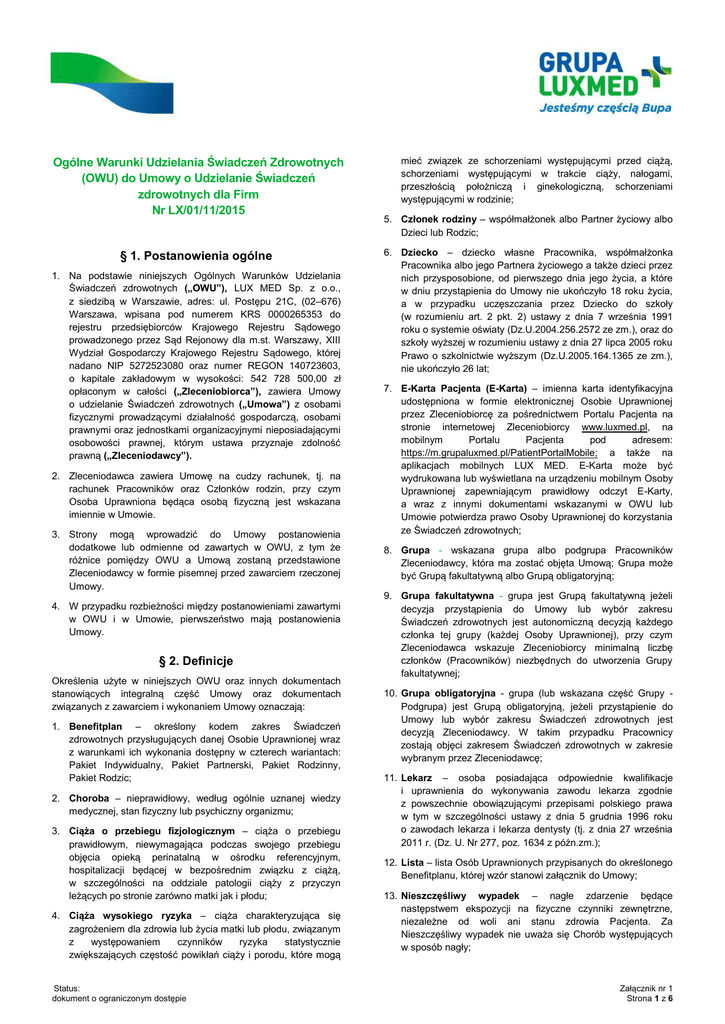 Ogólne Warunki Udzielania Świadczeń Zdrowotnych (OWU) do Umowy o Udzielanie Świadczeń zdrowotnych dla Firm Nr LX/01/11/2015 § 1. Postanowienia ogólne 1. Na podstawie niniejszych Ogólnych Warunków Udzielania Świadczeń zdrowotnych („OWU”), LUX MED Sp. z o.o., z siedzibą w Warszawie, adres: ul. Postępu 21C, (02–676) Warszawa, wpisana pod numerem KRS 0000265353 do rejestru przedsiębiorców Krajowego Rejestru Sądowego prowadzonego przez Sąd Rejonowy dla m.st. Warszawy, XIII Wydział Gospodarczy Krajowego Rejestru Sądowego, której nadano NIP 5272523080 oraz numer REGON 140723603, o kapitale zakładowym w wysokości: 542 728 500,00 zł opłaconym w całości („Zleceniobiorca”), zawiera Umowy o udzielanie Świadczeń zdrowotnych („Umowa”) z osobami fizycznymi prowadzącymi działalność gospodarczą, osobami prawnymi oraz jednostkami organizacyjnymi nieposiadającymi osobowości prawnej, którym ustawa przyznaje zdolność prawną („Zleceniodawcy”). 2. Zleceniodawca zawiera Umowę na cudzy rachunek, tj. na rachunek Pracowników oraz Członków rodzin, przy czym Osoba Uprawniona będąca osobą fizyczną jest wskazana imiennie w Umowie. 3. Strony mogą wprowadzić do Umowy postanowienia dodatkowe lub odmienne od zawartych w OWU, z tym że różnice pomiędzy OWU a Umową zostaną przedstawione Zleceniodawcy w formie pisemnej przed zawarciem rzeczonej Umowy. 4. W przypadku rozbieżności między postanowieniami zawartymi w OWU i w Umowie, pierwszeństwo mają postanowienia Umowy. § 2. Definicje Określenia użyte w niniejszych OWU oraz innych dokumentach stanowiących integralną część Umowy oraz dokumentach związanych z zawarciem i wykonaniem Umowy oznaczają: 1. Benefitplan – określony kodem zakres Świadczeń zdrowotnych przysługujących danej Osobie Uprawnionej wraz z warunkami ich wykonania dostępny w czterech wariantach: Pakiet Indywidualny, Pakiet Partnerski, Pakiet Rodzinny, Pakiet Rodzic; 2. Choroba – nieprawidłowy, według ogólnie uznanej wiedzy medycznej, stan fizyczny lub psychiczny organizmu; 3. Ciąża o przebiegu fizjologicznym – ciąża o przebiegu prawidłowym, niewymagająca podczas swojego przebiegu objęcia opieką perinatalną w ośrodku referencyjnym, hospitalizacji będącej w bezpośrednim związku z ciążą, w szczególności na oddziale patologii ciąży z przyczyn leżących po stronie zarówno matki jak i płodu; 4. Ciąża wysokiego ryzyka – ciąża charakteryzująca się zagrożeniem dla zdrowia lub życia matki lub płodu, związanym z występowaniem czynników ryzyka statystycznie zwiększających częstość powikłań ciąży i porodu, które mogą Status: dokument o ograniczonym dostępie mieć związek ze schorzeniami występującymi przed ciążą, schorzeniami występującymi w trakcie ciąży, nałogami, przeszłością położniczą i ginekologiczną, schorzeniami występującymi w rodzinie; 5. Członek rodziny – współmałżonek albo Partner życiowy albo Dzieci lub Rodzic; 6. Dziecko – dziecko własne Pracownika, współmałżonka Pracownika albo jego Partnera życiowego a także dzieci przez nich przysposobione, od pierwszego dnia jego życia, a które w dniu przystąpienia do Umowy nie ukończyło 18 roku życia, a w przypadku uczęszczania przez Dziecko do szkoły (w rozumieniu art. 2 pkt. 2) ustawy z dnia 7 września 1991 roku o systemie oświaty (Dz.U.2004.256.2572 ze zm.), oraz do szkoły wyższej w rozumieniu ustawy z dnia 27 lipca 2005 roku Prawo o szkolnictwie wyższym (Dz.U.2005.164.1365 ze zm.), nie ukończyło 26 lat; 7. E-Karta Pacjenta (E-Karta) – imienna karta identyfikacyjna udostępniona w formie elektronicznej Osobie Uprawnionej przez Zleceniobiorcę za pośrednictwem Portalu Pacjenta na stronie internetowej Zleceniobiorcy www.luxmed.pl, na mobilnym Portalu Pacjenta pod adresem: https://m.grupaluxmed.pl/PatientPortalMobile; a także na aplikacjach mobilnych LUX MED. E-Karta może być wydrukowana lub wyświetlana na urządzeniu mobilnym Osoby Uprawnionej zapewniającym prawidłowy odczyt E-Karty, a wraz z innymi dokumentami wskazanymi w OWU lub Umowie potwierdza prawo Osoby Uprawnionej do korzystania ze Świadczeń zdrowotnych; 8. Grupa - wskazana grupa albo podgrupa Pracowników Zleceniodawcy, która ma zostać objęta Umową; Grupa może być Grupą fakultatywną albo Grupą obligatoryjną; 9. Grupa fakultatywna - grupa jest Grupą fakultatywną jeżeli decyzja przystąpienia do Umowy lub wybór zakresu Świadczeń zdrowotnych jest autonomiczną decyzją każdego członka tej grupy (każdej Osoby Uprawnionej), przy czym Zleceniodawca wskazuje Zleceniobiorcy minimalną liczbę członków (Pracowników) niezbędnych do utworzenia Grupy fakultatywnej; 10. Grupa obligatoryjna - grupa (lub wskazana część Grupy Podgrupa) jest Grupą obligatoryjną, jeżeli przystąpienie do Umowy lub wybór zakresu Świadczeń zdrowotnych jest decyzją Zleceniodawcy. W takim przypadku Pracownicy zostają objęci zakresem Świadczeń zdrowotnych w zakresie wybranym przez Zleceniodawcę; 11. Lekarz – osoba posiadająca odpowiednie kwalifikacje i uprawnienia do wykonywania zawodu lekarza zgodnie z powszechnie obowiązującymi przepisami polskiego prawa w tym w szczególności ustawy z dnia 5 grudnia 1996 roku o zawodach lekarza i lekarza dentysty (tj. z dnia 27 września 2011 r. (Dz. U. Nr 277, poz. 1634 z późn.zm.); 12. Lista – lista Osób Uprawnionych przypisanych do określonego Benefitplanu, której wzór stanowi załącznik do Umowy; 13. Nieszczęśliwy wypadek – nagłe zdarzenie będące następstwem ekspozycji na fizyczne czynniki zewnętrzne, niezależne od woli ani stanu zdrowia Pacjenta. Za Nieszczęśliwy wypadek nie uważa się Chorób występujących w sposób nagły; Załącznik nr 1 Strona 1 z 6 14. Osoba Uprawniona (Pacjent) – osoba fizyczna, która nie ukończyła 70 lat, w przypadku Dziecka 26 lat, a w przypadku Rodzica 80 lat, wskazana, na zasadach określonych w Umowi