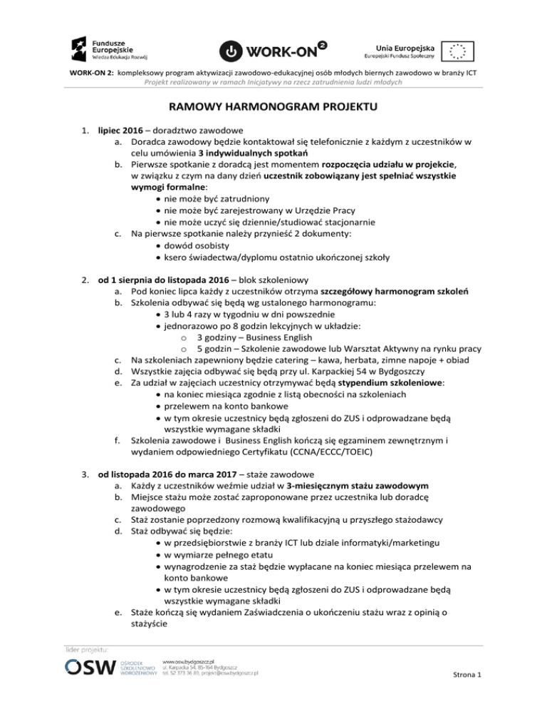 WORK-ON 2: kompleksowy program aktywizacji zawodowo-edukacyjnej osób młodych biernych zawodowo w branży ICT Projekt realizowany w ramach Inicjatywy na rzecz zatrudnienia ludzi młodych RAMOWY HARMONOGRAM PROJEKTU 1. lipiec 2016 – doradztwo zawodowe a. Doradca zawodowy będzie kontaktował się telefonicznie z każdym z uczestników w celu umówienia 3 indywidualnych spotkań b. Pierwsze spotkanie z doradcą jest momentem rozpoczęcia udziału w projekcie, w związku z czym na dany dzień uczestnik zobowiązany jest spełniać wszystkie wymogi formalne: nie może być zatrudniony nie może być zarejestrowany w Urzędzie Pracy nie może uczyć się dziennie/studiować stacjonarnie c. Na pierwsze spotkanie należy przynieść 2 dokumenty: dowód osobisty ksero świadectwa/dyplomu ostatnio ukończonej szkoły 2. od 1 sierpnia do listopada 2016 – blok szkoleniowy a. Pod koniec lipca każdy z uczestników otrzyma szczegółowy harmonogram szkoleń b. Szkolenia odbywać się będą wg ustalonego harmonogramu: 3 lub 4 razy w tygodniu w dni powszednie jednorazowo po 8 godzin lekcyjnych w układzie: o 3 godziny – Business English o 5 godzin – Szkolenie zawodowe lub Warsztat Aktywny na rynku pracy c. Na szkoleniach zapewniony będzie catering – kawa, herbata, zimne napoje + obiad d. Wszystkie zajęcia odbywać się będą przy ul. Karpackiej 54 w Bydgoszczy e. Za udział w zajęciach uczestnicy otrzymywać będą stypendium szkoleniowe: na koniec miesiąca zgodnie z listą obecności na szkoleniach przelewem na konto bankowe w tym okresie uczestnicy będą zgłoszeni do ZUS i odprowadzane będą wszystkie wymagane składki f. Szkolenia zawodowe i Business English kończą się egzaminem zewnętrznym i wydaniem odpowiedniego Certyfikatu (CCNA/ECCC/TOEIC) 3. od listopada 2016 do marca 2017 – staże zawodowe a. Każdy z uczestników weźmie udział w 3-miesięcznym stażu zawodowym b. Miejsce stażu może zostać zaproponowane przez uczestnika lub doradcę zawodowego c. Staż zostanie poprzedzony rozmową kwalifikacyjną u przyszłego stażodawcy d. Staż odbywać się będzie: w przedsiębiorstwie z branży ICT lub dziale informatyki/marketingu w wymiarze pełnego etatu wynagrodzenie za staż będzie wypłacane na koniec miesiąca przelewem na konto bankowe w tym okresie uczestnicy będą zgłoszeni do ZUS i odprowadzane będą wszystkie wymagane składki e. Staże kończą się wydaniem Zaświadczenia o ukończeniu stażu wraz z opinią o stażyście Strona 1