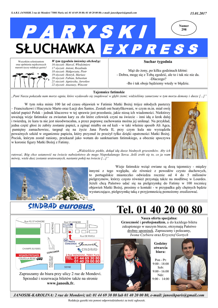 S.A.R.L JANOSIK 2 rue de Mondovi 75001 Paris; tel. 01 44 69 30 80; 01 40 20 00 80; e-mail: [email protected] 15.01.2017 PARYSKI Numer 298 SŁUCHAWKA E X P R E S S Wszystkim solenizantom oraz spełnienia najskrytszych marzeń życzy redakcja gazety! Suchar tygodnia W tym tygodniu imieniny obchodzą: 16 styczeń: Marcel, Włodzimierz 17 styczeń: Antoni, Rozalinda 18 styczeń: Małgorzata, Piotr 19 styczeń: Henryk, Mariusz 20 styczeń: Fabian, Sebastian 21 styczeń: Agnieszka, Jarosław 22 styczeń: Anastazy, Wincent Mąż do żony, po kilku godzinach kłótni: - Dobra, mogę się z Tobą zgodzić, ale to i tak nic nie da. -Dlaczego? -Bo i tak oboje będziemy wtedy w błędzie. Tajemnice fatimskie „Pani Nasza pokazała nam morze ognia, które wydawało się znajdować w głębi ziemi; widzieliśmy zanurzone w tym morzu demony i dusze […]” W tym roku minie 100 lat od czasu objawień w Fatimie Matki Bożej trójce młodych pasterzy – Franciszkowi i Hiacyncie Marto oraz Łucji dos Santos. Zostali oni beatyfikowani, w czym m.in. miał swój udział papież Polak - jednak kluczowe w tej sprawie jest przesłanie, jakie niosą ich wiadomości. Niektórzy uważają wizje fatimskie za zwiastun kary za zło które człowiek czyni na świecie - inni idą o krok dalej i twierdzą, że kara ta nie jest nieodwracalna, a przez poprawę zachowania można jej uniknąć. Na przykład, jedna część głosi że zabity zostanie papież, a zginąć miałby on od kuli - w taki właśnie sposób Ali Agca, pamiętny zamachowiec, targnął się na życie Jana Pawła II, przy czym kula nie wyrządziła poważnych szkód w organizmie papieża, który przyznał że przeżył tylko dzięki opatrzności Matki Bożej. Pocisk, którym został raniony, przekazał jako wotum do sanktuarium fatimskiego, a obecnie spoczywa w koronie figury Matki Bożej z Fatimy. „Widzieliście piekło, dokąd idą dusze biednych grzeszników. Aby ich ratować, Bóg chce ustanowić na świecie nabożeństwo do mego Niepokalanego Serca. Jeśli zrobi się to, co ja wam mówię, wiele dusz zostanie uratowanych, nastanie pokój na świecie […]” Wizje fatimskie wciąż owiane są dozą tajemnicy - między innymi z tego względu, ale również z powodów czysto duchowych, to portugalskie miasteczko odwiedza rocznie od 4 do 5 milionów pielgrzymów, którzy często również przystają także na modlitwę w Lourdes. Jeżeli chcą Państwo udać się na pielgrzymkę do Fatimy w 100 rocznicę objawień Matki Bożej, prosimy o kontakt - w przypadku gdy chętnych będzie wystarczająco, pielgrzymkę taką z przyjemnością pomożemy zrealizować. Tel. 01 40 20 00 80 Nasza oferta specjalna: Grzeczność i profesjonalizm, a do każdego biletu zakupionego w naszym biurze, otrzymają Państwo drobny upominek. Zapraszamy i polecamy, Iwona Czebiera oraz Krzysztof Gortych Godziny otwarcia biura: Zapraszamy do biura przy ulicy 2 rue de Mondovi. Sprzedaż i rezerwacja biletów także na stronie www.janosik.fr. Pon - Pt: 9:00 - 18:00 Sob: 9:00 - 16:00 Ndz: 9:00 - 14:00 JANOSIK-KAROLINA: 2 rue de Mondovi; tel: 01 44 69 30 80 lub 01 40 20 00 80, e-mail: [email protected] Redakcja gazetki nie ponosi odpowiedzialności za treść ogłoszeń. PRACA : Zatrudnienie dla niani na pół etatu, godziny zmienne – praca deklarowana. Opieka nad rocznym dzieckiem oraz zawożenie autobusem do i z przedszkola 4-latka. Poszukiwana osoba z doświadczeniem, punktualna, dyspozycyjna od poniedziałku do piątku, mieszkająca w okolicach Le Plessis-Robinson 92, Paryż (RER B). Tel: 06 78 22 43 20 Poszukujemy uczciwej i odpowiedzialnej osoby na stanowisko Opiekunki dla rodziny potrzebującej pomocy w opiece nad 2 dzieci (4 i 5 lat) we Francji (Strabourg). Dzieci komunikują się w języku polskim, francuski oraz rosyjskim. Tel: + 48 796 802 809 Spawacz TIG - tel. +48 571 445 378; [email protected] Spawanie elementów maszyn spożywczych, spawanie metodą TIG, spawanie stali nierdzewnej, - wymagane doświadczenie. Frezer CNC - tel. +48 571 445 378; [email protected] Ustawianie i programowanie frezarek CNC, produkcja elementów do przemysłu lotniczego ze stali, aluminium, żeliwa i plastiku, kontrola jakości wykonanych produktów - wymagane doświadczenie. Jeżeli chcesz zorganizować pielgrzymkę, wycieczkę lub inną imprezę – zapraszamy do nas! Wynajem autokarów, organizacja wyjazdów, atrakcyjne ceny. 01 44 69 30 80 www.facebook.com/SindbadJanosik/ MIESZKANIE — USŁUGI — NAUKA — INNE : Mężczyzna lat 42 pozna panią poważnie myślącą o życiu. Jestem uczciwym, solidnym, pracującym człowiekiem. Tel. 07 55 16 36 02. Wszelaka prawna pomoc w administracji francuskiej (RSA, CAF, CNAV, ASSURANCE MALADIE, otwieranie firm i inne). Kontakt: Edyta - 06.22.72.26.68 [email protected] Francuzka, lat 40, szuka elastycznego, poważnego mężczyzny na poziomie do wspólnego spędzania czasu z perspektywą na dłuższy związek. Tylko poważne oferty - tel. 06.70.11.49.35. Masz problemy z piciem? Może Anonimowi Alkoholicy pomogą! NIEDZIELA - 17.00: 3 rue Rampale (kod: 9172), Paris, Metro: Belleville. WTOREK – 19.30: 18 rue Claude Lorrain, Paris, Metro: Exelmans. ŚRODA – 19.30: 20 rue Legendre (I piętro), Paris, Metro: Villiers. CZWARTEK: 19.30: 11 Ville St-Jacques (kod: 0911); 10.45 -12.15: 3 rue Rampal, (kod: 9172), Metro: Belleville Godz. 19.30: (GRUPA AA DLA KOBIET) 3, rue Rampal, (kod: 9172), 75019 Paris, Metro: Belleville. Szukamy pracy na budowie, 2 os. malarz, pomocnik, przeprowadzki, remonty. Tel. 06.64.19.81.65 Polski Salon Fryzjersko-Kosmetyczny MARGOT 06.16.86.31.57 - Kosmetyczka 06.83.60.47.93 - Fryzjerka Mężczyzna lat 45 pozna panią około lat 40 do poważnego związku. Tel. 06.05.97.64.55 Centrum Informacji Prawnej i Socjalnej dla Polonii oferuje pomoc w sprawach prawnych (w tym prawo pracy), socjalnych i administracyjnych oraz w urzędach. Kontakt: Tel. 06.14.31.98.47 [email protected] Mieszkanie do wynajęcia: Epinay-sur-Seine 40 m2 - 700 e