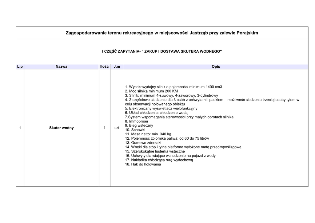 Zagospodarowanie terenu rekreacyjnego w miejscowości Jastrząb przy zalewie Porajskim I CZĘŚĆ ZAPYTANIA- " ZAKUP I DOSTAWA SKUTERA WODNEGO" L.p 1 Nazwa Skuter wodny Ilość 1 J.m szt Opis 1. Wysokowydajny silnik o pojemności minimum 1400 cm3 2. Moc silnika minimum 200 KM 3. Silnik: minimum 4-suwowy, 4-zaworowy, 3-cylindrowy 4. 2-częściowe siedzenie dla 3 osób z uchwytami i paskiem – możliwość siedzenia trzeciej osoby tyłem w celu obserwacji holowanego obiektu 5. Elektroniczny wyświetlacz wielofunkcyjny 6. Układ chłodzenia: chłodzenie wodą 7.System wspomagania sterowności przy małych obrotach silnika 8. Immobiliser 9. Bieg wsteczny 10. Schowki 11. Masa netto: min. 340 kg 12. Pojemność zbiornika paliwa: od 60 do 75 litrów 13. Gumowe zderzaki 14. Wnęki dla stóp i tylna platforma wyłożone matą przeciwpoślizgową 15. Szerokokątne lusterka wsteczne 16. Uchwyty ułatwiające wchodzenie na pojazd z wody 17. Nakładka chłodząca rurę wydechową 18. Hak do holowania II CZĘŚĆ ZAPYTANIA " ZAKUP I DOSTAWA WODNEGO SPRZĘTU REKREACYJNEGO " 1 2 FlyBoard Sky Ski 1 1 kompl. szt – W skład kompletu wchodzi: deska flyboard + hoverboard, jedna para butów, łożysko,kolano (KOLANO 180° podłączone do skutera wodnego pozwalające na przepływ wody oraz 1 wąż podłączony do kolana 180° i FLYBOARD® zapewniający przepływ ciśnienia wody ze skutera do FLYBOARD® adapter (model do ustalenia z zamawiającym) – Narta wodna z systemem Hydroflite, płetwą pozwalającą na unoszenie się holowanego nad wodą. Deska wyposażona w siedzenie oraz wiązania na stopy. Zakres wagowy holowanego 40 - 90 kg. Sprzęt przeznaczony do holowania za motorówka lub skuterem wodnym. Dopuszczalne różne kolory. 3 4 5 Narty wodne z wiązaniami Deska z wiązaniami do wakeboardu Banan wodny 1 1 1 szt szt szt – – – idealne narty dla początkujących i średniozaawansowanych długość 150 cm zapięcie - regulowane z bezpiecznikiem tunelowy kształt spodu narty wiązania funkcja mononarty waga narciarza 50 - 90 kg dopuszczalne różne kolory zaokrąglony profil, biegunowa konstrukcja podwójne tunele stabilizujące minimum 2 finy długość deski mieszcząca się w przedziale 135-139 cm wiązania dopuszczalne różne kolory sześcioosobowy banan, długość 560 cm profesjonalne materiały i wykonanie neoprenowe wstawki w miejscach siedzeń wygodne uchwyty 3 komory powietrzne szybki zawór zaczepy do linek uprząż holownicza dopuszczalne różne kolory 6 7 Tuba do holowania Koło do holowania 1 1 szt szt – ilość osób: 1 - 3 wymiary 312 x 107 cm miękkie uchwyty komory powietrzne szybki zawór wiosła w komplecie – możliwość korzystania jako kajak lub do holowania zaczepy do liny dopuszczalne różne kolory – ilość osób: 4 wielkość 305 x 198 cm całkowicie obszyte 4 komory powietrzne szybki zawór pływanie siedząc, klęcząc 2 x zaczep holowniczy dopuszczalne różne kolory 8 Rower wodny ze zjeżdżalnią 2 szt – 9 9.1 9.2 ilość osób: max 6 wielkość 4,65 m x 1,65 m waga: 210 kg obszerny pokład zabezpieczony poręczami na burtach montowana zjeżdżalnia drabinka z przodu umożliwiająca dostanie się na pokład lina cumownicza kolor biało-niebieski Akcesoria Kask do sportów wodnych 4 szt Kask do sportów wodnych 16 otworów wentylacyjnych zapewniających idealne odprowadzanie wody i chłodzenie głowy skorupa z formowanego wtryskowo tworzywa ABS o bardzo dużej wytrzymałości i idealnym -rozprowadzeniu energii podczas uderzenia wnętrze kasku podszyte 2-stopniową warstwą pianki EVA wodoodporną i amortyzującą demontowane nauszniki z kanałami odprowadzającymi wodę dopuszczalne różne kolory X-small: 52-54 cm Small: 54:56 cm Medium: 56-58 cm X-large: 60-62 cm Pianka a) b) 9.3 damska męska kamizelki 1 1 15 szt szt szt M – wzrost 162176 L – wzrost 175 180 2szt.w rozm.S; 3 szt w rozm.M; 7szt. W rozm.L; 3 szt. W rozm.XL Materiał: neopren nogi i ręce neopren 2 mm przód, tył neopren 2,5 mm płaska konstrukcja ściegu Pianka damska dopuszczalne różne kolory materiał: neopren nogi i ręce neopren 2 mm wstawki neopren 2,5 mm płaska konstrukcja ściegu pianka męska dopuszczalne różne kolory materiał - mocny nylon wypełnienie pianka PVC certyfikat CE trzy paski do zapinania dopuszczalne różne kolory 9.4 google 2 szt system polepszający widoczność na wodzie rozmiar - uniwersalny wygoda użytkowania ochrona UV 400 system anti - fog modna stylistyka wodoodporne dopuszczalne różne kolory uniwersalny Rękawice do sportów wodnych 9.5 9.6 9.7 rękawice ochrona kręgosłupa 2 1 szt szt uniwersalny -materiał neopren/spandex -rozmiary uniwersalny dopuszczalne różne kolory Ochraniacz kręgosłupa do sportów wodnych konstrukcja nie krępująca ruchów szelki dopuszczalne różne kolory uniwersalny Linki do holowania a) Linka do holowania sky ski, nart wodnych i deski wakeboard 1 szt – długość całkowita 22 m Lina do holowania nart wodnych, wakeboard, kneeboard miękki uchwyt dopuszczalne różne kolory Elastyczna lina do holowania Bungee odporność na szarpnięcia 1859 kg długość - 15m nietonąca 1 sekcja dopuszczalne różne kolory b) Linka do holowania banana i koła czteroosobowego 1 szt – c) Linka do dmuchanego kajaka 1 szt - 9.8 Kotwica 2 szt – Linka do holowania odporność na szarpnięcia 859 kg długość - 15m nietonąca 1 sekcja dopuszczalne różne kolory Kotwica z torbą obciążeniową do cumowania skutera wodnego i zabawek do holowania trwały wodoodporny worek obciążeniowy 16 kg linka do cumowania z bojką 1,8 m bojka wskazuje miejsce zatopienia worka prosty w obsłudze uchwyt mocujący dopuszczalne różne kolory