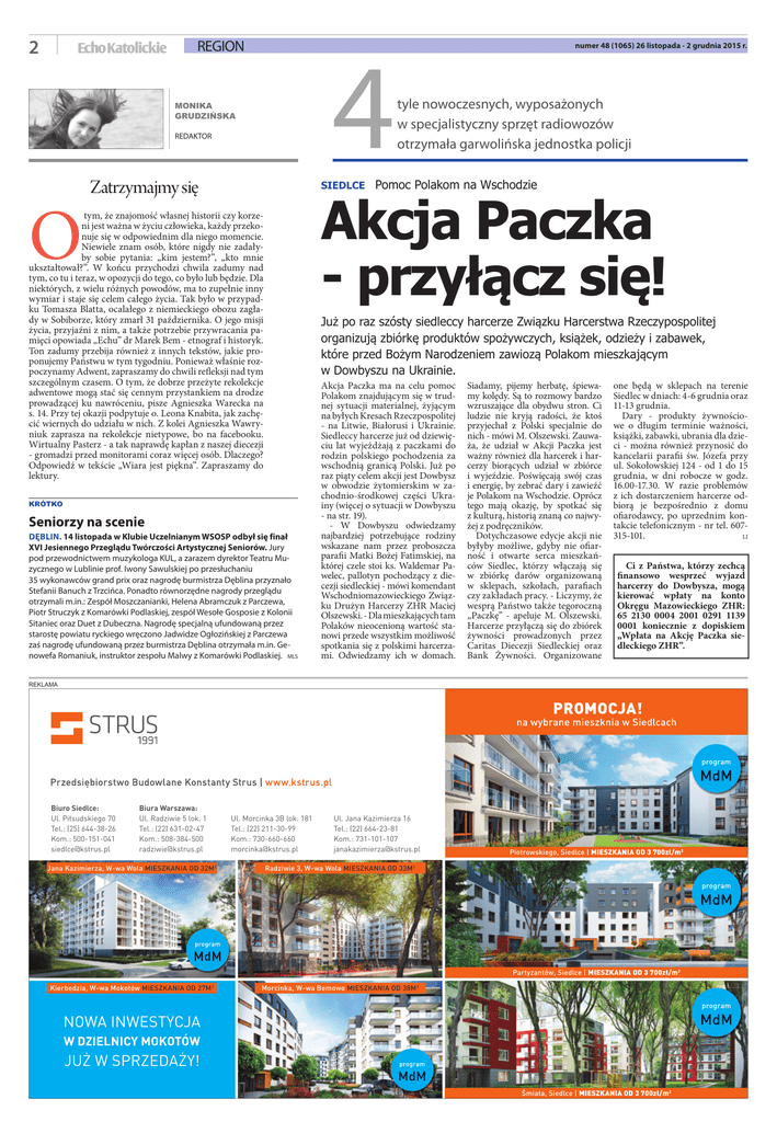 2 EchoKatolickie 4 region monIKa gRUDZIŃsKA reDAktor O Zatrzymajmy się SIEDLCE numer 48 (1065) 26 listopada - 2 grudnia 2015 r. tyle nowoczesnych, wyposażonych w specjalistyczny sprzęt radiowozów otrzymała garwolińska jednostka policji Pomoc Polakom na Wschodzie akcja Paczka - przyłącz się! tym, że znajomość własnej historii czy korzeni jest ważna w życiu człowieka, każdy przekonuje się w odpowiednim dla niego momencie. Niewiele znam osób, które nigdy nie zadałyby sobie pytania: „kim jestem?”, „kto mnie ukształtował?”. W końcu przychodzi chwila zadumy nad tym, co tu i teraz, w opozycji do tego, co było lub będzie. Dla niektórych, z wielu różnych powodów, ma to zupełnie inny wymiar i staje się celem całego życia. Tak było w przypadku Tomasza Blatta, ocalałego z niemieckiego obozu zagłady w Sobiborze, który zmarł 31 października. O jego misji życia, przyjaźni z nim, a także potrzebie przywracania pamięci opowiada „Echu” dr Marek Bem - etnograf i historyk. Ton zadumy przebija również z innych tekstów, jakie proponujemy Państwu w tym tygodniu. Ponieważ właśnie rozpoczynamy Adwent, zapraszamy do chwili refleksji nad tym szczególnym czasem. O tym, że dobrze przeżyte rekolekcje adwentowe mogą stać się cennym przystankiem na drodze prowadzącej ku nawróceniu, pisze Agnieszka Warecka na s. 14. Przy tej okazji podpytuje o. Leona Knabita, jak zachęcić wiernych do udziału w nich. Z kolei Agnieszka Wawryniuk zaprasza na rekolekcje nietypowe, bo na facebooku. Wirtualny Pasterz - a tak naprawdę kapłan z naszej diecezji - gromadzi przed monitorami coraz więcej osób. Dlaczego? Odpowiedź w tekście „Wiara jest piękna”. Zapraszamy do lektury. Już po raz szósty siedleccy harcerze Związku Harcerstwa Rzeczypospolitej organizują zbiórkę produktów spożywczych, książek, odzieży i zabawek, które przed Bożym Narodzeniem zawiozą Polakom mieszkającym w Dowbyszu na Ukrainie. KrótKo Seniorzy na scenie Dęblin. 14 listopada w Klubie Uczelnianym WSOSP odbył się finał XVi Jesiennego Przeglądu Twórczości artystycznej Seniorów. Jury pod przewodnictwem muzykologa kUL, a zarazem dyrektor teatru Muzycznego w Lublinie prof. iwony sawulskiej po przesłuchaniu 35 wykonawców grand prix oraz nagrodę burmistrza Dęblina przyznało stefanii Banuch z trzcińca. ponadto równorzędne nagrody przeglądu otrzymali m.in.: Zespół Moszczanianki, helena Abramczuk z parczewa, piotr struczyk z komarówki podlaskiej, zespół wesołe gosposie z kolonii sitaniec oraz Duet z Dubeczna. nagrodę specjalną ufundowaną przez starostę powiatu ryckiego wręczono Jadwidze ogłozińskiej z parczewa zaś nagrodę ufundowaną przez burmistrza Dęblina otrzymała m.in. genowefa romaniuk, instruktor zespołu Malwy z komarówki podlaskiej. MLs Akcja Paczka ma na celu pomoc Polakom znajdującym się w trudnej sytuacji materialnej, żyjącym na byłych Kresach Rzeczpospolitej - na Litwie, Białorusi i Ukrainie. Siedleccy harcerze już od dziewięciu lat wyjeżdżają z paczkami do rodzin polskiego pochodzenia za wschodnią granicą Polski. Już po raz piąty celem akcji jest Dowbysz w obwodzie żytomierskim w zachodnio-środkowej części Ukrainy (więcej o sytuacji w Dowbyszu - na str. 19). - W Dowbyszu odwiedzamy najbardziej potrzebujące rodziny wskazane nam przez proboszcza parafii Matki Bożej Fatimskiej, na której czele stoi ks. Waldemar Pawelec, pallotyn pochodzący z diecezji siedleckiej - mówi komendant Wschodniomazowieckiego Związku Drużyn Harcerzy ZHR Maciej Olszewski. - Dla mieszkających tam Polaków nieocenioną wartość stanowi przede wszystkim możliwość spotkania się z polskimi harcerzami. Odwiedzamy ich w domach. Siadamy, pijemy herbatę, śpiewamy kolędy. Są to rozmowy bardzo wzruszające dla obydwu stron. Ci ludzie nie kryją radości, że ktoś przyjechał z Polski specjalnie do nich - mówi M. Olszewski. Zauważa, że udział w Akcji Paczka jest ważny również dla harcerek i harcerzy biorących udział w zbiórce i wyjeździe. Poświęcają swój czas i energię, by zebrać dary i zawieźć je Polakom na Wschodzie. Oprócz tego mają okazję, by spotkać się z kulturą, historią znaną co najwyżej z podręczników. Dotychczasowe edycje akcji nie byłyby możliwe, gdyby nie ofiarność i otwarte serca mieszkańców Siedlec, którzy włączają się w zbiórkę darów organizowaną w sklepach, szkołach, parafiach czy zakładach pracy. - Liczymy, że wesprą Państwo także tegoroczną „Paczkę” - apeluje M. Olszewski. Harcerze przyłączą się do zbiórek żywności prowadzonych przez Caritas Diecezji Siedleckiej oraz Bank Żywności. Organizowane one będą w sklepach na terenie Siedlec w dniach: 4-6 grudnia oraz 11-13 grudnia. Dary - produkty żywnościowe o długim terminie ważności, książki, zabawki, ubrania dla dzieci - można również przynosić do kancelarii parafii św. Józefa przy ul. Sokołowskiej 124 - od 1 do 15 grudnia, w dni robocze w godz. 16.00-17.30. W razie problemów z ich dostarczeniem harcerze odbiorą je bezpośrednio z domu ofiarodawcy, po uprzednim kontakcie telefonicznym - nr tel. 607LI 315-101. Ci z Państwa, którzy zechcą finansowo wesprzeć wyjazd harcerzy do Dowbysza, mogą kierować wpłaty na konto Okręgu Mazowieckiego ZHR: 65 2130 0004 2001 0291 1139 0001 koniecznie z dopiskiem „Wpłata na Akcję Paczka siedleckiego ZHR”. Reklama PROMOCJA! na wybrane mieszknia w Siedlcach Biuro Siedlce: 9P4MúWYHWOMIKS 8IP /SQ WMIHPGI$OWXVYWTP Biura Warszawa: 9P6EH^M[MIPSO 8IP /SQ VEH^M[MI$OWXVYWTP Jana Kazimierza, W-wa Wola MIESZKANIA OD 32M 9P1SVGMROE&PSO 8IP /SQ QSVGMROE$OWXVYWTP 2 9P.ERE/E^MQMIV^E 8IP /SQ NEREOE^MQMIV^E$OWXVYWTP Radziwie 3, W-wa Wola MIESZKANIA OD 33M Piotrowskiego, Siedlce | MIESZKANIA OD 3 700zł/m2 2 Partyzantów, Siedlce | MIESZKANIA OD 3 700zł/m2 Kierbedzia, W-wa Mokotów MIESZKANIA OD 27M2 Morcinka, W-wa Bemowo MIESZKANIA OD 38M2 NOWA INWESTYCJA W DZIELN