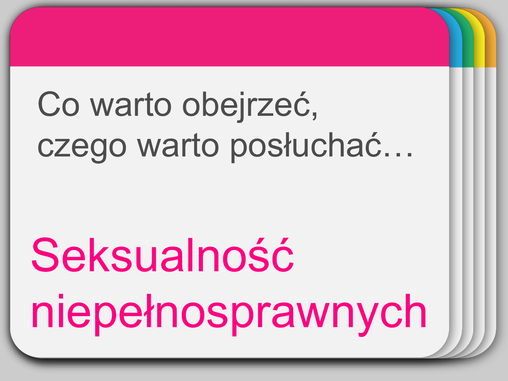 WINTER Co warto obejrzeć, Template czego warto posłuchać… Seksualność niepełnosprawnych WINTER Template Filmy Sesje (2012) http://www.filmweb.pl/film/Sesje-2012-524303 WINTER Template Filmy dokumentalne, reportaże 'The Last Taboo!' - 21st Century Sex And Disability https://www.youtube.com/watch?v=X8G09fxKF_I&t=84s&index=9&list=PLDD_yaq0m31gomhyf_Ew_UGVxZ29kaBoX Scarlet Road: A Sex Workers Journey https://www.youtube.com/watch?v=CXGqeTjUPz4&t=2s&index=10&list=PLDD_yaq0m31gomhyf_Ew_UGVxZ29kaBoX WINTER Wykłady, dyskusje Template Seks niepełnosprawnych [Bez tabu] Dr Andrzej Depko https://www.youtube.com/watch?v=RfGRJhbSXFE&t=311s&index=12&list=PLDD_yaq0m31gomhyf_Ew_UGVxZ29kaBoX WINTER Czy niepełnosprawny chłopak będzie Template ciężarem? https://www.youtube.com/watch?v=4TAfTYCCCwk&index=58&list=PLDD_yaq0m31jrXOIbPBGH6m8d5A9dsiBW&t=196s Seks i niepełnosprawność dr Remigiusz Kijak https://www.youtube.com/watch?v=ymFA71sdv0E&index=51&list=PLDD_yaq0m31jrXOIbPBGH6m8d5A9dsiBW&t=130s Po naszej stronie: Seksualność osób niepełnosprawnych https://www.youtube.com/watch?v=sm52dEXQFKg&index=48&list=PLDD_yaq0m31jrXOIbPBGH6m8d5A9dsiBW WINTER Do posłuchania Template Seks na wózku i o kulach https://www.youtube.com/watch?v=NJPvJ6Gpo1s&t=2001s&index=11&list=PLDD_yaq0m31gomhyf_Ew_UGVxZ29kaBoX WINTER Na bieżąco Template (i archiwum) Facebook https://www.facebook.com/integracja/?fref=ts YouTube Anioł na resorach https://www.youtube.com/user/AniolNaResorach YouTube Anioł na resorach Seksualność osób z niepełnosprawnością część I (i kolejne) https://www.youtube.com/watch?v=PzRCACq-BWI&index=49&list=PLDD_yaq0m31jrXOIbPBGH6m8d5A9dsiBW&t=477s YouTube Anioł na resorach Vlog - Miłość kontra niepełnosprawność https://www.youtube.com/watch?v=PzRCACq-BWI&index=49&list=PLDD_yaq0m31jrXOIbPBGH6m8d5A9dsiBW&t=477s Tą prezentację możemy tworzyć razem! Chciałbyś podzielić się czymś, co powinno się tu znaleźć? Wyślij do mnie e-mail [email protected]
