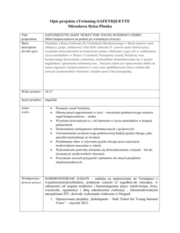 Opis projektu eTwinning-SAFETIQUETTE Mirosława Dyka-Płonka Title proposition Short description (krótki opis) SAFETIQUETTE (SAFE TICKET FOR YOUNG INTERNET USERS) (Bilet bezpieczeństwa na podróż po wirtualnym świecie) Wspólnie z klasą I (obecnie II) Technikum Mechanicznego w Brnie (prawie sami chłopcy), grupa „kulturowa” klas Ib/Ic (obecnie II - prawie same dziewczyny) wymienia doświadczenia na temat korzystania z Internetu i jego roli w codziennym życiu nastolatków w Polsce i Czechach. Poznajemy zasady Netykiety oraz bezpiecznego korzystania z Internetu, doskonalimy komunikowanie się w języku angielskim i sprawności informatyczne. Naszym celem jest opracowanie ulotki na temat zagrożeń i bezpieczeństwa w sieci oraz opublikowanie listu z radami dla nowych użytkowników Internetu z krajów poza Unią Europejską. Wiek uczniów 16-17 Język projektu angielski Aims: (cele) Workprocess: (proces pracy) Poznanie zasad Netykiety Obrona przed zagrożeniami w sieci – stworzenie podstawowego zestawu reguł bezpieczeństwa – ulotka Wymiana doświadczeń n.t. roli Internetu w życiu nastolatków w krajach partnerskich Doskonalenie umiejętności informatycznych i językowych Uświadomienie uczniom wagi podstawowej funkcji języka obcego, jako sposobu komunikacji ze światem Przełamanie obaw w używaniu języka obcego poza sztucznym środowiskiem nauczania w szkole Wykształcenie potrzeby dzielenia się doświadczeniem z innymi – list do nieznanych użytkowników Internetu Pozyskanie nowych przyjaciół i partnerów do innych projektów międzynarodowych HARMONOGRAM ZADAŃ – zadania są umieszczane na Twinspace z wyjaśnieniem/przykładem, podanym czasem (2 tygodnie-do miesiąca, w zależności od stopnia trudności i harmonogramu pracy szkół-święta, ferie, wycieczki, egzaminy) i datą zakończenia realizacji , rekomendowanymi narzędziami ITC, dowody wykonania widoczne w blogach 1. Opracowanie projektu „Safetiquette – Safe Ticket for Young Internet Users” – styczeń 2012 2. Pozyskanie partnera i ustalenie zasad współpracy–luty 2012 3. Akceptacja projektu / uzyskanie Certyfikatu – marzec 2012 4. Realizacja zadań wspólnie z uczniami obu krajów – marzec – czerwiec 2012: Tworzenie profili uczestników na Twinspace, poszukiwanie partnerów (uczniowie pracują w parach dziewczyna-chłopak) Tworzenie pytań do Ankiety na temat korzystania z Internetu Dyskusja nad ostateczną wersją Ankiety Przeprowadzenie Ankiety wśród uczniów partnerskich szkół i znajomych obcokrajowców z portali społecznościowych Opracowanie i publikacja wyników Ankiety Poznanie zasad i ćwiczenie stosowania języka internetowego nastolatków Tworzenie komiksów na temat niebezpieczeństw korzystania z Internetu Stworzenie raportu prac nad projektem w formie prezentacji multimedialnej 5. Przerwa wakacyjna lipiec-sierpień 2012 6. Realizacja zadań wspólnie z uczniami obu krajów – wrzesień 2012 – styczeń 2013: Rozgrzewka – pocztówka / wspomnienie z wakacji Zasady Netykiety – wymiana wiadomości i opinii Poszukiwanie anglojęzycznych stron internetowych, związanych z zagrożeniami i sposobami ochrony – wymiana linków Gromadzenie słownictwa – opracowanie w formie 2 map mind-mapping: zagrożenia / ochrona przed zagrożeniami w Internecie Konsolidacja słownictwa – praca z tabelą matching – dopasowanie ostrzeżeń / rad do rezultatów /powodów Zasady pisania ulotki – wymogi formalne krótkiego tekstu użytkowego (Matura) / przypomnienie wyrażeń związanych z udzielaniem rad i czasowników modalnych do przewidywania przyszłości Opracowanie ulotki „Safetiquette- Basic tips for young Internet users” Zasady pisania listu – wymogi formalne dla dłuższej formy użytkowej (Matura) Poszukiwanie stron internetowych szkół spoza UE (n.p. Tunezja, Egipt, Libia), nawiązanie kontaktu celem opublikowania listu do rówieśników-użytkowników Internetu Zredagowanie i opublikowanie listu do młodych użytkowników Internetu w krajach poza Unią Europejską Prezentacja i omówienie rezultatów projektu (planowane spotkanie warsztatowo-podsumowujące w Czechach) METODY WSPÓŁPRACY 1. Opracowanie Projektu i znalezienie partnera-strona polska 2. Rejestracja Projektu – strona czeska 3. Szczegółowy Plan Pracy, określenie czasu realizacji, ilości i sposobu pracy uczniów(pary polsko-czeskie lub pary klasowe) – wspólnie 4. Ustalenie zgodności z programem kształcenia – wspólnie 5. Podział zadań – wspólnie (większość wykonują obie strony, niektóre osobno - n.p. opracowanie i publikacja wyników Ankiety n.t. bezpiecznego korzystania z Internetu-strona czeska; opracowanie multimedialne Raportu z I i II części realizacji – strona polska; stworzenie strony internetowej Projektu-strona czeska) 6. Omówienie możliwości technicznych i dostosowanie metod pracy (polscy uczniowie wykonują zadania w domu po omówieniu ich w szkole; czescyczęściowo w czasie zajęć lekcyjnych z informatyki, częściowo w czasie wolnym w szkole, rzadziej w domu, ze względu na zakwaterowanie w Internacie) 7. Współpraca z nauczycielami informatyki – strona czeska – ciagle; strona polska-w miarę potrzeby (n.p. szkolną część Ankiety n.t. bezpieczeństwa przeprowadzono na zajęciach Informatyki we wszystkich klasach pierwszych i drugich pod kierunkiem uczniów-uczestników Projektu) 8. Kontrola dowodów wykonania zadań uczniów– obie strony na bieżąco 9. Nagradzanie – oceny cząstkowe z j. angielskiego / informatyki SPOSOBY EWALUACJI / PREZENTACJI EFEKTÓW 1. Opinie uczestników n.t. pracy z partnerem -na bieżąco – obie strony aktywizują spóźnialskich, czasami z pomocą nauczycieli 2. Dyskusja nad użytecznością materiałów – niektóre archiwizujemy do publikacji na stronie projektu, wszystkie dostępne do wglądu na Twinspace 3. Umieszczenie informacji ogólnej, sprawozdania z realizacji oraz linku do podglądu Twinspace dla ucznió