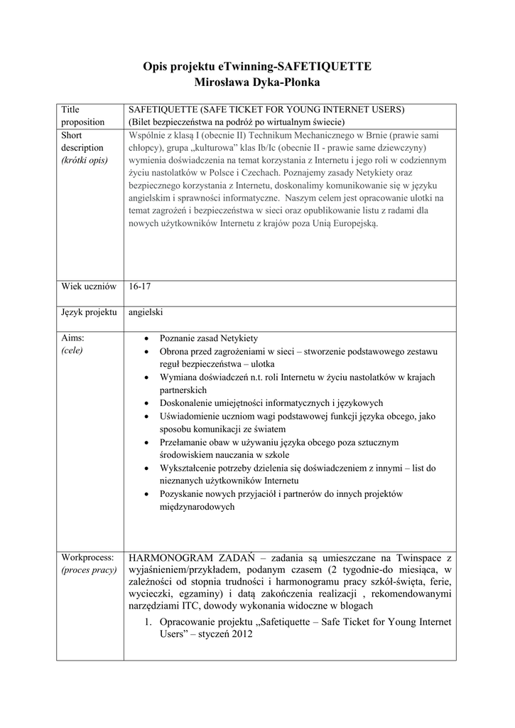 Opis projektu eTwinning-SAFETIQUETTE Mirosława Dyka