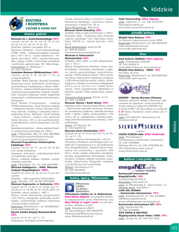 KULTURA I ROZRYWKA CULTURE & GOING OUT muzea, galerie Muzeum im. J. Dunin-Borkowskiego: 50% Czynne: wt–sb 10–16, nd 10–15 (V–IX); wt–sb 10–15, nd 10–13 (X–IV). Siedziba: zajazd z pocz¹tku XIX w. Wystawa: Kolekcja J. Dunin-Borkowskiego (1908–1992) – malarstwo polskie i europejskie z XVI i XX w., sztuka zdobnicza – militaria, porcelana, szk³o, wyroby konwisarskie, zegary, meble, numizmaty, starodruki i archiwalia, gabinet gen. W³. Sikorskiego. Kroœniewice, pl. Wolnoœci 1 tel. 024 2523347 Centralne Muzeum W³ókiennictwa: 50% Czynne: wt–pt 9–16, sb–nd 11–16, pt wstêp bezp³atny. Siedziba: Bia³a Fabryka, okaza³y kompleks klasycystycznych budynków architektury przemys³owej. Zbudowany w latach 1835– 37 przez L. Gayera mieœci³ pierwsz¹ w £odzi mechaniczn¹ przêdzalniê i tkalniê. Dzia³alnoœæ muzeum obejmuje ca³oœæ zagadnieñ zwi¹zanych z w³ókienniczym procesem produkcyjnym. Dzia³ Tkaniny Przemys³owej – kolekcja 70 000 eksponatów. Dzia³ Tkaniny Ludowej – unikatowe tkaniny: kilimy, dywany, dzianiny, koronki, kolekcje z obszarów Rzeczpospolitej (Litwa, Bia³oruœ). Dzia³ Odzie¿y – stroje kobiece i mêskie oraz akcesoria mody od pocz. XIX w. po wspó³czesnoœæ, a najciekawsze z nich to eksponaty z lat 20. XX w. Najwiêksza kolekcja – zbiory polskiej tkaniny artystycznej powsta³ej po 1945 r. £ódŸ, Piotrkowska 282, tel. 042 6832684 [email protected] www.muzeumwlokiennictwa.pl Muzeum Przyrodnicze Uniwersytetu £ódzkiego: 50% Czynne: wt–pt 10–17, sb–nd 10–13.30, czw wstêp bezp³atny. Wystawa: „Sieæ ¿ycia – zró¿nicowanie form w Królestwie zwierz¹t”. Zbiory: kolekcje ssaków, ptaków, motyli, szkielety zwierz¹t. £ódŸ, Kiliñskiego 101, tel. 042 6655490 Muzeum Radogoszcz – Oddz. Muzeum Tradycji Niepodleg³oœci: 100% Czynne: wt–pt 9–16, sb, nd 10–15, pn nieczynne. Siedziba – by³e wiêzienie hitlerowskie. £ódŸ, Zgierska 147, tel.042 6553666 Muzeum Regionalne w Radomsku: 50% Czynne: wt 12–15.30, œr 12–16.30, czw 11– 16.30, pt 12–16.30, sb 10–16.30, nd 9–15. Siedziba: ratusz miejski z 1857 r. Zbiory: cenne dokumenty pergaminowe z XV–XVII w., fotografie, archiwalia, archeologia, numizmatyka, kolekcja malarstwa „Poczet Królów polskich”. Radomsko, Narutowicza 1, tel. 044 6835651 [email protected] Baszta Zamku Ksi¹¿¹t Mazowieckich: 50% Czynne: VI–IX sb i nd 11–15. Ekspozycje: tematyka archeologiczna. Zamek stanowi³ jedn¹ z twierdz z czasów Kazimierza Wielkiego. Czêœciowo zrekonstruowany w latach 50. XX w. Rawa Mazowiecka, Basztowa Muzeum Ziemi Rawskiej: 50% Siedziba: willa w stylu dworkowym z 1930 r. Wystawy sta³e: „Tradycyjna izba ch³opska regionu rawskiego” tzw. izba bia³a z prze³omu XIX/XX w., salonik dworski z XIX/ XX w. Rawa Mazowiecka, £owicka 26 tel. 046 8144569 [email protected] Muzeum w Tomaszowie Mazowieckim: 50% Siedziba: letni pa³ac w stylu klasycystycznym z 1812 r. Zbiory: etnograficzne: tkactwo, stroje, sztuka ludowa i rzemios³o artystyczne z regionu rawsko-opoczyñskiego; przyrodnicze: ponad 10 000 okazów fauny i flory dorzecza Pilicy; historyczne: eksponaty zwi¹zane z 200-letni¹ histori¹ miasta i okolic; archeologiczne: zabytki cmentarzysk cia³opalnych od II w. p.n.e. do III w. n.e. z okolic Tomaszowa; sztuki wspó³czesnej. Biblioteka ze zbiorem ponad 7000 woluminów naukowych. Tomaszów Mazowiecki, P.O.W. 11/15 tel. 044 7244848 Muzeum Miasta i Rzeki Warty: 50% Wystawa sta³a: historia miasta Warty i okolic – dokumenty, pami¹tki cechowe, fotografie, przedmioty u¿ytkowe, sylwetki s³ynnych ludzi z Warty, meble mieszczañskie z XIX i pocz. XX w., wykopaliska z terenów obecnego zbiornika Jeziorsko oraz obrazy Z. Andrychiewicza. Warta, 20 Stycznia 26 tel. 043 8294178 Muzeum Ziemi Wieluñskiej: 50% Czynne: wt–pt 10–16 œr–czw 10–15, sb 10– 13, nd 11–15. Siedziba: klasztor bernardynek z XVII w. Wystawy w dzia³ach: archeologicznym: zabytki od 12 tysi¹clecia p.n.e. do œredniowiecza; etnograficznym: zabytki kultury materialnej wsi wieluñskiej z prze³omu XIX/ XX w., stroje, rzeŸba, malarstwo, narzêdzia, sprzêty gospodarstwa domowego; historycznym: militaria, zabytki cechowe, numizmaty, dokumenty, fotografie zwi¹zane z przesz³oœci¹ ziemi wieluñskiej. Wieluñ, Narutowicza 13 tel. 043 8434334 [email protected] teatry, opery, filharmonie Filharmonia £ódzka im. A. Rubinsteina Dwa bilety ulgowe na wszystkie koncerty organizowane przez Filharmoniê oraz dwa bilety w super cenie na cykl koncertów „M³odzi w £odzi”. £ódŸ, Narutowicza 20/22 tel. kasa biletowa: 042 6647979 [email protected] www.filharmonia.lodz.pl Teatr Powszechny: bilet ulgowy £ódŸ, Legionów 21, tel. 042 6332539 [email protected] www.teatr-powszechny.lodz.pl oœrodki kultury Miejski Dom Kultury: 10% Na imprezy organizowane przez MDK. Radomsko, BrzeŸnicka 5, tel. 044 6835255 [email protected] www.mdk.radomsko.biz kina Kino-Galeria CHARLIE: bilet ulgowy £ódŸ, Piotrkowska 203/205 tel. 042 6360314 [email protected], www.charlie.pl Miejski Dom Kultury – KINO: 10% Na bilety do kina. Radomsko, BrzeŸnicka 5, tel. 044 6835255 www.mdk.radomsko.biz ENEMEF – Nocny Maraton Filmowy Impreza cykliczna. Wiêcej informacji i g³osowanie na repertuar: www.enemef.pl Zni¿ka dotyczy wy³¹cznie ENEMEF-ów. Z Kart¹ EURO<26 dwa bilety ze zni¿k¹ do 5 z³ ka¿dy. Wysokoœæ zni¿ki zale¿y od repertuaru. £ódŸ, Kino BA£TYK, Narutowicza 20 [email protected] SILVER SCREEN £ódŸ: bilet studencki £ódŸ, Pi³sudskiego 5 Automatyczna informacja i rezerwacja: tel. 042 6395800 Obs³uga Klienta: tel. 042 6395858-63 [email protected] www.silverscreen.com.pl kultura i rozrywka – inne Kawiarenki Internetowe MegaNETcaffe: 10% [email protected] Be³chatów, Koœciuszki 23 £ódŸ, al. Pi³sudskiego 5, Silver Screen, I p. Zduñska Wola, Koœcielna 7 CAFE DEL MUNDO – Kawiarenka Internetowa: 15% £ódŸ, Piotrkowska 53, tel. 042 6336867 [email protected] www.