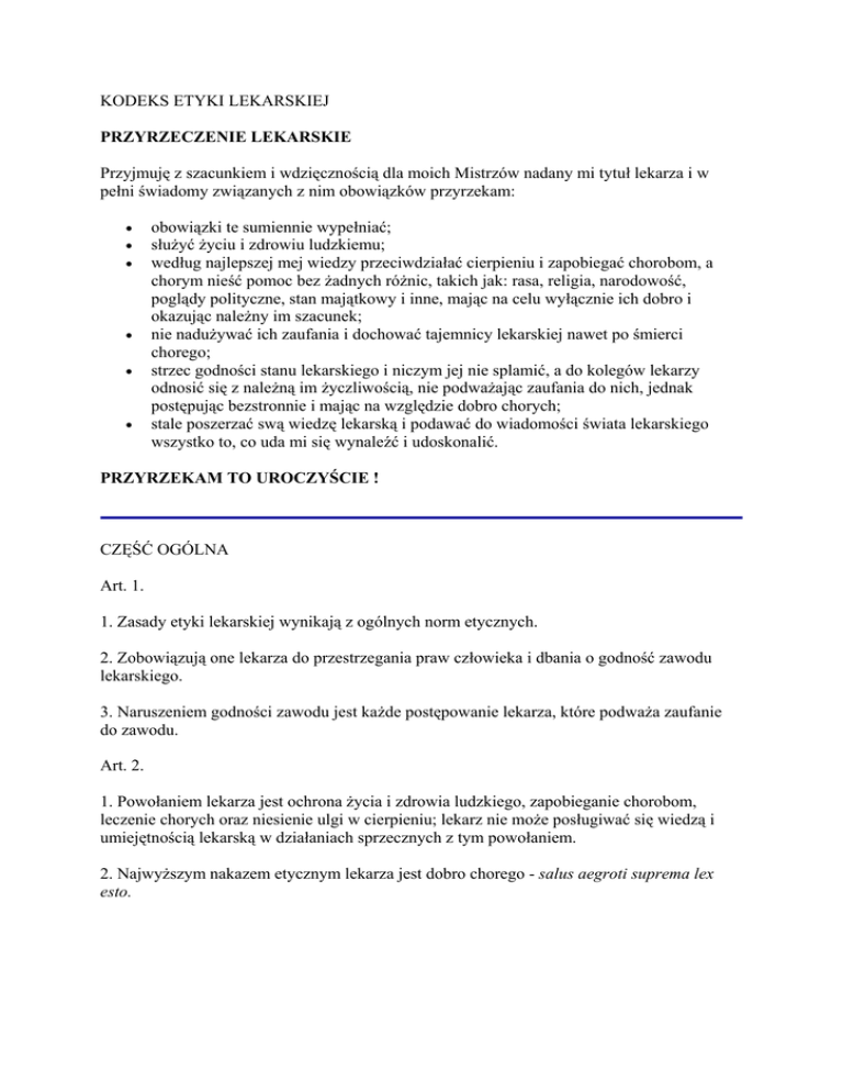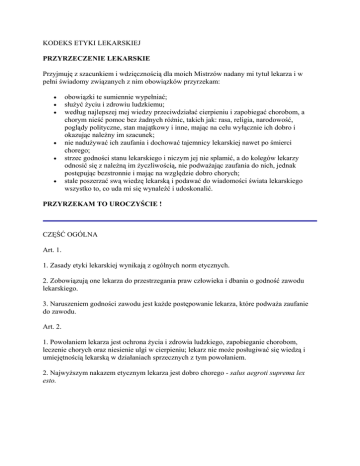 KODEKS ETYKI LEKARSKIEJ PRZYRZECZENIE LEKARSKIE Przyjmuję z szacunkiem i wdzięcznością dla moich Mistrzów nadany mi tytuł lekarza i w pełni świadomy związanych z nim obowiązków przyrzekam: • • • • • • obowiązki te sumiennie wypełniać; służyć życiu i zdrowiu ludzkiemu; według najlepszej mej wiedzy przeciwdziałać cierpieniu i zapobiegać chorobom, a chorym nieść pomoc bez żadnych różnic, takich jak: rasa, religia, narodowość, poglądy polityczne, stan majątkowy i inne, mając na celu wyłącznie ich dobro i okazując należny im szacunek; nie nadużywać ich zaufania i dochować tajemnicy lekarskiej nawet po śmierci chorego; strzec godności stanu lekarskiego i niczym jej nie splamić, a do kolegów lekarzy odnosić się z należną im życzliwością, nie podważając zaufania do nich, jednak postępując bezstronnie i mając na względzie dobro chorych; stale poszerzać swą wiedzę lekarską i podawać do wiadomości świata lekarskiego wszystko to, co uda mi się wynaleźć i udoskonalić. PRZYRZEKAM TO UROCZYŚCIE ! CZĘŚĆ OGÓLNA Art. 1. 1. Zasady etyki lekarskiej wynikają z ogólnych norm etycznych. 2. Zobowiązują one lekarza do przestrzegania praw człowieka i dbania o godność zawodu lekarskiego. 3. Naruszeniem godności zawodu jest każde postępowanie lekarza, które podważa zaufanie do zawodu. Art. 2. 1. Powołaniem lekarza jest ochrona życia i zdrowia ludzkiego, zapobieganie chorobom, leczenie chorych oraz niesienie ulgi w cierpieniu; lekarz nie może posługiwać się wiedzą i umiejętnością lekarską w działaniach sprzecznych z tym powołaniem. 2. Najwyższym nakazem etycznym lekarza jest dobro chorego - salus aegroti suprema lex esto. Art. 3. Lekarz zarówno w czasie pokoju jak i wojny, winien wypełniać swoje obowiązki z poszanowaniem człowieka bez względu na wiek, płeć, rasę, narodowość, wyznanie, przynależność społeczną, sytuację materialną, poglądy polityczne czy inne uwarunkowania. Art. 4. Dla wypełnienia swoich zadań lekarz powinien zachować swobodę działań zawodowych, zgodnie ze swoim sumieniem i współczesną wiedzą medyczną. Art. 5. Izba lekarska jest obowiązana do czuwania nad przestrzeganiem zasad etyki i deontologii lekarskiej oraz zachowaniem godności zawodu przez wszystkich członków samorządu lekarskiego a także do starań, aby przepisy prawa nie naruszały zasad etyki lekarskiej. CZĘŚĆ SZCZEGÓŁOWA Rozdział I Postępowanie lekarza wobec pacjenta Art. 6. Lekarz ma swobodę wyboru w zakresie metod postępowania, które uzna za najskuteczniejsze. Powinien jednak ograniczyć czynności diagnostyczne, lecznicze i zapobiegawcze do rzeczywiście potrzebnych choremu, zgodnych z aktualnym stanem wiedzy medycznej. Art. 7. W szczególnie uzasadnionych wypadkach lekarz może nie podjąć się lub odstąpić od leczenia chorego, z wyjątkiem przypadków nie cierpiących zwłoki. Nie podejmując albo odstępując od leczenia lekarz winien wskazać choremu inną możliwość uzyskania pomocy lekarskiej. Jakość opieki medycznej Art. 8. Lekarz powinien przeprowadzać wszelkie postępowanie diagnostyczne, lecznicze i zapobiegawcze z należytą starannością, poświęcając im niezbędny czas. Art. 9. Lekarz może podejmować leczenie jedynie po uprzednim zbadaniu pacjenta. Wyjątki stanowią nagłe sytuacje, gdy doraźna pomoc lekarska w formie porady może być udzielona wyłącznie na odległość. Art. 10. 1. Lekarz nie powinien wykraczać poza swoje umiejętności zawodowe przy wykonywaniu czynności diagnostycznych, zapobiegawczych, leczniczych i orzeczniczych. 2. Jeżeli zakres tych czynności przewyższa umiejętności lekarza, wówczas powinien się zwrócić do bardziej kompetentnego kolegi. Nie dotyczy to nagłych wypadków i ciężkich zachorowań, 3. Gdy zwłoka może zagrażać zdrowiu lub życiu chorego. Art. 11. Lekarz winien zabiegać o wykonywanie swego zawodu w warunkach, które zapewniają odpowiednią jakość opieki nad pacjentem. Poszanowanie praw pacjenta Art. 12. 1. Lekarz powinien życzliwie i kulturalnie traktować pacjentów, szanując ich godność osobistą i prawo do intymności. 2. Relacje między pacjentem, a lekarzem powinny opierać się na wzajemnym zaufaniu; dlatego pacjent powinien mieć prawo do wyboru lekarza. Art. 13. 1. Obowiązkiem lekarza jest respektowanie prawa pacjenta do świadomego udziału w podejmowaniu podstawowych decyzji lekarskich dotyczących jego zdrowia. 2. Informacja udzielona pacjentowi powinna być sformułowana w sposób dla niego zrozumiały. 3. Pacjent ma prawo zapoznać się ze stopniem ewentualnego ryzyka zabiegów diagnostycznych i leczniczych i spodziewanymi korzyściami związanymi z wykonywaniem tych zabiegów, a także z możliwościami zastosowania innego postępowania medycznego. Art. 14. Lekarz nie może wykorzystywać swego wpływu na pacjenta w innym celu niż leczniczy. Art. 15. 1. Postępowanie diagnostyczne, lecznicze i zapobiegawcze wymaga zgody pacjenta. Jeśli pacjent nie jest zdolny do świadomego wyrażenia zgody, powinien ją wyrazić przedstawiciel ustawowy bądź osoba stale opiekująca się pacjentem. 2. Wszczęcie postępowania diagnostycznego, leczniczego i zapobiegawczego bez tej zgody może być dopuszczone tylko wyjątkowo w szczególnych przypadkach zagrożenia życia lub zdrowia pacjenta albo innych osób. 3. W razie nie wyrażenia zgody na proponowane postępowanie lekarz powinien nadal, w miarę możliwości, otaczać pacjenta opieką lekarską. Art. 16. 1. Lekarz może nie informować pacjenta o stanie jego zdrowia bądź o leczeniu, jeśli pacjent wyraża takie życzenie. Pacjent może także wskazać osoby, które w jego imieniu będą porozumiewały się z lekarzem. Informowanie rodziny, o ile to jest możliwe, powinno być uzgodnione z chorym. 2. W przypadku chorego nieprzytomnego lekarz może udzielić, dla dobra chorego, niezbędnych informacji osobie, co do której jest przekonany, 