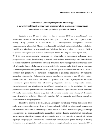 Warszawa, dnia 24 czerwca 2015 r. Stanowisko Głównego Inspektora Sanitarnego w sprawie kwalifikacji zawodowych wymaganych od osób przeprowadzających szczepienia ochronne po dniu 31 grudnia 2015 roku Zgodnie z art. 17 ust. 6 ustawy z dnia 5 grudnia 2008 r. o zapobieganiu oraz zwalczaniu zakażeń i chorób zakaźnych u ludzi (Dz.U. z 2013 r. poz. 947, z póżn. zm.) zwanej dalej „ustawa o z.o.z.z.i ch.z.u l.” - obowiązkowe szczepienia ochronne przeprowadzają lekarze lub felczerzy, pielęgniarki, położne i higienistki szkolne posiadający kwalifikacje określone w rozporządzeniu Ministra Zdrowia z dnia 18 sierpnia 2011 r. w sprawie obowiązkowych szczepień ochronnych (Dz.U. Nr 182 poz. 1086, z późn. zm.). W § 6 tego rozporządzenia wskazano, że obowiązkowe szczepienia ochronne mogą przeprowadzać osoby, jeżeli odbyły w ramach doskonalenia zawodowego kurs lub szkolenie w zakresie szczepień ochronnych i uzyskały dokument potwierdzający ukończenie tego kursu lub szkolenia, lub uzyskały specjalizację w dziedzinie, w przypadku której ramowy program kształcenia podyplomowego określony na podstawie przepisów o zawodach lekarza i lekarza dentysty lub przepisów o zawodach pielęgniarki i położnej obejmował problematykę szczepień ochronnych. Jednocześnie przepis przejściowy zawarty w art. 67 pkt 3 ustawy o z.o.z.z.i ch.z.u l. umożliwia do dnia 31 grudnia 2015 roku wykonywanie szczepień ochronnych przez lekarzy lub felczerów pielęgniarki, położne i higienistki szkolne nieposiadających tak określonych kwalifikacji zawodowych, o ile posiadają 2,5 letnią praktykę w zakresie przeprowadzania szczepień ochronnych. Tym samym z dniem 1 stycznia 2016 roku szczepienia ochronne mogą być wykonywane jedynie przez lekarzy lub felczerów oraz pielęgniarki, położne i higienistki szkolne, którzy posiadają kwalifikacje zawodowe określone w ww. rozporządzeniu. Zawarte w ustawie o z.o.z.z.i ch.z.u l. przepisy określające wymóg posiadania przez osoby przeprowadzające szczepienia ochronne odpowiednich i potwierdzonych stosownymi dokumentami kwalifikacji zawodowych uzyskanych w ramach kształcenia podyplomowego i specjalizacji nie określają jednakże szczegółowo rodzaju kursów i szkoleń lub specjalizacji wymaganych od osób wykonujących szczepienia lecz w tym zakresie w całości odsyłają do regulacji dotyczących uzyskiwania kwalifikacji zawodowych przez lekarzy i lekarzy dentystów oraz pielęgniarki i położne zawartych w przepisach ustawy dnia 5 grudnia 1996 r. o zawodzie lekarza i lekarza dentysty (Dz.U. z 2015 r. poz. 464) oraz ustawy z dnia 15 lipca 2011 r. o zawodach pielęgniarki i położnej (Dz.U. z 2014 r. poz. 1435 z późn. zm.). Należy zauważyć, że szczegółowe regulacje prawne dotyczące kształcenia podyplomowego i specjalizacji zawodowych zawarte w tych ustawach, a także określające zakres wymaganych szkoleń i kursów doskonalących i dokumentów potwierdzających ich odbycie oraz same programy szkoleń, kursów i specjalizacji na przestrzeni lat ulegały nieustannym zmianom. Jednocześnie ww. ustawy regulujące wykonywanie zawodu lekarza i lekarza dentysty oraz zawodów pielęgniarki i położnej zawierają przepisy przejściowe oraz przepisy z zakresu koordynacji, które w konsekwencji z mocy prawa lub w wyniku rozstrzygnięć dokonanych przez właściwe organy sprawujące nadzór nad kwalifikacjami zawodowymi lekarzy, pielęgniarek i położnych prowadzą do uznawania za równorzędne z obecnie uzyskiwanymi kwalifikacji, specjalizacji i tytułów zawodowych uzyskanych na podstawie wcześniej obowiązujących przepisów, uzyskanych w innym przewidzianym prawem trybie lub uzyskanych w innych krajach. Tym samym w opinii Głównego Inspektora Sanitarnego uznanie kwalifikacji zawodowych uzyskanych na podstawie wcześniej obowiązujących przepisów lub uzyskanych w innym przewidzianym prawem trybie lub w innych krajach - za równorzędne z uzyskiwanymi w wyniku specjalizacji, kursów i szkoleń prowadzonych na podstawie obecnie obowiązujących przepisów, oznacza, że obecnie osoby, które wcześniej uzyskały kwalifikacje zawodowe obecnie uznawane za równorzędne z uzyskiwanymi obecnie, również posiadają kwalifikacje zawodowe wystarczające do wykonywania szczepień ochronnych i kwalifikacje te nie powinny być kwestionowane przez organy Państwowej Inspekcji Sanitarnej. Ustawa z dnia 14 marca 1985 r. o Państwowej Inspekcji Sanitarnej (Dz.U. z 2011 r. poz. 212, z późn.zm.) oraz inne ustawy nie przyznają organom Państwowej Inspekcji Sanitarnej kompetencji do wszczynania i prowadzenia postępowań administracyjnych w sprawie uznania za niedostateczne kwalifikacji zawodowych osób wykonujących szczepienia ochronne. Uregulowanie przez ustawodawcę rodzaju kwalifikacji zawodowych wymaganych od osób (lekarzy lub felczerów pielęgniarki, położne i higienistki szkolne) wykonujących szczepienia ochronne w ustawie o z.o.z.z.i ch.z.u l. nie stanowi bowiem przesłanki wystarczającej dla stwierdzenia posiadania przez organy Państwowej Inspekcji Sanitarnej takich kompetencji bądź do sprawowania jakichkolwiek form nadzoru administracyjnego nad kwalifikacjami osób wykonujących szczepienia ochronne. Kompetencje do wyrażania opinii i rozstrzygania w tym zakresie posiadają bowiem wyłącznie odpowiednie organy samorządów zawodowych lekarzy oraz pielęgniarek i położnych. W art. 5 ustawy z dnia 2 grudnia 2009 r. o izbach lekarskich (Dz.U. z 2015 r. poz. 651) wśród zadań samorządu lekarzy zostały bowiem wymienione jego następujące zadania: sprawowanie pieczy nad należytym i sumiennym wykonywaniem zawodu, przyznawanie prawa wykonywania zawodu oraz uznawanie kwalifikacji zawodowych osób będących obywatelami Unii Europejskiej zamierzających wykonywać zawód lekarza na terytorium Rzeczypospolitej Polskiej, prowadzenie i udział w organizowaniu doskonalenia zawodowego lekarzy, prowadzenie postępowań w przed