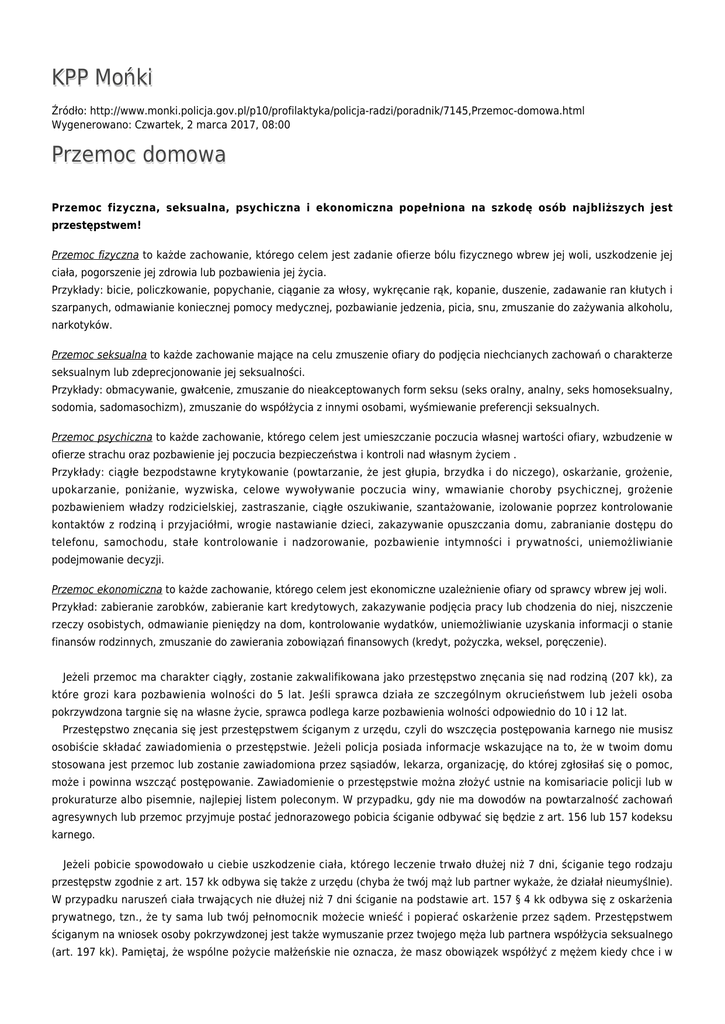 KPP Mońki Źródło: http://www.monki.policja.gov.pl/p10/profilaktyka/policja-radzi/poradnik/7145,Przemoc-domowa.html Wygenerowano: Czwartek, 2 marca 2017, 08:00 Przemoc domowa Przemoc fizyczna, seksualna, psychiczna i ekonomiczna popełniona na szkodę osób najbliższych jest przestępstwem! Przemoc fizyczna to każde zachowanie, którego celem jest zadanie ofierze bólu fizycznego wbrew jej woli, uszkodzenie jej ciała, pogorszenie jej zdrowia lub pozbawienia jej życia. Przykłady: bicie, policzkowanie, popychanie, ciąganie za włosy, wykręcanie rąk, kopanie, duszenie, zadawanie ran kłutych i szarpanych, odmawianie koniecznej pomocy medycznej, pozbawianie jedzenia, picia, snu, zmuszanie do zażywania alkoholu, narkotyków. Przemoc seksualna to każde zachowanie mające na celu zmuszenie ofiary do podjęcia niechcianych zachowań o charakterze seksualnym lub zdeprecjonowanie jej seksualności. Przykłady: obmacywanie, gwałcenie, zmuszanie do nieakceptowanych form seksu (seks oralny, analny, seks homoseksualny, sodomia, sadomasochizm), zmuszanie do współżycia z innymi osobami, wyśmiewanie preferencji seksualnych. Przemoc psychiczna to każde zachowanie, którego celem jest umieszczanie poczucia własnej wartości ofiary, wzbudzenie w ofierze strachu oraz pozbawienie jej poczucia bezpieczeństwa i kontroli nad własnym życiem . Przykłady: ciągłe bezpodstawne krytykowanie (powtarzanie, że jest głupia, brzydka i do niczego), oskarżanie, grożenie, upokarzanie, poniżanie, wyzwiska, celowe wywoływanie poczucia winy, wmawianie choroby psychicznej, grożenie pozbawieniem władzy rodzicielskiej, zastraszanie, ciągłe oszukiwanie, szantażowanie, izolowanie poprzez kontrolowanie kontaktów z rodziną i przyjaciółmi, wrogie nastawianie dzieci, zakazywanie opuszczania domu, zabranianie dostępu do telefonu, samochodu, stałe kontrolowanie i nadzorowanie, pozbawienie intymności i prywatności, uniemożliwianie podejmowanie decyzji. Przemoc ekonomiczna to każde zachowanie, którego celem jest ekonomiczne uzależnienie ofiary od sprawcy wbrew jej woli. Przykład: zabieranie zarobków, zabieranie kart kredytowych, zakazywanie podjęcia pracy lub chodzenia do niej, niszczenie rzeczy osobistych, odmawianie pieniędzy na dom, kontrolowanie wydatków, uniemożliwianie uzyskania informacji o stanie finansów rodzinnych, zmuszanie do zawierania zobowiązań finansowych (kredyt, pożyczka, weksel, poręczenie). Jeżeli przemoc ma charakter ciągły, zostanie zakwalifikowana jako przestępstwo znęcania się nad rodziną (207 kk), za które grozi kara pozbawienia wolności do 5 lat. Jeśli sprawca działa ze szczególnym okrucieństwem lub jeżeli osoba pokrzywdzona targnie się na własne życie, sprawca podlega karze pozbawienia wolności odpowiednio do 10 i 12 lat. Przestępstwo znęcania się jest przestępstwem ściganym z urzędu, czyli do wszczęcia postępowania karnego nie musisz osobiście składać zawiadomienia o przestępstwie. Jeżeli policja posiada informacje wskazujące na to, że w twoim domu stosowana jest przemoc lub zostanie zawiadomiona przez sąsiadów, lekarza, organizację, do której zgłosiłaś się o pomoc, może i powinna wszcząć postępowanie. Zawiadomienie o przestępstwie można złożyć ustnie na komisariacie policji lub w prokuraturze albo pisemnie, najlepiej listem poleconym. W przypadku, gdy nie ma dowodów na powtarzalność zachowań agresywnych lub przemoc przyjmuje postać jednorazowego pobicia ściganie odbywać się będzie z art. 156 lub 157 kodeksu karnego. Jeżeli pobicie spowodowało u ciebie uszkodzenie ciała, którego leczenie trwało dłużej niż 7 dni, ściganie tego rodzaju przestępstw zgodnie z art. 157 kk odbywa się także z urzędu (chyba że twój mąż lub partner wykaże, że działał nieumyślnie). W przypadku naruszeń ciała trwających nie dłużej niż 7 dni ściganie na podstawie art. 157 § 4 kk odbywa się z oskarżenia prywatnego, tzn., że ty sama lub twój pełnomocnik możecie wnieść i popierać oskarżenie przez sądem. Przestępstwem ściganym na wniosek osoby pokrzywdzonej jest także wymuszanie przez twojego męża lub partnera współżycia seksualnego (art. 197 kk). Pamiętaj, że wspólne pożycie małżeńskie nie oznacza, że masz obowiązek współżyć z mężem kiedy chce i w każdej formie, jakiej sobie życzy. Powinnaś wiedzieć, że przestępstwem jest także grożenie popełnieniem przestępstwa (mąż grozi, że zabije ciebie lub dzieci, podpali dom) na twoją szkodę lub szkodę osób najbliższych (art.190 kk). Przestępstwo to jest również ścigane na wniosek. Pamiętaj o swoich prawach Powinnaś wiedzieć o tym, że w postępowaniu przygotowawczym nie musisz biernie czekać na rozstrzygnięcie w twojej sprawie. Jesteś stroną toczącego się postępowania i przysługują ci określone prawa, z których możesz i powinnaś korzystać, aby zwiększyć szanse na ukaranie sprawcy. Masz między innymi prawo do: ● poszanowania twojej godności i prawa do prywatności w trakcie toczącego się postępowania m.in. poprzez zapewnienie ci intymności w czasie przesłuchania, takiego zadawania pytań,które uwzględniałoby stan twoich uczuć; ● składania wniosków o przeprowadzenie dowodów, np. o przesłuchanie świadka (art. 315 kpk); ● brania udziału w przeprowadzaniu dowodów, które sama zgłosiłaś lub których nie będzie można powtórzyć na rozprawie (np. w przesłuchaniu świadka, który wyjeżdża za granicę); ● przeglądania za zgodą prowadzącego postępowanie akt sprawy i robienia z nich odpisów, kserokopii lub notatek (art. 156 § 5 kpk); ● zgłaszania wniosków o dopuszczenie do innych czynności postępowania (art. 317 kpk). Pamiętaj jednak, że wniosek taki musi dotyczyć konkretnej czynności; ● brania udziału w przesłuchaniu biegłego. Możesz zadawać biegłemu pytania, podnosić zastrzeżenia, np. odnośnie okoliczności powstania urazów na twoim 