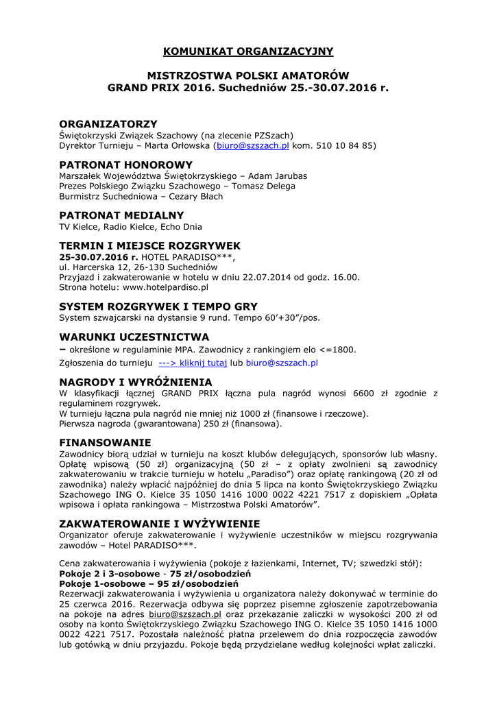 KOMUNIKAT ORGANIZACYJNY MISTRZOSTWA POLSKI AMATORÓW GRAND PRIX 2016. Suchedniów 25.-30.07.2016 r. ORGANIZATORZY Świętokrzyski Związek Szachowy (na zlecenie PZSzach) Dyrektor Turnieju – Marta Orłowska ([email protected] kom. 510 10 84 85) PATRONAT HONOROWY Marszałek Województwa Świętokrzyskiego – Adam Jarubas Prezes Polskiego Związku Szachowego – Tomasz Delega Burmistrz Suchedniowa – Cezary Błach PATRONAT MEDIALNY TV Kielce, Radio Kielce, Echo Dnia TERMIN I MIEJSCE ROZGRYWEK 25-30.07.2016 r. HOTEL PARADISO***, ul. Harcerska 12, 26-130 Suchedniów Przyjazd i zakwaterowanie w hotelu w dniu 22.07.2014 od godz. 16.00. Strona hotelu: www.hotelpardiso.pl SYSTEM ROZGRYWEK I TEMPO GRY System szwajcarski na dystansie 9 rund. Tempo 60’+30”/pos. WARUNKI UCZESTNICTWA – określone w regulaminie MPA. Zawodnicy z rankingiem elo <=1800. Zgłoszenia do turnieju ---> kliknij tutaj lub [email protected] NAGRODY I WYRÓŻNIENIA W klasyfikacji łącznej GRAND PRIX łączna pula nagród wynosi 6600 zł zgodnie z regulaminem rozgrywek. W turnieju łączna pula nagród nie mniej niż 1000 zł (finansowe i rzeczowe). Pierwsza nagroda (gwarantowana) 250 zł (finansowa). FINANSOWANIE Zawodnicy biorą udział w turnieju na koszt klubów delegujących, sponsorów lub własny. Opłatę wpisową (50 zł) organizacyjną (50 zł – z opłaty zwolnieni są zawodnicy zakwaterowaniu w trakcie turnieju w hotelu „Paradiso”) oraz opłatę rankingową (20 zł od zawodnika) należy wpłacić najpóźniej do dnia 5 lipca na konto Świętokrzyskiego Związku Szachowego ING O. Kielce 35 1050 1416 1000 0022 4221 7517 z dopiskiem „Opłata wpisowa i opłata rankingowa – Mistrzostwa Polski Amatorów”. ZAKWATEROWANIE I WYŻYWIENIE Organizator oferuje zakwaterowanie i wyżywienie uczestników w miejscu rozgrywania zawodów – Hotel PARADISO***. Cena zakwaterowania i wyżywienia (pokoje z łazienkami, Internet, TV; szwedzki stół): Pokoje 2 i 3-osobowe - 75 zł/osobodzień Pokoje 1-osobowe – 95 zł/osobodzień Rezerwacji zakwaterowania i wyżywienia u organizatora należy dokonywać w terminie do 25 czerwca 2016. Rezerwacja odbywa się poprzez pisemne zgłoszenie zapotrzebowania na pokoje na adres [email protected] oraz przekazanie zaliczki w wysokości 200 zł od osoby na konto Świętokrzyskiego Związku Szachowego ING O. Kielce 35 1050 1416 1000 0022 4221 7517. Pozostała należność płatna przelewem do dnia rozpoczęcia zawodów lub gotówką w dniu przyjazdu. Pokoje będą przydzielane według kolejności wpłat zaliczki. PROGRAM MISTRZOSTW Przyjazd zawodników: Odprawa techniczna: Otwarcie zawodów (runda I): Rundy II-VIII: 25.07.2016 25.07.2016 25.07.2016 26.07.2016 27.07.2016 28.07.2016 29.07.2016 30.07.2016 r., do godziny 15 r. godzina 15.30 r., godzina 16.00 r., 10.00 (runda II); 15.00 (runda III) r., 10.00 (runda IV); 15.00 (runda V) r., 10.00 (runda VI) ; 15.00 (runda VII) r., 10.00 (runda VIII); r., 10.00 (runda IX) Zakończenie zawodów: 30.07.2016 r., godzina 14.00, wyjazd uczestników SĘDZIOWANIE Sędzią głównym zawodów będzie FA Tomasz Stefaniak. INFORMACJE DODATKOWE Organizator zapewnia: Transmisję on-line z wybranych rund lub szachownic. Bufet herbaciano-kawowy. Dostęp do Internetu na terenie całego obiektu, łącznie z pokojami. Bezpłatny parking na terenie obiektu Nieodpłatne imprezy towarzyszące – grill. Odpłatne imprezy towarzyszące – paintball, rejs po Zalewie Rejowskim lub inne atrakcje według aktualnej oferty hotelu. Wszelkich informacji dodatkowych udziela Dyrektor Turnieju Marta Orłowska – [email protected], tel. 510 10 84 85. Organizator zastrzega sobie prawo do ostatecznej interpretacji i ewentualnych zmian w treści niniejszego komunikatu. Prezes ŚZSzach Tomasz Stefaniak Dyrektor Turnieju Marta Orłowska