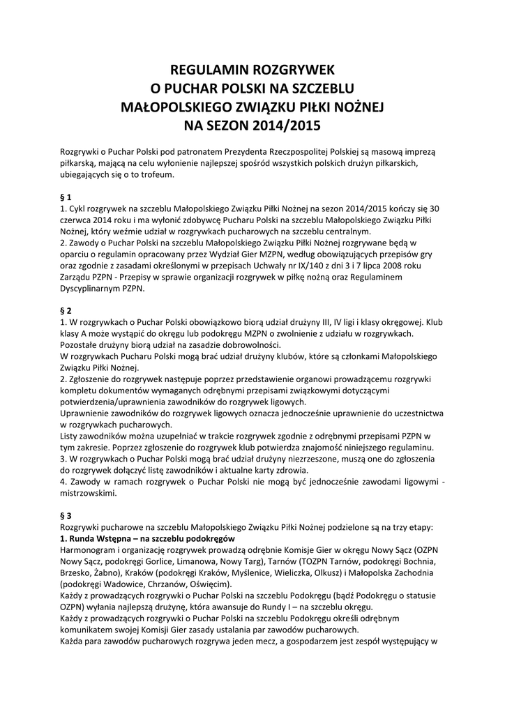 REGULAMIN ROZGRYWEK O PUCHAR POLSKI NA SZCZEBLU MAŁOPOLSKIEGO ZWIĄZKU PIŁKI NOŻNEJ NA SEZON 2014/2015 Rozgrywki o Puchar Polski pod patronatem Prezydenta Rzeczpospolitej Polskiej są masową imprezą piłkarską, mającą na celu wyłonienie najlepszej spośród wszystkich polskich drużyn piłkarskich, ubiegających się o to trofeum. §1 1. Cykl rozgrywek na szczeblu Małopolskiego Związku Piłki Nożnej na sezon 2014/2015 kończy się 30 czerwca 2014 roku i ma wyłonić zdobywcę Pucharu Polski na szczeblu Małopolskiego Związku Piłki Nożnej, który weźmie udział w rozgrywkach pucharowych na szczeblu centralnym. 2. Zawody o Puchar Polski na szczeblu Małopolskiego Związku Piłki Nożnej rozgrywane będą w oparciu o regulamin opracowany przez Wydział Gier MZPN, według obowiązujących przepisów gry oraz zgodnie z zasadami określonymi w przepisach Uchwały nr IX/140 z dni 3 i 7 lipca 2008 roku Zarządu PZPN - Przepisy w sprawie organizacji rozgrywek w piłkę nożną oraz Regulaminem Dyscyplinarnym PZPN. §2 1. W rozgrywkach o Puchar Polski obowiązkowo biorą udział drużyny III, IV ligi i klasy okręgowej. Klub klasy A może wystąpić do okręgu lub podokręgu MZPN o zwolnienie z udziału w rozgrywkach. Pozostałe drużyny biorą udział na zasadzie dobrowolności. W rozgrywkach Pucharu Polski mogą brać udział drużyny klubów, które są członkami Małopolskiego Związku Piłki Nożnej. 2. Zgłoszenie do rozgrywek następuje poprzez przedstawienie organowi prowadzącemu rozgrywki kompletu dokumentów wymaganych odrębnymi przepisami związkowymi dotyczącymi potwierdzenia/uprawnienia zawodników do rozgrywek ligowych. Uprawnienie zawodników do rozgrywek ligowych oznacza jednocześnie uprawnienie do uczestnictwa w rozgrywkach pucharowych. Listy zawodników można uzupełniać w trakcie rozgrywek zgodnie z odrębnymi przepisami PZPN w tym zakresie. Poprzez zgłoszenie do rozgrywek klub potwierdza znajomość niniejszego regulaminu. 3. W rozgrywkach o Puchar Polski mogą brać udział drużyny niezrzeszone, muszą one do zgłoszenia do rozgrywek dołączyć listę zawodników i aktualne karty zdrowia. 4. Zawody w ramach rozgrywek o Puchar Polski nie mogą być jednocześnie zawodami ligowymi mistrzowskimi. §3 Rozgrywki pucharowe na szczeblu Małopolskiego Związku Piłki Nożnej podzielone są na trzy etapy: 1. Runda Wstępna – na szczeblu podokręgów Harmonogram i organizację rozgrywek prowadzą odrębnie Komisje Gier w okręgu Nowy Sącz (OZPN Nowy Sącz, podokręgi Gorlice, Limanowa, Nowy Targ), Tarnów (TOZPN Tarnów, podokręgi Bochnia, Brzesko, Żabno), Kraków (podokręgi Kraków, Myślenice, Wieliczka, Olkusz) i Małopolska Zachodnia (podokręgi Wadowice, Chrzanów, Oświęcim). Każdy z prowadzących rozgrywki o Puchar Polski na szczeblu Podokręgu (bądź Podokręgu o statusie OZPN) wyłania najlepszą drużynę, która awansuje do Rundy I – na szczeblu okręgu. Każdy z prowadzących rozgrywki o Puchar Polski na szczeblu Podokręgu określi odrębnym komunikatem swojej Komisji Gier zasady ustalania par zawodów pucharowych. Każda para zawodów pucharowych rozgrywa jeden mecz, a gospodarzem jest zespół występujący w niższej klasie rozgrywkowej, zaś w przypadku drużyn tej samej klasy, gospodarza zawodów wyłania się drogą losowania. Zwycięzcy w poszczególnych podokręgach muszą być obligatoryjnie wyłonieni do 30 kwietnia 2014 r. Komisje Gier poszczególnych podokręgów obowiązane są w terminie do 30 kwietnia 2014 r. zgłosić pisemnie do Wydziału Gier MZPN drużyny, które zakwalifikowały się do rozgrywek pucharowych Rundy I - na szczeblu okręgów. 2. Runda I – na szczeblu okręgów Harmonogram i organizację rozgrywek prowadzą Komisje/Wydziały Gier OZPN Nowy Sącz (dla rozgrywek o Puchar Polski w OZPN Nowy Sącz i podokręgach Gorlice, Limanowa, Nowy Targ), OZPN Tarnów (dla rozgrywek o Puchar Polski w TOZPN Tarnów i podokręgach Bochnia, Brzesko, Żabno), PPN Oświęcim (dla rozgrywek o Puchar Polski w podokręgach Wadowice, Chrzanów, Oświęcim) i Wydział Gier MZPN (dla rozgrywek o Puchar Polski w podokręgach Kraków, Myślenice, Wieliczka, Olkusz). Każdy z prowadzących rozgrywki o Puchar Polski na tym szczeblu wyłania najlepszą drużynę, która awansuje do Rundy II – finałowej. Każdy z prowadzących rozgrywki o Puchar Polski na tym szczeblu określi odrębnym komunikatem zasady ustalania par zawodów pucharowych pomiędzy zwycięzcami w poszczególnych Podokręgach. Zwycięzcy w poszczególnych okręgach muszą być obligatoryjnie wyłonieni do 31 maja 2014 r. Komisje/Wydziały Gier poszczególnych okręgów obowiązane są w terminie do 31 maja 2014 r. zgłosić pisemnie do Wydziału Gier MZPN drużyny, które zakwalifikowały się do rozgrywek pucharowych Rundy II - finałowej. 3. Runda II - finałowa Organizację rozgrywek pucharowych przejmuje Wydział Gier MZPN i w drodze losowania wyłania pary półfinałowe spośród zwycięzców w okręgach Nowy Sącz, Tarnów, Kraków i Małopolska Zachodnia. Wydział Gier MZPN odrębnym komunikatem ustala daty i godziny zawodów pucharowych. Każda para zawodów pucharowych rozgrywa jeden mecz półfinałowy, a gospodarzem jest drużyna występująca w niższej klasie rozgrywkowej. W przypadku drużyn tej samej klasy gospodarza zawodów wyłania się drogą losowania. Ustalenie gospodarzy zawodów pucharowych w II Rundzie następuje na podstawie aktualnego stanu drużyn w poszczególnych klasach rozgrywkowych w chwili losowania. Finał Pucharu Polski na szczeblu Małopolskiego Związku Piłki Nożnej musi zostać rozegrany do 30 czerwca 2014 roku, na boisku neutralnym wyznaczonym przez Wydział Gier MZPN. §4 1. Orzecznictwo dyscyplinarne w odniesieniu do zawodników, działaczy i klubów biorących udział w rozgrywkach pucharowych rundy wstępnej należy do właściwości organu dyscyplinarnego danego podokręgu, chyba że ze względu na właściwość przedm