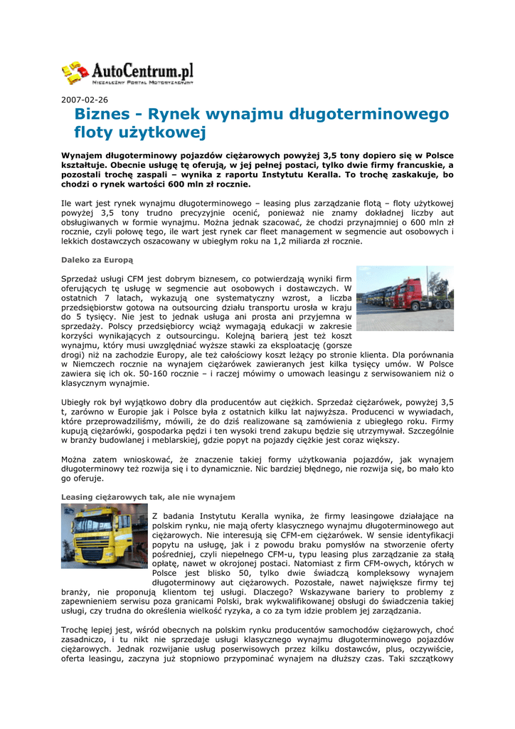 2007-02-26 Biznes - Rynek wynajmu długoterminowego floty użytkowej Wynajem długoterminowy pojazdów ciężarowych powyżej 3,5 tony dopiero się w Polsce kształtuje. Obecnie usługę tę oferują, w jej pełnej postaci, tylko dwie firmy francuskie, a pozostali trochę zaspali – wynika z raportu Instytutu Keralla. To trochę zaskakuje, bo chodzi o rynek wartości 600 mln zł rocznie. Ile wart jest rynek wynajmu długoterminowego – leasing plus zarządzanie flotą – floty użytkowej powyżej 3,5 tony trudno precyzyjnie ocenić, ponieważ nie znamy dokładnej liczby aut obsługiwanych w formie wynajmu. Można jednak szacować, że chodzi przynajmniej o 600 mln zł rocznie, czyli połowę tego, ile wart jest rynek car fleet management w segmencie aut osobowych i lekkich dostawczych oszacowany w ubiegłym roku na 1,2 miliarda zł rocznie. Daleko za Europą Sprzedaż usługi CFM jest dobrym biznesem, co potwierdzają wyniki firm oferujących tę usługę w segmencie aut osobowych i dostawczych. W ostatnich 7 latach, wykazują one systematyczny wzrost, a liczba przedsiębiorstw gotowa na outsourcing działu transportu urosła w kraju do 5 tysięcy. Nie jest to jednak usługa ani prosta ani przyjemna w sprzedaży. Polscy przedsiębiorcy wciąż wymagają edukacji w zakresie korzyści wynikających z outsourcingu. Kolejną barierą jest też koszt wynajmu, który musi uwzględniać wyższe stawki za eksploatację (gorsze drogi) niż na zachodzie Europy, ale też całościowy koszt leżący po stronie klienta. Dla porównania w Niemczech rocznie na wynajem ciężarówek zawieranych jest kilka tysięcy umów. W Polsce zawiera się ich ok. 50-160 rocznie – i raczej mówimy o umowach leasingu z serwisowaniem niż o klasycznym wynajmie. Ubiegły rok był wyjątkowo dobry dla producentów aut ciężkich. Sprzedaż ciężarówek, powyżej 3,5 t, zarówno w Europie jak i Polsce była z ostatnich kilku lat najwyższa. Producenci w wywiadach, które przeprowadziliśmy, mówili, że do dziś realizowane są zamówienia z ubiegłego roku. Firmy kupują ciężarówki, gospodarka pędzi i ten wysoki trend zakupu będzie się utrzymywał. Szczególnie w branży budowlanej i meblarskiej, gdzie popyt na pojazdy ciężkie jest coraz większy. Można zatem wnioskować, że znaczenie takiej formy użytkowania pojazdów, jak wynajem długoterminowy też rozwija się i to dynamicznie. Nic bardziej błędnego, nie rozwija się, bo mało kto go oferuje. Leasing ciężarowych tak, ale nie wynajem Z badania Instytutu Keralla wynika, że firmy leasingowe działające na polskim rynku, nie mają oferty klasycznego wynajmu długoterminowego aut ciężarowych. Nie interesują się CFM-em ciężarówek. W sensie identyfikacji popytu na usługę, jak i z powodu braku pomysłów na stworzenie oferty pośredniej, czyli niepełnego CFM-u, typu leasing plus zarządzanie za stałą opłatę, nawet w okrojonej postaci. Natomiast z firm CFM-owych, których w Polsce jest blisko 50, tylko dwie świadczą kompleksowy wynajem długoterminowy aut ciężarowych. Pozostałe, nawet największe firmy tej branży, nie proponują klientom tej usługi. Dlaczego? Wskazywane bariery to problemy z zapewnieniem serwisu poza granicami Polski, brak wykwalifikowanej obsługi do świadczenia takiej usługi, czy trudna do określenia wielkość ryzyka, a co za tym idzie problem jej zarządzania. Trochę lepiej jest, wśród obecnych na polskim rynku producentów samochodów ciężarowych, choć zasadniczo, i tu nikt nie sprzedaje usługi klasycznego wynajmu długoterminowego pojazdów ciężarowych. Jednak rozwijanie usług poserwisowych przez kilku dostawców, plus, oczywiście, oferta leasingu, zaczyna już stopniowo przypominać wynajem na dłuższy czas. Taki szczątkowy CFM proponuje swoim klientom: Volvo Truck oraz Renault poprzez Volvo Financial Service (VFS), Mercedes – DaimlerChrysler Automotive Polska (CharterWay), DAF, MAN i SCANIA. Rządzą Francuzi Kto więc rządzi i będzie rządził na rynku CFM aut ciężarowych w Polsce? Jak na razie górą są Francuzi, czyli Petit Foriestier i francuska Grupa Fraikin, której polski oddział właśnie przystąpił do Polskiego Związku Wynajmu i Leasingu, zrzeszającego firmy CFM-owe w kraju. Bez wątpienia, dopiero pojawienie się zimą ubiegłego roku w Polsce, tego europejskiego gracza rozpocznie prawdziwą batalię o klienta chętnego na wynajem ciężarówki. Nie ma wątpliwości, najszybciej usługę wynajmu aut ciężarowych, rozwiną w Polsce właśnie zagraniczni oferenci. Uzbrojeni w szeroko pojęte zaplecze (pojazdy, stacje serwisowe w całej Europie, kanały pozyskiwania i zbytu) oraz niezbędne know – how i doświadczenie. Mają oni największe szanse przejęcia lwiej części polskiego rynku, a nawet jego zmonopolizowania. (rb) Źródło: Keralla Resarch IBiRB2B