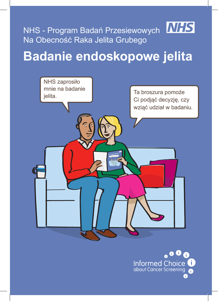 NHS - Program Badań Przesiewowych Na Obecność Raka Jelita Grubego Badanie endoskopowe jelita NHS zaprosiło mnie na badanie jelita. Ta broszura pomoże Ci podjąć decyzję, czy wziąć udział w badaniu. Badanie endoskopowe jelita oferowane przez NHS to nowoczesny test pomagający w zapobieganiu raka jelita grubego. Odbywa się to poprzez odnajdowanie i usuwanie z jelita grubego małych narośli, tzw. polipów, które mogłyby w przyszłości przekształcić się w nowotwór. NHS oferuje przeprowadzenie badania endoskopowego jelita wszystkim kobietom i mężczyznom, którzy ukończyli 55 lat. Niniejsza broszura ma na celu pomóc Ci w dokonaniu wyboru, czy poddać się badaniu jelita. Broszura wyjaśnia: d laczego NHS oferuje badanie endoskopowe jelita, c zego się spodziewać po tym badaniu, oraz jakie są potencjalne korzyści i ryzyka dla pacjenta. Zestawienie faktów i danych liczbowych dotyczących badania endoskopowego jelita znajduje się na stronach 8. i 9. Dlaczego NHS oferuje badanie endoskopowe jelita? Badanie endoskopowe jelita oferowane przez NHS pomaga w zapobieganiu raka jelita grubego. Na każde 300 osób poddanych badaniu udaje się zapobiec wystąpieniu tej choroby u dwóch osób oraz uratować życie jednej osoby. Niektóre problemy zdrowotne mogą uniemożliwiać wykonanie badania endoskopowego jelita. Więcej informacji znajduje się na stronie 5. 2 Czym jest rak jelita? Rak jelita to nowotwór rozwijający się w jelicie grubym. Jest on również określany jako rak jelitowo-odbytniczy. Choroba często rozpoczyna się od występowania w jelicie grubym małych narośli, zwanych polipami. Polipy zazwyczaj nie wywołują objawów, lecz niektóre mogą się przekształcić w nowotwór, jeśli nie zostaną usunięte. Jelita pomagają w trawieniu pokarmów, które spożywamy. Po przejściu przez jelita z żywności pozostają jedynie odchody. Jelita składają się z dwóch części – są to jelito cienkie i jelito grube. Na poniższym obrazku jelito grube zaznaczono kolorem różowym. Rak jelita grubego jest trzecim najczęściej występującym nowotworem w Wielkiej Brytanii. Szacuje się, że jedna na 18 osób w ciągu swego życia zachoruje na raka jelita. Zagrożeni są zarówno mężczyźni, jak i kobiety. Rak jelita grubego występuje najczęściej u osób starszych, które przekroczyły 55. rok życia. Ryzyko zachorowania na raka jelita istnieje nawet wtedy, gdy nikt inny w rodzinie nie miał raka. Przełyk Żołądek Jelito grube Jelito cienkie Odbyt 1 Co to jest badanie endoskopowe jelita? Do przeprowadzenia badania endoskopowego jelita używa się cienkiego, giętkiego przewodu zakończonego malutką kamerą umożliwiającą obejrzenie wnętrza jelita grubego. Przy jego pomocy można wykrywać oraz usuwać z jelita grubego małe narośle, zwane polipami. Polipy zazwyczaj nie wywołują objawów, lecz niektóre mogą się przekształcić w nowotwór, jeśli nie zostaną usunięte. W języku technicznym badanie endoskopowe jelita grubego określane jest jako giętka sigmoidoskopia. Co obejmuje badanie endoskopowe jelita? Badanie endoskopowe jelita jest wykonywane przez specjalnie przeszkoloną pielęgniarkę lub lekarza w ośrodku NHS prowadzącym badania przesiewowe na obecność raka jelita grubego. Osoba wykonująca badanie wprowadza cienki, giętki przewód do odbytu pacjenta, aby obejrzeć wnętrze jelita grubego za pomocą malutkiej kamery. Podczas badania endoskopowego jelita przegląda się dolną część jelita grubego, ponieważ właśnie tam najczęściej występują polipy. Po wprowadzeniu giętkiego przewodu do jelita grubego, pielęgniarka lub lekarz wpompują tam delikatnie trochę dwutlenku węgla. Gaz rozszerza jelito, aby można było zobaczyć ewentualne polipy. W przypadku wykrycia polipów, wykonujący badanie zazwyczaj usuwa je od razu. Robi się to za pomocą niewielkiej pętelki wprowadzanej poprzez wspomniany przewód. Zdarza się, że pielęgniarka lub lekarz pobierają maleńki fragment jelita (tzw. biopsja), aby go obejrzeć pod mikroskopem. Zarówno usunięcie polipa, jak i wykonanie biopsji to zabiegi bezbolesne. Co będzie, jeśli się zdecyduję na badanie endoskopowe jelita? Dwa tygodnie przed wizytą 2 Otrzymasz list od ośrodka NHS prowadzącego badania przesiewowe na obecność raka jelita grubego. W przesyłce znajdziesz również lewatywę oraz instrukcję jej użycia. Lewatywa to płyn służący do oczyszczenia jelita grubego z odchodów. Stosuje się ją, aby pielęgniarka lub lekarz mogli dokładnie obejrzeć jelito pacjenta. Roztwór doodbytniczy mieści się w plastikowym woreczku z końcówką wylotową. Dla większości osób jest on łatwy w użyciu. W dniu wizyty Wykonaj lewatywę na około godzinę przed wyjściem z domu na badanie endoskopowe jelita. W tym celu należy wycisnąć płyn z plastikowego woreczka do odbytnicy. Lewatywa spowoduje wypróżnienie wkrótce po jej zastosowaniu. Dzięki lewatywie jelito grube pozostanie czyste przez kilka godzin. Po przyjeździe do ośrodka NHS prowadzącego badania przesiewowe na obecność raka jelita grubego, pielęgniarka lub lekarz wyjaśnią na czym polega badanie, udzielą odpowiedzi na pytania i wysłuchają Twoich obaw. Zostaniesz poproszony/-a o założenie koszuli szpitalnej oraz położenie się na łóżku w gotowości na badanie endoskopowe jelita. Jeśli chcesz, w trakcie wykonywania badania możesz również oglądać wnętrze swojego jelita na ekranie telewizora. Pielęgniarka lub lekarz poinformują Cię od razu, jeśli usuną jakiekolwiek małe narośle (polipy). Wziernik wprowadzony do jelita grubego. W ciągu dwóch tygodni po wizycie Otrzymasz list z wyjaśnieniem wyników przeprowadzonego badania endoskopowego jelita. Wyniki zostaną przekazane także Twojemu lekarzowi pierwszego kontaktu. 3 Jak długo trwa badanie endoskopowe jelita? Samo badanie endoskopowe jelita trwa zazwyczaj tylko kilka minut, lecz przeprowadzenie całej wizyty może zają