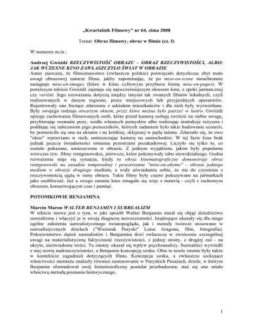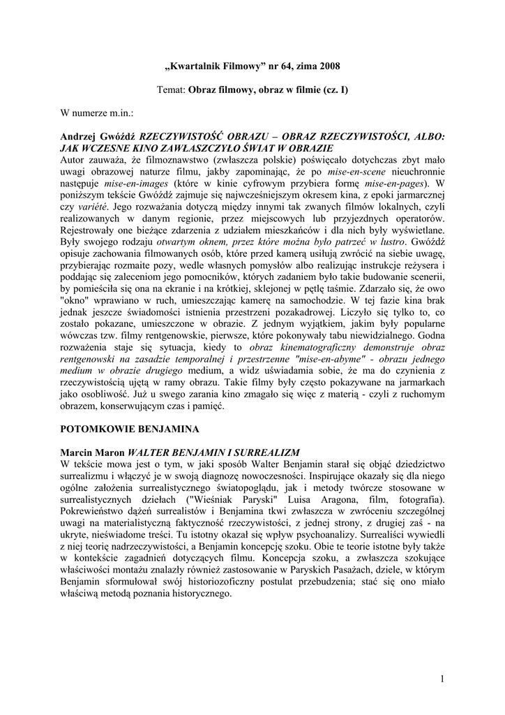 1 „Kwartalnik Filmowy” nr 64, zima 2008 Temat: Obraz filmowy