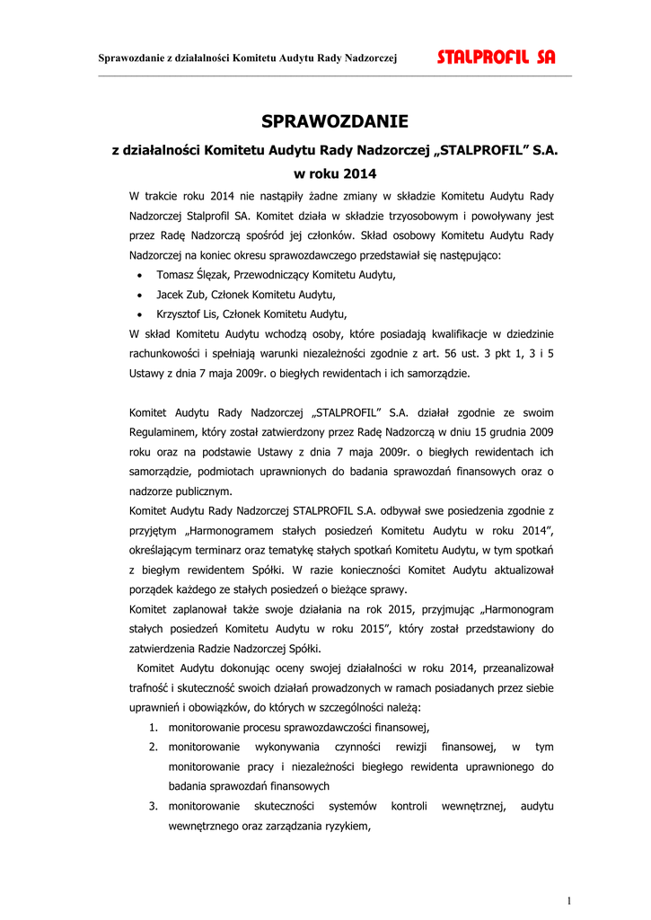 Sprawozdanie z działalności Komitetu Audytu Rady Nadzorczej ______________________________________________________________________________________ SPRAWOZDANIE z działalności Komitetu Audytu Rady Nadzorczej „STALPROFIL” S.A. w roku 2014 W trakcie roku 2014 nie nastąpiły żadne zmiany w składzie Komitetu Audytu Rady Nadzorczej Stalprofil SA. Komitet działa w składzie trzyosobowym i powoływany jest przez Radę Nadzorczą spośród jej członków. Skład osobowy Komitetu Audytu Rady Nadzorczej na koniec okresu sprawozdawczego przedstawiał się następująco: Tomasz Ślęzak, Przewodniczący Komitetu Audytu, Jacek Zub, Członek Komitetu Audytu, Krzysztof Lis, Członek Komitetu Audytu, W skład Komitetu Audytu wchodzą osoby, które posiadają kwalifikacje w dziedzinie rachunkowości i spełniają warunki niezależności zgodnie z art. 56 ust. 3 pkt 1, 3 i 5 Ustawy z dnia 7 maja 2009r. o biegłych rewidentach i ich samorządzie. Komitet Audytu Rady Nadzorczej „STALPROFIL” S.A. działał zgodnie ze swoim Regulaminem, który został zatwierdzony przez Radę Nadzorczą w dniu 15 grudnia 2009 roku oraz na podstawie Ustawy z dnia 7 maja 2009r. o biegłych rewidentach ich samorządzie, podmiotach uprawnionych do badania sprawozdań finansowych oraz o nadzorze publicznym. Komitet Audytu Rady Nadzorczej STALPROFIL S.A. odbywał swe posiedzenia zgodnie z przyjętym „Harmonogramem stałych posiedzeń Komitetu Audytu w roku 2014”, określającym terminarz oraz tematykę stałych spotkań Komitetu Audytu, w tym spotkań z biegłym rewidentem Spółki. W razie konieczności Komitet Audytu aktualizował porządek każdego ze stałych posiedzeń o bieżące sprawy. Komitet zaplanował także swoje działania na rok 2015, przyjmując „Harmonogram stałych posiedzeń Komitetu Audytu w roku 2015”, który został przedstawiony do zatwierdzenia Radzie Nadzorczej Spółki. Komitet Audytu dokonując oceny swojej działalności w roku 2014, przeanalizował trafność i skuteczność swoich działań prowadzonych w ramach posiadanych przez siebie uprawnień i obowiązków, do których w szczególności należą: 1. monitorowanie procesu sprawozdawczości finansowej, 2. monitorowanie wykonywania czynności rewizji finansowej, w tym monitorowanie pracy i niezależności biegłego rewidenta uprawnionego do badania sprawozdań finansowych 3. monitorowanie skuteczności systemów kontroli wewnętrznej, audytu wewnętrznego oraz zarządzania ryzykiem, 1 Sprawozdanie z działalności Komitetu Audytu Rady Nadzorczej ______________________________________________________________________________________ Komitet Audytu czynnie wspierał Zarząd w promowaniu i implementacji w Spółce „Kodeksu Etyki”. Komitet Audytu brał też czynny udział w wewnętrznym dialogu pomiędzy interesariuszami Spółki na temat utrwalania w Spółce zasad ładu korporacyjnego, przyjętych przez Radę Giełdy Papierów Wartościowych w Warszawie w dokumencie „Dobre praktyki spółek notowanych na GPW”. I. Monitorowanie procesu sprawozdawczości finansowej, monitorowanie wykonywania czynności rewizji finansowej, w tym monitorowanie pracy i niezależności biegłego rewidenta uprawnionego do badania sprawozdań finansowych Przedmiotem stałych działań Komitetu Audytu jest monitorowanie prac związanych z procesem sporządzania oraz rewizją sprawozdań finansowych Spółki. Komitet na bieżąco współpracuje z audytorem w tym obszarze. Audytorem, rekomendowanym przez Komitet Audytu, z którym Spółka zawarła umowę na badanie i przegląd jednostkowych i skonsolidowanych sprawozdań finansowych Spółki za lata 2013-2015 jest Kancelaria Porad Finansowo – Księgowych dr Piotr Rojek sp. z o.o. W ramach swych regulaminowych uprawnień Komitet Audytu badał kwestię niezależności biegłego rewidenta badającego sprawozdania finansowe Spółki za rok 2014, tak w stosunku do Spółki, jak i osób nią zarządzających oraz nadzorujących. Niezależność została potwierdzona na podstawie stosownych oświadczeń, złożonych Komitetowi Audytu przez biegłego rewidenta (o niezależności osobistej członków zespołów realizujących czynności rewizji finansowej i niezależności Kancelarii jako podmiotu uprawnionego, tak w stosunku do Stalprofil SA jak i osób zarządzających i nadzorujących). Komitet Audytu monitorował prawidłowość sporządzania przez Spółkę okresowych sprawozdań finansowych, w tym także sprawozdań finansowych Spółki (jednostkowego i skonsolidowanego) za rok 2014, na które składa się: o Wprowadzenie do sprawozdania finansowego. o Sprawozdanie z sytuacji finansowej na dzień 31.12.2014 r. o Sprawozdanie z całkowitych dochodów za okres od 01.01.2014 r. do 31.12.2014r o Rachunek przepływów pieniężnych za rok 2014 o Zestawienie zmian w kapitale własnym za rok 2014 o Dodatkowe informacje i objaśnienia Komitet ściśle współpracował w tym zakresie z biegłym rewidentem – Kancelarią Porad Finansowo – Księgowych dr Piotr Rojek sp. z o.o., badającym sprawozdanie finansowe Spółki za ten okres. 2 Sprawozdanie z działalności Komitetu Audytu Rady Nadzorczej ______________________________________________________________________________________ Biegły rewident nie zgłosił zastrzeżeń do prawidłowości i rzetelności zbadanego sprawozdania finansowego i wskazał na dobrą współpracę z Zarządem podczas jego badania. Z informacji uzyskanych przez Komitet Audytu wynika, że współpraca audytorów z Zarządem Spółki jest prawidłowa i nie budzi żadnych zastrzeżeń. Biegli dokonujący badania posiadali swobodny dostęp do dokumentów i nie stwierdzili jakichkolwiek uchybień. Badanie sprawozdań jednostkowego i skonsolidowanego zostało przeprowadzone w terminie, zgodnie z przyjętym harmonogramem. Komitet Audytu na bieżąco monitorował prawidłowość procesu sprawozdawczości finansowej, w tym głównie stosowane przez Spółkę standardy, związane z wyceną