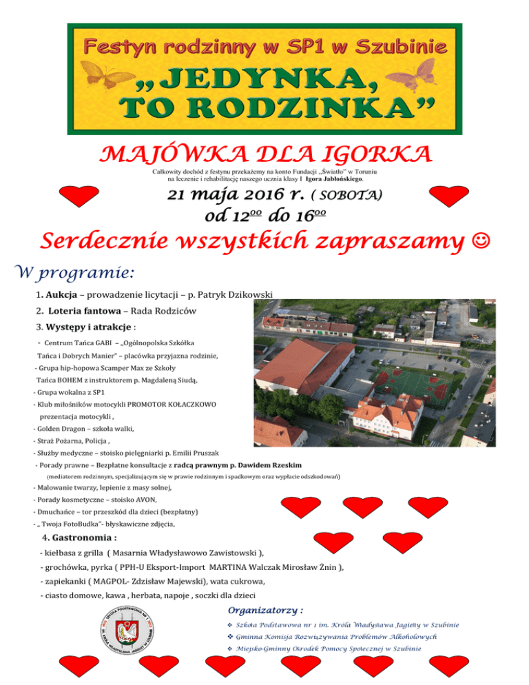 MAJÓWKA DLA IGORKA Całkowity dochód z festynu przekażemy na konto Fundacji ,,Światło” w Toruniu na leczenie i rehabilitację naszego ucznia klasy I Igora Jabłońskiego. 21 maja 2016 r. ( SOBOTA) od 1200 do 1600 Serdecznie wszystkich zapraszamy W programie: 1. Aukcja – prowadzenie licytacji – p. Patryk Dzikowski 2. Loteria fantowa – Rada Rodziców 3. Występy i atrakcje : - Centrum Tańca GABI – ,,Ogólnopolska Szkółka Tańca i Dobrych Manier” – placówka przyjazna rodzinie, - Grupa hip-hopowa Scamper Max ze Szkoły Tańca BOHEM z instruktorem p. Magdaleną Siudą, - Grupa wokalna z SP1 - Klub miłośników motocykli PROMOTOR KOŁACZKOWO prezentacja motocykli , - Golden Dragon – szkoła walki, - Straż Pożarna, Policja , - Służby medyczne – stoisko pielęgniarki p. Emilii Pruszak - Porady prawne – Bezpłatne konsultacje z radcą prawnym p. Dawidem Rzeskim (mediatorem rodzinnym, specjalizującym się w prawie rodzinnym i spadkowym oraz wypłacie odszkodowań) - Malowanie twarzy, lepienie z masy solnej, - Porady kosmetyczne – stoisko AVON, - Dmuchańce – tor przeszkód dla dzieci (bezpłatny) - „ Twoja FotoBudka”- błyskawiczne zdjęcia, 4. Gastronomia : - kiełbasa z grilla ( Masarnia Władysławowo Zawistowski ), - grochówka, pyrka ( PPH-U Eksport-Import MARTINA Walczak Mirosław Żnin ), - zapiekanki ( MAGPOL- Zdzisław Majewski), wata cukrowa, - ciasto domowe, kawa , herbata, napoje , soczki dla dzieci Organizatorzy : Szkoła Podstawowa nr 1 im. Króla Władysława Jagiełły w Szubinie Gminna Komisja Rozwiązywania Problemów Alkoholowych Miejsko-Gminny Ośrodek Pomocy Społecznej w Szubinie