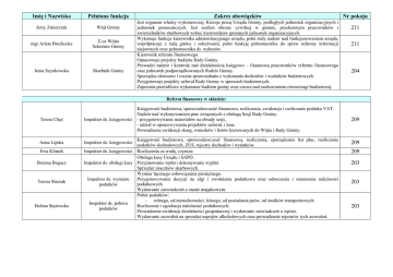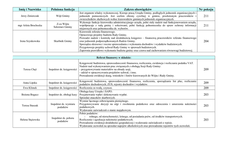 Imię i Nazwisko Pełniona funkcja Jerzy Zmierczak Wójt Gminy mgr Arleta Brochocka Z-ca Wójta Sekretarz Gminy Irena Szynkowska Skarbnik Gminy Zakres obowiązków Jest organem władzy wykonawczej. Kieruje pracą Urzędu Gminy, podległych jednostek organizacyjnych i jednostek pomocniczych. Jest szefem obrony cywilnej w gminie, przełożonym pracowników i zwierzchników służbowych wobec kierowników gminnych jednostek organizacyjnych. Wykonuje funkcje kierownika administracyjnego urzędu, pełni stały nadzór nad funkcjonowaniem urzędu, współpracuje z radą gminy i sołectwami, pełni funkcję pełnomocnika do spraw ochrony informacji niejawnych oraz pełnomocnika ds. wyborów. Kierownik referatu finansowego. Opracowuje projekty budżetu Rady Gminy. Prowadzi nadzór i kontrolę nad działalnością księgowo – finansową pracowników referatu finansowego oraz jednostek podporządkowanych Radzie Gminy. Sporządza okresowe i roczne sprawozdania z wykonania dochodów i wydatków budżetowych. Przygotowuje projekty uchwał Rady Gminy w sprawach budżetowych. Zapewnia prawidłowe wykonanie budżetu gminy oraz czuwa nad zachowaniem równowagi budżetowej. Nr pokoju 211 211 204 Referat finansowy w składzie: Teresa Chęś Anna Lipska Ewa Klimek Bożena Bogacz Teresa Staszak Helena Stężewska Księgowość budżetowa, sprawozdawczość finansowa, rozliczenia, ewidencja i rozliczanie podatku VAT. Nadzór nad wykonywaniem prac związanych z obsługą Sesji Rady Gminy: Inspektor ds. księgowości - przygotowywanie materiałów na obrady sesji, - udział w opracowywaniu projektów uchwał, i inne. Prowadzenie ewidencji skarg, wniosków i listów kierowanych do Wójta i Rady Gminy. Księgowość budżetowa, sprawozdawczość finansowa, rozliczenia, sporządzanie list płac, rozliczanie podatków dochodowych, ZUS, rejestry dochodów i wydatków. Inspektor ds. księgowości Rozliczenia za wodę, czynsze. Obsługa kasy Urzędu i SAPO. Inspektor ds. obsługi kasy Przyjmowanie wpłat i dokonywanie wypłat. Sprzedaż znaczków skarbowych. Wymiar łącznego zobowiązania pieniężnego. Przygotowywanie decyzji na ulgi i zwolnienia podatkowe oraz odroczenia i umorzenia należności Inspektor ds. wymiaru podatkowych. podatków Wydawanie zaświadczeń o stanie majątkowym. Pobór podatków: - rolnego, od nieruchomości, leśnego, od posiadania psów, od środków transportowych. Inspektor ds. poboru Rozliczenie i egzekucja należności podatkowych. podatków Prowadzenie ewidencji działalności gospodarczej i wydawanie zaświadczeń o wpisie. Wydawanie zezwoleń na sprzedaż napojów alkoholowych oraz prowadzenie rejestrów tych zezwoleń. Inspektor ds. księgowości 209 209 209 203 203 203 Andrzej Woźniak Kierownik SOTG Marian Kałużny Jacek Śniegowski Konserwatorzy urządzeń wodociągowych Grzegorz Topolski Jan Wekwejt Mirosław Kwiliński Stanisław Bentkowski Zdzisław Zieliński Grzegorz Kłosiński Pracownicy SOTG Aleksandra Gawinecka Inspektor Józef Jędrzejewski Inspektor Leszek Rosół Inspektor Sekcja Obsługi Techniczno-Gospodarczej w składzie: Sprawowanie nadzoru nad pracownikami sekcji, prawidłowym rozprowadzaniem wody, konserwacją i eksploatacją urządzeń wodociągowych w stacjach uzdatniania wody. Prowadzenie umów z odbiorcami na dostawę wody z ujęć wodnych. Współpraca z odpowiednimi instytucjami w zakresie konserwacji i eksploatacji wodociągów. Nadzór nad budową i remontem świetlic, remontem szkół gminnych i remiz strażackich. Przygotowywanie projektów uchwał w sprawie zaopatrzenia wsi w wodę oraz jej sprzedaży. Kontrola nad ruchem urządzeń oraz wykonywanie czynności zawartych w dokumentacji technicznej. Utrzymywanie należytej czystości w hydroforni. Dokonywanie odczytów zużycia wody co miesiąc w zakładach pracy i odbiorców indywidualnych co dwa miesiące. Dokonywanie inkasa należności u odbiorców indywidualnych posiadających wodomierze jak również u tych odbiorców, którzy płacą za pobór wody wg ankiety. Wykonywanie robót konserwacyjno–naprawczych w hydroforni jak również na sieci wodociągowej. Wykonywanie zadań wynikających z zakresu obowiązków i zleconych przez kierownika SOTG. Wykonywanie zadań wynikających z zakresu obowiązków oraz zleconych przez kierownika SOTG. Pozostali pracownicy: Prowadzenie spraw związanych z obsługą sekretariatu. Gospodarka etatami oraz prowadzenie spraw osobowych pracowników Urzędu. Wykonywanie spraw związanych z obsługą Rady Gminy. Sprawy związane z wydawaniem dowodów osobistych. Prowadzenie ewidencji osób zameldowanych na pobyt czasowy do 2 m-c oraz zameldowań cudzoziemców. Prowadzenie spraw związanych z ochroną przeciwpowodziową w ramach akcji przeciwpowodziowej. Organizowanie prac związanych z konserwacją i eksploatacją urządzeń melioracyjnych. Ewidencja ludności, dowody osobiste, melioracja. Prowadzenie spraw Obrony Cywilnej. Prowadzenie ewidencji osób o nieuregulowanym stosunku do służby wojskowej wraz z aktualizacją wykazów poborowych. Organizacja i nadzór w zakresie obronności i ochrony cywilnej. Prowadzenie spraw w zakresie rolnictwa ogólnego. Prowadzenie spraw związanych z ochroną p.poż., nadzór nad jednostkami OSP. Zarządzanie kryzysowe. Inwentaryzacja mienia Gminy, przygotowywanie dokumentów do wydania decyzji komunalizacyjnych, inne sprawy związane z gospodarką nieruchomościami. 212 - - 211 210 210 Janusz Kaczmarek Tadeusz Gąsiorowski Urszula Rosół Arleta Matuszewska Ochrona środowiska. Wydawanie decyzji o warunkach zabudowy i zagospodarowania terenu. Udostępnianie i sporządzanie projektów założeń i projektów miejscowych planów zagospodarowania Inspektor ds. budownictwa przestrzennego. i ochrony środowiska Udzielanie wskazań lokalizacyjnych w odniesieniu do inwestycji lokalnych. Wydawanie i prowadzenie rejestru decyzji o ustaleniu lokalizacji inwestycji. Koordynacja w realizacji inwestycji na terenie działania jednostki samorzą