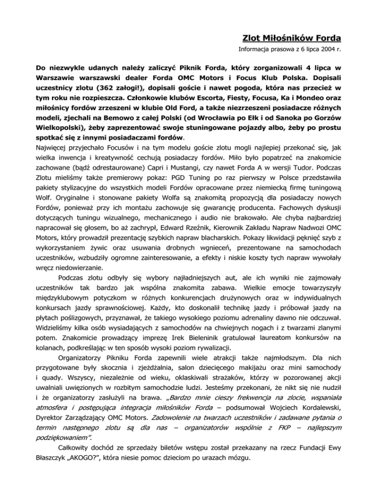 Zlot Miłośników Forda Informacja prasowa z 6 lipca 2004 r. Do niezwykle udanych należy zaliczyć Piknik Forda, który zorganizowali 4 lipca w Warszawie warszawski dealer Forda OMC Motors i Focus Klub Polska. Dopisali uczestnicy zlotu (362 załogi!), dopisali goście i nawet pogoda, która nas przecież w tym roku nie rozpieszcza. Członkowie klubów Escorta, Fiesty, Focusa, Ka i Mondeo oraz miłośnicy fordów zrzeszeni w klubie Old Ford, a także niezrzeszeni posiadacze różnych modeli, zjechali na Bemowo z całej Polski (od Wrocławia po Ełk i od Sanoka po Gorzów Wielkopolski), żeby zaprezentować swoje stuningowane pojazdy albo, żeby po prostu spotkać się z innymi posiadaczami fordów. Najwięcej przyjechało Focusów i na tym modelu goście zlotu mogli najlepiej przekonać się, jak wielka inwencja i kreatywność cechują posiadaczy fordów. Miło było popatrzeć na znakomicie zachowane (bądź odrestaurowane) Capri i Mustangi, czy nawet Forda A w wersji Tudor. Podczas Zlotu mieliśmy także premierowy pokaz: PGD Tuning po raz pierwszy w Polsce przedstawiła pakiety stylizacyjne do wszystkich modeli Fordów opracowane przez niemiecką firmę tuningową Wolf. Oryginalne i stonowane pakiety Wolfa są znakomitą propozycją dla posiadaczy nowych Fordów, ponieważ przy ich montażu zachowuje się gwarancję producenta. Fachowych dyskusji dotyczących tuningu wizualnego, mechanicznego i audio nie brakowało. Ale chyba najbardziej napracował się głosem, bo aż zachrypł, Edward Rzeźnik, Kierownik Zakładu Napraw Nadwozi OMC Motors, który prowadził prezentację szybkich napraw blacharskich. Pokazy likwidacji pęknięć szyb z wykorzystaniem żywic oraz usuwania drobnych wgnieceń, prezentowane na samochodach uczestników, wzbudziły ogromne zainteresowanie, a efekty i niskie koszty tych napraw wywołały wręcz niedowierzanie. Podczas zlotu odbyły się wybory najładniejszych aut, ale ich wyniki nie zajmowały uczestników tak bardzo jak wspólna znakomita zabawa. Wielkie emocje towarzyszyły międzyklubowym potyczkom w różnych konkurencjach drużynowych oraz w indywidualnych konkursach jazdy sprawnościowej. Każdy, kto doskonalił technikę jazdy i próbował jazdy na płytach poślizgowych, przyznawał, że takiego wysokiego poziomu adrenaliny dawno nie odczuwał. Widzieliśmy kilka osób wysiadających z samochodów na chwiejnych nogach i z twarzami zlanymi potem. Znakomicie prowadzący imprezę Irek Bieleninik gratulował laureatom konkursów na kolanach, podkreślając w ten sposób wysoki poziom rywalizacji. Organizatorzy Pikniku Forda zapewnili wiele atrakcji także najmłodszym. Dla nich przygotowane były skocznia i zjeżdżalnia, salon dziecięcego makijażu oraz mini samochody i quady. Wszyscy, niezależnie od wieku, oklaskiwali strażaków, którzy w pozorowanej akcji uwalniali uwięzionych w rozbitym samochodzie ludzi. Jesteśmy przekonani, że nikt się nie nudził i że organizatorzy zasłużyli na brawa. „Bardzo mnie cieszy frekwencja na zlocie, wspaniała atmosfera i postępująca integracja miłośników Forda – podsumował Wojciech Kordalewski, Dyrektor Zarządzający OMC Motors. Zadowolenie na twarzach uczestników i zadawane pytania o termin następnego zlotu są dla nas – organizatorów wspólnie z FKP – najlepszym podziękowaniem”. Całkowity dochód ze sprzedaży biletów wstępu został przekazany na rzecz Fundacji Ewy Błaszczyk „AKOGO?”, która niesie pomoc dzieciom po urazach mózgu.