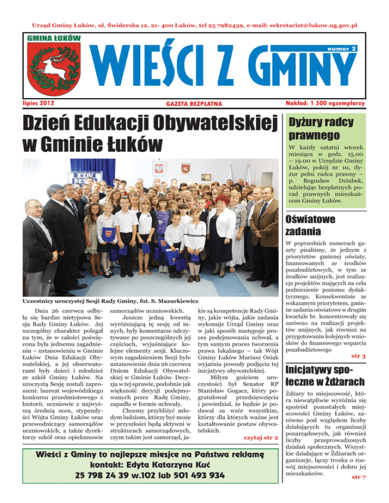 Urząd Gminy Łuków, ul. Świderska 12, 21- 400 Łuków, tel 25 7982439, e-mail: [email protected] wieści z gminy numer 2 lipiec 2012 GAZETA BEZPŁATNA Dzień Edukacji Obywatelskiej w Gminie Łuków Nakład: 1 500 egzemplarzy Dyżury radcy prawnego W każdy ostatni wtorek miesiąca w godz. 15.00 – 19.00 w Urzędzie Gminy Łuków, pokój nr 10, dyżur pełni radca prawny – p. Bogusław Dziubek, udzielając bezpłatnych porad prawnych mieszkańcom Gminy Łuków. Oświatowe zadania Uczestnicy uroczystej Sesji Rady Gminy, fot. S. Mazurkiewicz Dnia 26 czerwca odbyła się bardzo nietypowa Sesja Rady Gminy Łuków. Jej szczególny charakter polegał na tym, że w całości poświęcona była jednemu zagadnieniu – ustanowieniu w Gminie Łuków Dnia Edukacji Obywatelskiej, a jej obserwatorami były dzieci i młodzież ze szkół Gminy Łuków. Na uroczystą Sesję zostali zaproszeni: laureat wojewódzkiego konkursu przedmiotowego z historii, uczniowie z najwyższą średnią ocen, stypendyści Wójta Gminy Łuków oraz przewodniczący samorządów uczniowskich, a także dyrektorzy szkół oraz opiekunowie samorządów uczniowskich. Jeszcze jedną kwestią wyróżniającą tę sesję od innych, były komentarze odczytywane po poszczególnych jej częściach, wyjaśniające kolejne elementy sesji. Kluczowym zagadnieniem Sesji było ustanowienie dnia 26 czerwca Dniem Edukacji Obywatelskiej w Gminie Łuków. Decyzja w tej sprawie, podobnie jak większość decyzji podejmowanych przez Radę Gminy, zapadła w formie uchwały. Chcemy przybliżyć młodym ludziom, którzy być może w przyszłości będą aktywni w strukturach samorządowych, czym takim jest samorząd, ja- kie są kompetencje Rady Gminy, jakie wójta, jakie zadania wykonuje Urząd Gminy oraz w jaki sposób następuje proces podejmowania uchwał, a tym samym proces tworzenia prawa lokalnego – tak Wójt Gminy Łuków Mariusz Osiak wyjaśnia powody podjęcia tej inicjatywy obywatelskiej. Miłym gościem uroczystości był Senator RP Stanisław Gogacz, który pogratulował przedsięwzięcia i powiedział, że będzie je podawał za wzór wszystkim, którzy dla których ważne jest kształtowanie postaw obywatelskich. czytaj str 2 Wieści z Gminy to najlepsze miesjce na Pañstwa reklamę kontakt: Edyta Katarzyna Kuć 25 798 24 39 w.102 lub 501 493 934 W poprzednich numerach gazety pisaliśmy, że jednym z priorytetów gminnej oświaty, finansowanych ze środków pozabudżetowych, w tym ze środków unijnych, jest realizacja projektów mających na celu podniesienie poziomu dydaktycznego. Konsekwentnie ze wskazanym priorytetem, gminne zadania oświatowe w drugim kwartale br. koncentrowały się zarówno na realizacji projektów unijnych, jak również na przygotowaniu kolejnych wniosków do finansowego wsparcia pozabudżetowego str 3 Inicjatywy społeczne w Żdżarach Żdżary to miejscowość, która niewątpliwie wyróżnia się spośród pozostałych miejscowości Gminy Łuków, zarówno pod względem liczby działających tu organizacji pozarządowych, jak również liczby przeprowadzonych działań społecznych. Wszystkie działające w Żdżarach organizacje, łączy troska o rozwój miejscowości i dobro jej mieszkańców. str 7 Urząd Gminy Łuków, ul. Świderska 12, 21- 400 Łuków, tel 25 7982439, e-mail: [email protected] Z prac Rady Gminy Łuków Odnawialne źródła energii Od pewnego czasu polskie samorządy wyrażają żywe zainteresowanie odnawialnymi źródłami energii. Tak dzieje się również w Gminie Łuków. Żeby jednak odnawialne źródła energii przynosiły spodziewane korzyści, nie wpływając przy tym ujemnie na środowisko naturalne i życie mieszkańców, potrzebna jest szczegółowa o nich wiedza i szereg działań przygotowujących do ich wdrożenia w życie. Władze Gminy Łuków stawiają na wykorzystanie na swoim terenie energii wiatrowej i słonecznej. Jednym z działań mających na celu poznanie tematu elektrowni wiatrowych niejako u źródeł, była wizyta studyjna przedstawicieli Gminy Łuków w Gminie Kisielice (woj. warmińsko – mazurskie) – jednej z pierwszych w Polsce gmin, które uruchomiły na swoim terenie farmy wiatrowe. Rada Gminy, sołtysi i kilkoro pracowników Urzędu Gminy spotkali się z burmistrzem – Tomaszem Koprowiakiem oraz przedstawicielami firm zajmujących się wdrażaniem energii odnawialnych – Juwi, Windmatik, Windprojekt, którzy szczegółowo poinformowali o przedsięwzięciu od jego początków do chwili obecnej oraz odpowiedzieli na pytania i wątpliwości reprezentantów Gminy Łuków. Po tej wizycie, po konsultacjach i dyskusjach w komisjach, Rada Gminy Łuków zdecydowała o podjęciu uchwały w sprawie przystąpienia do zmiany planu zagospodarowania przestrzennego we wsiach Podgaj, Jeziory, Gołąbki, Świdry, celem wyznaczenie terenu lokalizacji elektrowni wiatrowych. Kolejną uchwałą dotyczącą tematu odnawialnych źródeł energii, przyjętą przez Radę Gminy, jest uchwała w sprawie zabezpieczenia budżetowych środków finansowych na projekt pod nazwą „Budowa instalacji solarnych w gminie Łuków”. Przygotowany projekt na dofinansowanie ze środków unijnych został złożony do Urzędu Marszałkowskiego. Dzień Edukacji Obywatelskiej w Gminie Łuków Ta wyjątkowa uroczystość była również okazją do wręczenia podziękowań i upominków najlepszym uczniom Gminy Łuków. Pomysł ustanowienia Dnia Edukacji Obywatelskiej w Gminie Łuków zgłosił Przewodniczący Komisji Oświaty, Kultury i Sportu Wojciech Szczygieł. Sala konferencyjna Urzędu Gminy Łuków była wypełniona po brzegi…, fot. S. Mazurkiewicz Podziękowania z rąk Wójta Gminy Mariusza Osiaka i Przewodniczącego Rady Tadeusza Federczyka odebrali: Laureat wojewódzkiego konkursu przedmiotowego z historii: Mariusz Goławski – Szkoła Podstawowa w Świdrach Uczniowie z najwyższą średnią ocen: - Iga Krasuska - Szkoła Podstawowa w Aleksandrowie - Anna Szczęsna - Sz