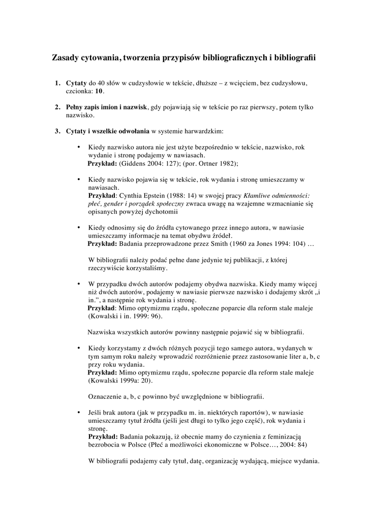 Zasady cytowania, tworzenia przypisów bibliograficznych i bibliografii 1. Cytaty do 40 słów w cudzysłowie w tekście, dłuższe – z wcięciem, bez cudzysłowu, czcionka: 10. 2. Pełny zapis imion i nazwisk, gdy pojawiają się w tekście po raz pierwszy, potem tylko nazwisko. 3. Cytaty i wszelkie odwołania w systemie harwardzkim: • Kiedy nazwisko autora nie jest użyte bezpośrednio w tekście, nazwisko, rok wydanie i stronę podajemy w nawiasach. Przykład: (Giddens 2004: 127); (por. Ortner 1982); • Kiedy nazwisko pojawia się w tekście, rok wydania i stronę umieszczamy w nawiasach. Przykład: Cynthia Epstein (1988: 14) w swojej pracy Kłamliwe odmienności: płeć, gender i porządek społeczny zwraca uwagę na wzajemne wzmacnianie się opisanych powyżej dychotomii • Kiedy odnosimy się do źródła cytowanego przez innego autora, w nawiasie umieszczamy informacje na temat obydwu źródeł. Przykład: Badania przeprowadzone przez Smith (1960 za Jones 1994: 104) … W bibliografii należy podać pełne dane jedynie tej publikacji, z której rzeczywiście korzystaliśmy. • W przypadku dwóch autorów podajemy obydwa nazwiska. Kiedy mamy więcej niż dwóch autorów, podajemy w nawiasie pierwsze nazwisko i dodajemy skrót „i in.”, a następnie rok wydania i stronę. Przykład: Mimo optymizmu rządu, społeczne poparcie dla reform stale maleje (Kowalski i in. 1999: 96). Nazwiska wszystkich autorów powinny następnie pojawić się w bibliografii. • Kiedy korzystamy z dwóch różnych pozycji tego samego autora, wydanych w tym samym roku należy wprowadzić rozróżnienie przez zastosowanie liter a, b, c przy roku wydania. Przykład: Mimo optymizmu rządu, społeczne poparcie dla reform stale maleje (Kowalski 1999a: 20). Oznaczenie a, b, c powinno być uwzględnione w bibliografii. • Jeśli brak autora (jak w przypadku m. in. niektórych raportów), w nawiasie umieszczamy tytuł źródła (jeśli jest długi to tylko jego część), rok wydania i stronę. Przykład: Badania pokazują, iż obecnie mamy do czynienia z feminizacją bezrobocia w Polsce (Płeć a możliwości ekonomiczne w Polsce…, 2004: 84) W bibliografii podajemy cały tytuł, datę, organizację wydającą, miejsce wydania. • W przypadku artykułów prasowych, gdzie nie ma nazwiska autora, w nawiasie podajemy tytuł gazety, rok wydania, stronę, np.: („Gazeta Dzisiejsza” 1999: 5). • Kiedy korzystamy z dwóch różnych artykułów prasowych tego samego autora lub zamieszczonych w jednym tytule prasowym bez podawania nazwiska autora, wydanych w tym samym roku należy wprowadzić rozróżnienie przez zastosowanie liter a, b, c przy roku wydania. Przykład: „Gazeta Dzisiejsza” donosi o aferze korupcyjnej („Gazeta Dzisiejsza” 1999a: 5). Oznaczenie a, b, c powinno być uwzględnione w bibliografii. • W przypadku cytowania ze stron internetowych - jeśli strona internetowa ma autora – podajemy nazwisko i datę. Przykład: Turner (2001) has created many useful graphs showing the transition between the different age groups. - jeśli strona internetowa nie ma autora, w nawiasie umieszczamy tytuł strony. Przykład: Cancer experts estimate that changes to our diet could prevent about one in three cancer deaths in the UK (CancerHelp UK, 2002). 4. Bibliografia: Bibliografia powinna być ułożona w porządku alfabetycznym według nazwisk autorów. Książki: nazwisko i imię autora, rok wydania, tytuł (kursywą), miejsce wydania, nazwa wydawnictwa Ahmed, Leila. 1992. Women and Gender in Islam. Historical Roots of a Modern Debate. New Haven and London: Yale University Press. • Tibi, Bassam. 1997. Fundamentalizm religijny. Tłum. Janusz Danecki. Warszawa: PWN. (koniecznie podajemy tłumacza!!!) • Artykuły: w książkach: Bruce, Steve. 1992. Revelations: The Future of New Christian Right. W: Kaplan Lawrence (red.), Fundamentalism in Comparative Perspective. Amherts: University of Massachusetts Press, s. 100-156. w czasopismach: Al’Alwani, Taha. 1986. The Testimony of Women in Islamic Law. The American Journal of Islamic Social Sciences, 13 (2), s. 28-45. w prasie: w przypadku, gdy autor artykułu jest znany: Kowalski, Jan. 24.04.2010. Afera korupcyjna w rządzie. Gazeta Dzisiejsza, 80, s. 5. w przypadku, gdy autor artykułu jest nieznany: Gazeta Dzisiejsza. 24.04.2010. Afera korupcyjna w rządzie., 80, s. 5. • Materiały online (strony internetowa, e-books, e-journals): Nazwisko i imię autora (redaktora), rok publikacji, tytuł/nazwa strony [online], miejsce publikacji (jeśli taka informacja jest dostępna), informacja na temat adresu internetowego i data dostępu do informacji. Holland, Matt. 2004. Guide to citing Internet sources [online]. Poole, Bournemouth University. Dostęp: http://www.bournemouth.ac.uk/library/using/guide_to_citing_internet_sourc.html [20.04.2006].