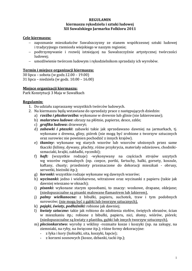 REGULAMIN kiermaszu rękodzieła i sztuki ludowej XII Suwalskiego Jarmarku Folkloru 2011 Cele kiermaszu: zapoznanie mieszkańców Suwalszczyzny ze stanem współczesnej sztuki ludowej i tradycyjnego rzemiosła wiejskiego w naszym regionie; podtrzymywanie i rozwój istniejącej na Suwalszczyźnie artystycznej twórczości ludowej; umożliwienie twórcom ludowym i rękodzielnikom sprzedaży ich wyrobów. Termin i miejsce organizacji kiermaszu: 30 lipca – sobota (w godz.12.00 – 19.00) 31 lipca – niedziela (w godz. 10.00 – 16.00) Miejsce organizacji kiermaszu: Park Konstytucji 3 Maja w Suwałkach Regulamin: 1. Do udziału zapraszamy wszystkich twórców ludowych. 2. Na kiermaszu będą wstawiane do sprzedaży prace z następujących dziedzin: a) rzeźba i płaskorzeźba: wykonane w drewnie lub glinie (nie lakierowane); b) malarstwo ludowe: obrazy na płótnie, papierze, desce, szkle; c) grafika ludowa: drzeworyt; d) zabawki i ptaszki: zabawki takie jak sprzedawano dawniej na jarmarkach, tj. wykonane z drewna, gliny, piórek (nie mogą być zrobione z tworzyw sztucznych oraz surowiec nie powinien pochodzić z innych krajów). e) tkaniny: wykonane wg starych wzorów lub wzorców ułożonych przez same tkaczki (kilimy, dywany, płachty, różne przykrycia, materiały odzieżowe, chodnikiszmaciaki, krajki, zakładki, ręczniki); f) haft: (wszystkie rodzaje) -wykonywany na częściach strojów uszytych wg wzorów regionalnych (np. czepce, portki, fartuchy, halki, gorsety, koszule, kaftany, chusty; przedmioty przeznaczone do dekoracji mieszkań - obrusy, serwetki, bieżniki itp.); g) koronki: wszystkie rodzaje wykonane wg dawnych wzorów; h) wycinanki: jedno i wielobarwne, witrażowe oraz wycinanki z papieru (takie jak dawniej wieszano w oknach); i) pisanki: wykonane starym sposobami, to znaczy: woskowe, drapane, oklejane; (niedopuszczalne są pisanki malowane flamastrem lub lakierem). j) palmy wielkanocne: z bibułki, papieru, suchotek, traw i tym podobnych surowców; (nie mogą być z gąbki lub tworzyw sztucznych). k) pająki, światy, podłaźniki: robione jak dawniej; l) kwiaty sztuczne: takie jak robiono do zdobienia stołów, świętych obrazów, ścian w mieszkaniu itp.; robione z bibułki, papieru, nici, słomy, wiórów, piórek; (niedopuszczalne są kwiaty z plastiku, gąbki lub innych tworzyw sztucznych). m) plecionkarstwo: wyroby z wikliny -rozmaite kosze i koszyki (np. na zakupy, na ziemniaki, na ryby, na święcone itp.); różne formy dekoracyjne: - z łyka i kory (kobiałki, sita, koszyki, łapcie); - z korzeni sosnowych (kosze, dzbanki, tacki itp.); 1 ze słomy (miarki, pojemniki, dzbany, koszyki, maty, kapelusze, zabawki, buty itp.); - z trawy (tacki, maty); - z rogożyny (koszyki, maty, zabawki) n) kaflarstwo: oparte na wzorach ludowych; o) garncarstwo: dzbanki, dzbany, donice, makutry, miski... p) bednarstwo: różne rodzaje naczyń; q) kowalstwo: różne okucia, zawiasy, krzyże, sygnatury, drobne ozdoby (sprzączki, spinki, fajki itp.); wyroby nie mogą być spawane lub lane. 3. Od opłat za udział w kiermaszu ( pobieranych przez organizatora –ROKIS) zwolnieni są: twórcy ludowi wykonujący tradycyjne rękodzieło ludowe oraz zrzeszeni w STL-u, członkowie Klubu Twórcy Ludowego działającego w ROKiS. Zwolnienia dotyczą również twórców ludowych zaproszonych przez ROKiS z Litwy, Białorusi i Ukrainy. 4. Ponadto informujemy, że na terenie miasta Suwałki pobierana jest również opłata targowa zgodnie z Uchwałą Rady Miejskiej w Suwałkach. Opłatę targową pobierają inkasenci Targowisk Miejskich w Suwałkach. 5. Zgodnie art. 3. ustawy z dnia 25 sierpnia 2006 r. o bezpieczeństwie żywności i żywienia a także z art. 14, 17 i 18 Rozporządzenia (WE) Nr 178/2002 ustanawiającego ogólne zasady i wymagania prawa żywnościowego oraz art. 1. Rozporządzenia (WE) NR 852/2004 Parlamentu Europejskiego i Rady z dnia 29 kwietnia 2004 r. w sprawie higieny środków spożywczych – tylko żywność bezpieczna dla zdrowia i życia człowieka może znajdować się w obrocie, a odpowiedzialność za bezpieczeństwo żywności ponoszą przedsiębiorcy produkujący lub wprowadzający żywność do obrotu. - Warunki uczestnictwa w kiermaszu: 1. Uczestnicy Kiermaszu przyjeżdżają na własny koszt. 2. Organizatorzy zapewniają miejsce do ustawienia stoiska. 3. Twórcy chcący wziąć udział w kiermaszu powinni przesłać do dnia 21 lipca 2011 r. kartę uczestnictwa na adres: Regionalny Ośrodek Kultury i Sztuki, 16-400 Suwałki, ul. Noniewicza 71 lub faksem +87 566 49 34. 4. Warunkiem uczestnictwa w kiermaszu jest powiadomienie przez organizatora (Regionalny Ośrodek Kultury i Sztuki w Suwałkach) o przyjęciu zgłoszenia, telefonicznie lub e-mail wraz z jednoczesnym uzgodnieniem warunków organizacji stoiska. Informacji telefonicznych udzielają: Helena Kozłowska, Mirosław Nalaskowski (087) 566 42 11, 563 51 76, [email protected] 2
