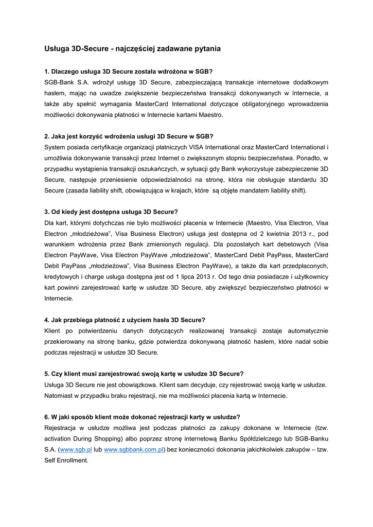 Usługa 3D-Secure - najczęściej zadawane pytania 1. Dlaczego usługa 3D Secure została wdrożona w SGB? SGB-Bank S.A. wdrożył usługę 3D Secure, zabezpieczającą transakcje internetowe dodatkowym hasłem, mając na uwadze zwiększenie bezpieczeństwa transakcji dokonywanych w Internecie, a także aby spełnić wymagania MasterCard International dotyczące obligatoryjnego wprowadzenia możliwości dokonywania płatności w Internecie kartami Maestro. 2. Jaka jest korzyść wdrożenia usługi 3D Secure w SGB? System posiada certyfikacje organizacji płatniczych VISA International oraz MasterCard International i umożliwia dokonywanie transakcji przez Internet o zwiększonym stopniu bezpieczeństwa. Ponadto, w przypadku wystąpienia transakcji oszukańczych, w sytuacji gdy Bank wykorzystuje zabezpieczenie 3D Secure, następuje przeniesienie odpowiedzialności na stronę, która nie obsługuje standardu 3D Secure (zasada liability shift, obowiązująca w krajach, które są objęte mandatem liability shift). 3. Od kiedy jest dostępna usługa 3D Secure? Dla kart, którymi dotychczas nie było możliwości płacenia w Internecie (Maestro, Visa Electron, Visa Electron „młodzieżowa”, Visa Business Electron) usługa jest dostępna od 2 kwietnia 2013 r., pod warunkiem wdrożenia przez Bank zmienionych regulacji. Dla pozostałych kart debetowych (Visa Electron PayWave, Visa Electron PayWave „młodzieżowa”, MasterCard Debit PayPass, MasterCard Debit PayPass „młodzieżowa”, Visa Business Electron PayWave), a także dla kart przedpłaconych, kredytowych i charge usługa dostępna jest od 1 lipca 2013 r. Od tego dnia posiadacze i użytkownicy kart powinni zarejestrować kartę w usłudze 3D Secure, aby zwiększyć bezpieczeństwo płatności w Internecie. 4. Jak przebiega płatność z użyciem hasła 3D Secure? Klient po potwierdzeniu danych dotyczących realizowanej transakcji zostaje automatycznie przekierowany na stronę banku, gdzie potwierdza dokonywaną płatność hasłem, które nadał sobie podczas rejestracji w usłudze 3D Secure. 5. Czy klient musi zarejestrować swoją kartę w usłudze 3D Secure? Usługa 3D Secure nie jest obowiązkowa. Klient sam decyduje, czy rejestrować swoją kartę w usłudze. Natomiast w przypadku braku rejestracji, nie ma możliwości płacenia kartą w Internecie. 6. W jaki sposób klient może dokonać rejestracji karty w usłudze? Rejestracja w usłudze możliwa jest podczas płatności za zakupy dokonane w Internecie (tzw. activation During Shopping) albo poprzez stronę internetową Banku Spółdzielczego lub SGB-Banku S.A. (www.sgb.pl lub www.sgbbank.com.pl) bez konieczności dokonania jakichkolwiek zakupów – tzw. Self Enrollment. 7. W jaki sposób umożliwić płacenie kartami Maestro/Visa Electron/Visa Electron młodzieżowa /Visa Business Electron w Internecie ? należy podpisać z klientem (posiadaczem rachunku) umowę o kartę w umowie ustalić hasło tymczasowe 3D-Secure wprowadzić hasło 3D-Secure do systemu Karty SGB (po 24 godzinach klient może zarejestrować kartę w 3D-Secure i płacić w Internecie – dotyczy wniosków złożonych w dni robocze) W przypadku użytkownika karty, hasło jest ustalane na odpowiednim wniosku, a dalsza procedura przebiega analogicznie jak w przypadku posiadacza karty. 8. Czy dla wcześniej wydanych kart Maestro/Visa Electron/Visa Electron młodzieżowa /Visa Business Electron można udostępnić możliwość płacenia w Internecie ? Tak. W takiej sytuacji należy: po wdrożeniu nowych regulacji – podpisać z klientem (posiadaczem rachunku) nową umowę o kartę w umowie ustalić hasło tymczasowe 3D-Secure wprowadzić hasło tymczasowe 3D-Secure do systemu Karty SGB (po 24 godzinach klient może zarejestrować kartę w 3D-Secure i płacić w Internecie – dotyczy wniosków złożonych w dni robocze). W przypadku użytkownika karty, hasło jest ustalane na odpowiednim wniosku, a dalsza procedura przebiega analogicznie jak w przypadku posiadacza karty. 9. Ile znaków może mieć hasło tymczasowe 3D-Secure? Hasło tymczasowe może mieć maksymalnie 12 znaków. Podczas ustalania hasła tymczasowego, nie należy posługiwać się polskimi znakami (ą,ę,ź,ć itd.) 10. Ile znaków może mieć hasło 3D-Secure nadane przez klienta? Hasło nadawane przez klienta podczas rejestracji w usłudze może mieć maksymalnie 15 znaków. 11. Jakie dane należy podać podczas rejestracji w usłudze 3D-Secure? Klient podczas rejestracji w usłudze podaje następujące dane: nazwisko panieńskie matki, datę ważności karty, datę urodzenia, a w przypadku kart Maestro, Visa Electron, Visa Electron „młodzieżowa” i Visa Business Electron, również hasło tymczasowe nadane podczas podpisywania umowy o kartę. 12. Czy przy wpisywaniu danych podczas rejestracji karty mają znaczenie małe i duże litery? Wielkość liter ma znaczenie jedynie przy wpisywaniu hasła tymczasowego. 13. Kiedy klient może zablokować kartę w usłudze 3 D-Secure? Karta zostaje zablokowana w usłudze 3D Secure w przypadku, gdy klient wprowadzi błędne dane przy rejestracji karty lub poda błędne hasło do usługi. 14. Jak i kiedy można odblokować zablokowaną kartę w usłudze 3D-Secure? W celu odblokowania karty posiadacz/użytkownik powinien skontaktować się z oddziałem Banku, który wydał kartę lub z Call Center pod numerem telefonu 801 34 00 08 lub 61 647 28 90. Pracownicy Banku mogą odblokować kartę w systemie Karty SGB - opcja 6.1 Karty – lista (karta zostanie odblokowana po 24 godzinach – dotyczy wniosków złożonych w dni robocze) lub za pośrednictwem Help Desk pod numerem telefonu 61 631 22 33 albo przez system HelpDesk. 15. W jaki sposób klient może nadać nowe hasło do usługi 3D-Secure jeśli zapomniał poprzednie? Na ekranie startowym usługi 3DSecure znajduje się opcja „zapomniałeś hasła”, dzięki której można nadać nowe hasło. 16. Jak przebiega płatność w Internecie, gdy skl