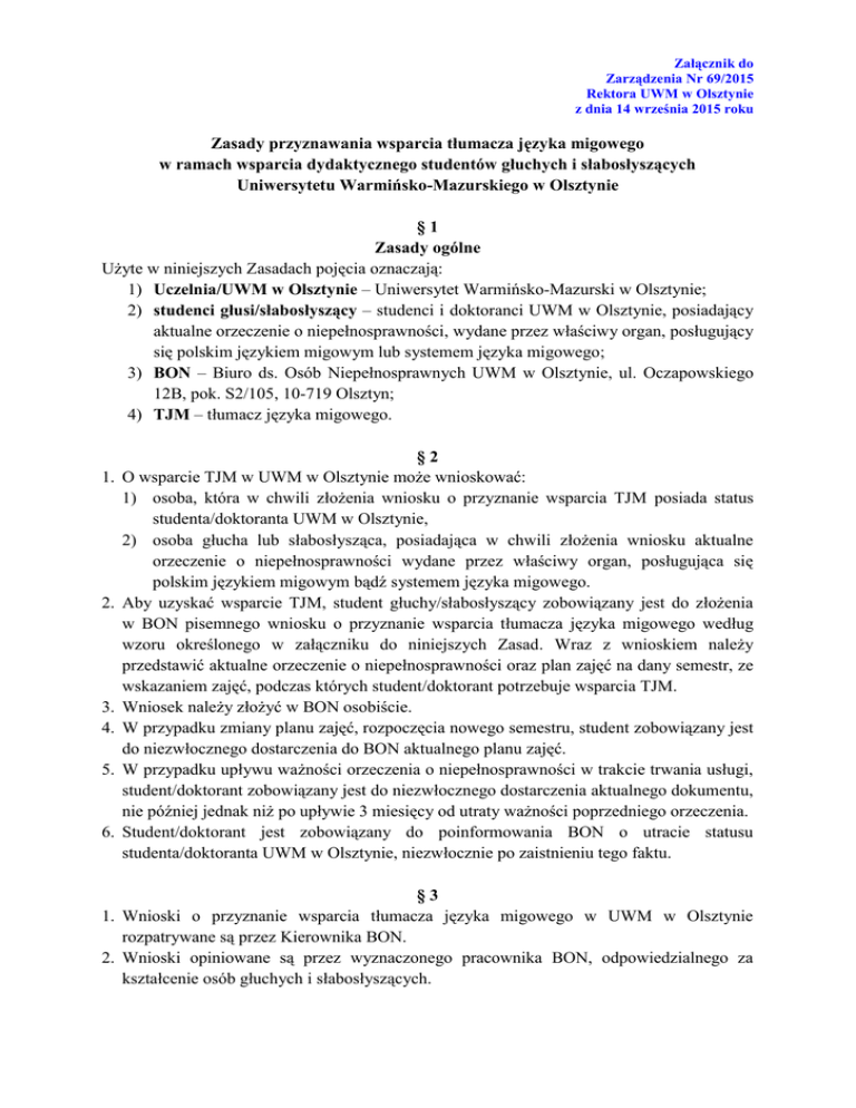 Załącznik do Zarządzenia Nr 69/2015 Rektora UWM w Olsztynie z dnia 14 września 2015 roku Zasady przyznawania wsparcia tłumacza języka migowego w ramach wsparcia dydaktycznego studentów głuchych i słabosłyszących Uniwersytetu Warmińsko-Mazurskiego w Olsztynie §1 Zasady ogólne Użyte w niniejszych Zasadach pojęcia oznaczają: 1) Uczelnia/UWM w Olsztynie – Uniwersytet Warmińsko-Mazurski w Olsztynie; 2) studenci głusi/słabosłyszący – studenci i doktoranci UWM w Olsztynie, posiadający aktualne orzeczenie o niepełnosprawności, wydane przez właściwy organ, posługujący się polskim językiem migowym lub systemem języka migowego; 3) BON – Biuro ds. Osób Niepełnosprawnych UWM w Olsztynie, ul. Oczapowskiego 12B, pok. S2/105, 10-719 Olsztyn; 4) TJM – tłumacz języka migowego. 1. 2. 3. 4. 5. 6. §2 O wsparcie TJM w UWM w Olsztynie może wnioskować: 1) osoba, która w chwili złożenia wniosku o przyznanie wsparcia TJM posiada status studenta/doktoranta UWM w Olsztynie, 2) osoba głucha lub słabosłysząca, posiadająca w chwili złożenia wniosku aktualne orzeczenie o niepełnosprawności wydane przez właściwy organ, posługująca się polskim językiem migowym bądź systemem języka migowego. Aby uzyskać wsparcie TJM, student głuchy/słabosłyszący zobowiązany jest do złożenia w BON pisemnego wniosku o przyznanie wsparcia tłumacza języka migowego według wzoru określonego w załączniku do niniejszych Zasad. Wraz z wnioskiem należy przedstawić aktualne orzeczenie o niepełnosprawności oraz plan zajęć na dany semestr, ze wskazaniem zajęć, podczas których student/doktorant potrzebuje wsparcia TJM. Wniosek należy złożyć w BON osobiście. W przypadku zmiany planu zajęć, rozpoczęcia nowego semestru, student zobowiązany jest do niezwłocznego dostarczenia do BON aktualnego planu zajęć. W przypadku upływu ważności orzeczenia o niepełnosprawności w trakcie trwania usługi, student/doktorant zobowiązany jest do niezwłocznego dostarczenia aktualnego dokumentu, nie później jednak niż po upływie 3 miesięcy od utraty ważności poprzedniego orzeczenia. Student/doktorant jest zobowiązany do poinformowania BON o utracie statusu studenta/doktoranta UWM w Olsztynie, niezwłocznie po zaistnieniu tego faktu. §3 1. Wnioski o przyznanie wsparcia tłumacza języka migowego w UWM w Olsztynie rozpatrywane są przez Kierownika BON. 2. Wnioski opiniowane są przez wyznaczonego pracownika BON, odpowiedzialnego za kształcenie osób głuchych i słabosłyszących. 3. Uczelnia zastrzega sobie prawo do odrzucenia wniosku o przyznanie tłumacza języka migowego, w przypadku gdy: 1) osoba ubiegająca się o przyznanie wsparcia tłumacza języka migowego nie spełnia któregokolwiek z warunków określonych w § 2 pkt 1; 2) zakres wnioskowanego wsparcia przekracza poza ramy określone w § 4 niniejszych Zasad; 3) zakres wparcia na podstawie złożonych wniosków przekracza budżet przewidziany przez Uczelnię na ten cel w danym roku akademickim. §4 Zakres usług tłumacza języka migowego obejmuje tłumaczenie na język migowy: 1) treści przekazywanych podczas zajęć dydaktycznych przewidzianych programem studiów studenta/doktoranta, któremu przyznano wsparcie; 2) treści przekazywanych podczas konsultacji z pracownikami dydaktycznymi UWM w Olsztynie; 3) treści przekazywanych podczas zaliczeń, egzaminów, seminariów dyplomowych, obrony prac dyplomowych studenta/doktoranta, któremu przyznano wsparcie; 4) w czasie wizyt w dziekanacie, bibliotece, rektoracie i innych tego typu czynnościach związanych bezpośrednio z udziałem studenta, któremu przyznano wsparcie w procesie kształcenia oraz dopełnianiu formalności na uczelni. §5 Wymagania wobec kandydatów na tłumacza języka migowego 1. Warunkiem podjęcia pracy TJM na UWM w Olsztynie jest posiadanie odpowiednich kwalifikacji i doświadczenia. Od kandydata, który będzie pełnił funkcję TJM wymaga się stworzenia odpowiednich relacji (szacunku, zrozumienia itp.) pomiędzy nim, a studentem/doktorantem. Samodzielny charakter pracy wymusza zatrudnianie osób z co najmniej średnim wykształceniem. 2. Wykonawca jest zobowiązany do udokumentowania kwalifikacji i doświadczenia poprzez złożenie dokumentów potwierdzających: 1) co najmniej średnie wykształcenie; 2) kompetencje tłumacza języka migowego; 3) minimum roczne doświadczenie w świadczeniu usług tłumacza. 3. Podczas pracy TJM zobowiązany jest kierować się dobrem studenta/doktoranta objętego wsparciem, z uwzględnieniem wszelkich zasad etyki oraz obiektywizmu podczas wykonywanych tłumaczeń. 4. Wykonując swoje obowiązki wynikające z zawartej umowy TJM zobowiązany jest do zachowania tajemnicy i prywatności studenta/ doktoranta, zachowując dla siebie wszelkie jego sprawy osobiste. §6 Zasady zatrudniania i wynagradzania tłumacza języka migowego 1. Zatrudnienie TJM na UWM w Olsztynie, następuje w drodze postępowania o udzielenie zamówienia publicznego, zgodnie z ustawą z dnia 29.01.2004r. Prawo zamówień publicznych. 2. TJM zatrudniony jest na podstawie umowy zlecenia, a jego pracę koordynuje pracownik BON, odpowiedzialny za kształcenie osób głuchych i słabosłyszących na UWM w Olsztynie. 3. Umowa zlecenia zawierana z TJM określa zasady świadczenia usług tłumaczenia oraz ich zakres. TJM oprócz umowy podpisuje oświadczenie, w którym deklaruje, iż stan zdrowia pozwala mu na wykonywanie powierzonych mu zadań, dochowa dyskrecji i tajemnicy w związku z wykonywanymi zadaniami względem studenta/doktoranta objętego wsparciem, a także, że zapoznał się z niniejszymi zasadami oraz zobowiązuje się do ich przestrzegania. 4. Zakres usług oraz wymiar czasu pracy TJM uzależniony jest od potrzeb określonych przez studenta/doktoranta we wniosku złożonym w BON. 5. Za wykonanie zlecenia TJM otrzyma wynagrodzenie proporcjonalne do przepracowanej liczby godzin pracy na rzecz studenta/doktoranta, dl