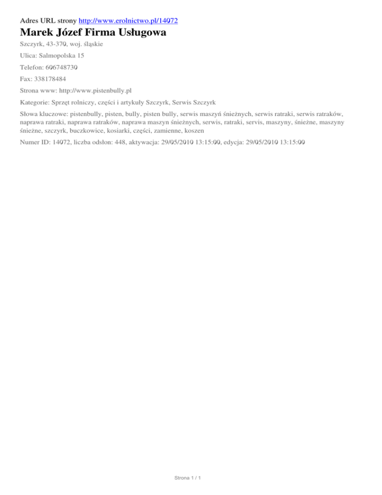 Adres URL strony http://www.erolnictwo.pl/14072 Marek Józef Firma Usługowa Szczyrk, 43-370, woj. śląskie Ulica: Salmopolska 15 Telefon: 606748730 Fax: 338178484 Strona www: http://www.pistenbully.pl Kategorie: Sprzęt rolniczy, części i artykuły Szczyrk, Serwis Szczyrk Słowa kluczowe: pistenbully, pisten, bully, pisten bully, serwis maszyń śnieżnych, serwis ratraki, serwis ratraków, naprawa ratraki, naprawa ratraków, naprawa maszyn śnieżnych, serwis, ratraki, servis, maszyny, śnieżne, maszyny śnieżne, szczyrk, buczkowice, kosiarki, części, zamienne, koszen Numer ID: 14072, liczba odsłon: 448, aktywacja: 29/05/2010 13:15:00, edycja: 29/05/2010 13:15:00 Strona 1 / 1