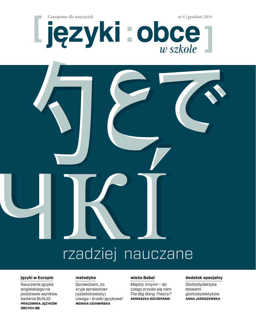 Czasopismo dla nauczycieli nr 4 | grudzień 2014 rzadziej nauczane języki w Europie metodyka wieża Babel dodatek specjalny Nauczanie języka angielskiego na podstawie wyników badania BUNJO Sprawdzam, co kryje sprawdzian (szóstoklasisty) Uwaga – środki językowe! Między Innymi – do czego przyda się nam The Big Bang Theory? Glottodydaktyka słowami glottodydaktyków AGNIESZKA SZCZEPANIK ANNA JAROSZEWSKA PRACOWNIA JĘZYKÓW OBCYCH IBE MONIKA CICHMIŃSKA [ RADA PROGRAMOWA ] [ REDAKCJA ] prof. zw. dr hab. HANNA KOMOROWSKA, Instytut Anglistyki Uniwersytetu ANNA GRABOWSKA Warszawskiego, Instytut Filologii Angielskiej Szkoły Wyższej Psychologii Społecznej – przewodnicząca rady programowej „Języków Obcych w Szkole” MAŁGORZATA JANASZEK dr hab. ZOFIA BERDYCHOWSKA, prof. UJ, Instytut Germanistyki Uniwersytetu Jagiellońskiego – konsultacja: j. niemiecki dr WOJCIECH SOSNOWSKI, kierownik Zakładu Języka Rosyjskiego Szkoły Języków Obcych Uniwersytetu Warszawskiego – konsultacja: j. rosyjski ALEKSANDRA RATUSZNIAK, dyrektor ds. kształcenia dwujęzycznego XIII LO w Łodzi – konsultacja: j. romańskie Badań Edukacyjnych – konsultacja: wymiar europejski nauczania języków obcych dr RADOSŁAW KUCHARCZYK, dyrektor ds. naukowych Instytutu Romanistyki Uniwersytetu Warszawskiego – konsultacja: wielojęzyczność i wielokulturowość DANUTA SZCZĘSNA, Państwowa Komisja Poświadczania Znajomości Języka Polskiego jako Obcego – konsultacja: język polski jako obcy JOLANTA URBANIK, pełnomocnik rektora ds. Procesu Bolońskiego, Uniwersytet Warszawski – konsultacja: internacjonalizacja szkolnictwa wyższego ANNA DAKOWICZ-NAWROCKA , zastępca dyrektora Departamentu Jakości Edukacji, Ministerstwo Edukacji Narodowej – konsultacja: języki obce w kształceniu ogólnym nr 4 | grudzień 2014 [ WYDAWCA ] FUNDACJA ROZWOJU SYSTEMU EDUKACJI ul. Mokotowska 43 00-551 Warszawa www.frse.org.pl rzadziej nauczane języki w Europie metodyka wieża Babel dodatek specjalny Nauczanie języka angielskiego na podstawie wyników badania BUNJO Sprawdzam, co kryje sprawdzian (szóstoklasisty) Uwaga – środki językowe! Między Innymi – do czego przyda się nam The Big Bang Theory? Glottodydaktyka słowami glottodydaktyków AGNIESZKA SZCZEPANIK ANNA JAROSZEWSKA PRACOWNIA JĘZYKÓW OBCYCH IBE MONIKA CICHMIŃSKA JĘZYKI OBCE W SZKOLE nr 4/2014 sekretarz redakcji | [email protected] BEATA PŁATOS redaktor działu METODYKA i POMYSŁY DLA AKTYWNYCH MAŁGORZATA CZŁONKOWSKA-NAUMIUK redaktor działu WIEŻA BABEL AGNIESZKA DRYJAŃSKA redaktor działu METODYKA, TEMAT NUMERU dr MAGDALENA SZPOTOWICZ, lider Pracowni Języków Obcych w Instytucie Czasopismo dla nauczycieli redaktor naczelna | [email protected] MATEUSZ JEŻOWSKI redaktor działu JĘZYKI W EUROPIE dr AGNIESZKA KAROLCZUK redakcja i korekta WERONIKA WALASEK-JORDAN korekta WERONIKA SKACZKOWSKA redaktor strony internetowej JOANNA GARBACIK redaktor artystyczny TAKE MEDIA projekt layoutu pisma RZECZYOBRAZKOWE.PL okładka Autorów zainteresowanych publikowaniem artykułów zapraszamy do kontaktu z redakcją: [email protected]. Jesteśmy otwarci na Państwa pomysły i propozycje ciekawych tekstów. Informacje edytorskie dla autorów znajdują się na stronie www.jows.pl. [ ADRES REDAKCJI ] JĘZYKI OBCE W SZKOLE ul. Mokotowska 43 00-551 Warszawa tel. 22 46 31 367 e-mail: [email protected] | www.jows.pl PL ISSN 0446-7965 © Fundacja Rozwoju Systemu Edukacji, Warszawa 2014 Fotografia wykorzystana na stronie 1 autorstwa Ewy Bełdowskiej. Grafika wykorzystana na stronie 8 pochodzi z oficjalnych materiałów promocyjnych programu Erasmus+. Fotografie wykorzystane na stronach: 26, 67 pochodzą z agencji fotograficznej Fotolia. Fotografie na stronach 117-118, 120 pochodzą ze zbiorów autorki artykułu. Grafika na stronie 127 autorstwa Pawła Przybylskiego. Grafika na stronach 139-141 autorstwa Izabeli Witkowskiej. Przedruk materiałów zamieszczonych w czasopiśmie w całości lub części możliwy jest wyłącznie za zgodą redakcji. Cytowanie oraz wykorzystywanie danych empirycznych dozwolone jest z podaniem źródła. Publikacja sfinansowana z funduszy Komisji Europejskiej w ramach programu Erasmus+. Komisja Europejska nie ponosi odpowiedzialności za treść umieszczoną w publikacji. Publikacja bezpłatna Od redakcji O ddajemy w Państwa ręce ostatni w tym roku numer „Języków Obcych w Szkole”. Kończymy tym samym dwuletni cykl wydań prezentujących zagadnienia związane z dydaktyką języków obcych nauczanych w polskich szkołach. Nie zapominajmy jednak, że nasi uczniowie i studenci uczą się nie tylko tzw. dużych języków. Oferta językowa szkół i uczelni wyższych w Polsce obejmuje również naukę tzw. języków rzadziej nauczanych (ang. less-widely taught languages). W grudniowym numerze JOwS znajdą Państwo artykuły dotyczące nauczania języków naszych sąsiadów, nieco bardziej egzotycznych języków, takich jak: węgierski czy irlandzki oraz, cieszących się coraz większą popularnością wśród młodzieży i studentów, języków orientalnych, takich jak: chiński i japoński. Co skłoniło nas do poświęcenia łamów naszego czasopisma nauczaniu języków, których nauką, jak pisze w swoim artykule hungarystka dr Csilla Gizińska, zajmują się zazwyczaj, miłośnicy lingwistycznej egzotyki? Przede wszystkim fakt, że biegłe posługiwanie się językami globalnymi nie jest już wcale gwarantem znalezienia pracy na zglobalizowanym rynku. Bardzo często atutem wyróżniającym młodego człowieka rozpoczynającego karierę zawodową jest właśnie znajomość tzw. małego lub egzotycznego języka. Dlatego też artykuły prezentujące rzadziej nauczane języki, mogą posłużyć Państwu do zachęcenia tegorocznych maturzystów do wyboru studiów na specjalizacji węgierskiej, fińskiej czy ukraińskiej. W niniejszym numerze oprócz artykułów poświęconych zagadnieniom stricte metodycznym związanym z nauką wymow