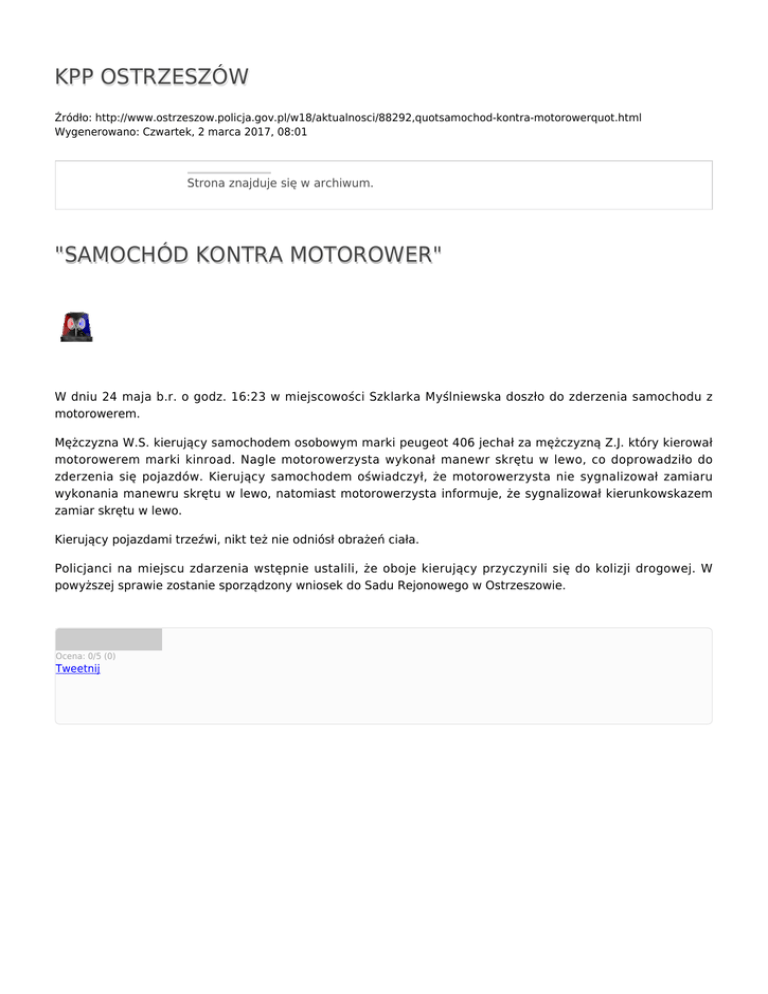 KPP OSTRZESZÓW Źródło: http://www.ostrzeszow.policja.gov.pl/w18/aktualnosci/88292,quotsamochod-kontra-motorowerquot.html Wygenerowano: Czwartek, 2 marca 2017, 08:01 Strona znajduje się w archiwum. "SAMOCHÓD KONTRA MOTOROWER" W dniu 24 maja b.r. o godz. 16:23 w miejscowości Szklarka Myślniewska doszło do zderzenia samochodu z motorowerem. Mężczyzna W.S. kierujący samochodem osobowym marki peugeot 406 jechał za mężczyzną Z.J. który kierował motorowerem marki kinroad. Nagle motorowerzysta wykonał manewr skrętu w lewo, co doprowadziło do zderzenia się pojazdów. Kierujący samochodem oświadczył, że motorowerzysta nie sygnalizował zamiaru wykonania manewru skrętu w lewo, natomiast motorowerzysta informuje, że sygnalizował kierunkowskazem zamiar skrętu w lewo. Kierujący pojazdami trzeźwi, nikt też nie odniósł obrażeń ciała. Policjanci na miejscu zdarzenia wstępnie ustalili, że oboje kierujący przyczynili się do kolizji drogowej. W powyższej sprawie zostanie sporządzony wniosek do Sadu Rejonowego w Ostrzeszowie. Ocena: 0/5 (0) Tweetnij