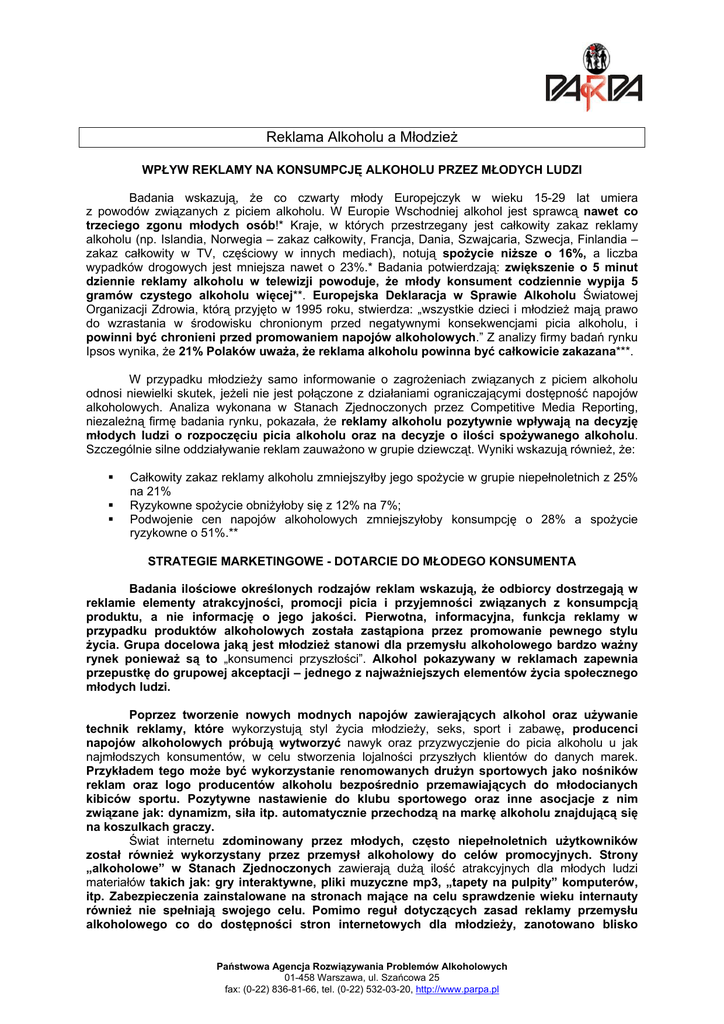 Reklama Alkoholu a Młodzież WPŁYW REKLAMY NA KONSUMPCJĘ ALKOHOLU PRZEZ MŁODYCH LUDZI Badania wskazują, że co czwarty młody Europejczyk w wieku 15-29 lat umiera z powodów związanych z piciem alkoholu. W Europie Wschodniej alkohol jest sprawcą nawet co trzeciego zgonu młodych osób!* Kraje, w których przestrzegany jest całkowity zakaz reklamy alkoholu (np. Islandia, Norwegia – zakaz całkowity, Francja, Dania, Szwajcaria, Szwecja, Finlandia – zakaz całkowity w TV, częściowy w innych mediach), notują spożycie niższe o 16%, a liczba wypadków drogowych jest mniejsza nawet o 23%.* Badania potwierdzają: zwiększenie o 5 minut dziennie reklamy alkoholu w telewizji powoduje, że młody konsument codziennie wypija 5 gramów czystego alkoholu więcej**. Europejska Deklaracja w Sprawie Alkoholu Światowej Organizacji Zdrowia, którą przyjęto w 1995 roku, stwierdza: „wszystkie dzieci i młodzież mają prawo do wzrastania w środowisku chronionym przed negatywnymi konsekwencjami picia alkoholu, i powinni być chronieni przed promowaniem napojów alkoholowych.” Z analizy firmy badań rynku Ipsos wynika, że 21% Polaków uważa, że reklama alkoholu powinna być całkowicie zakazana***. W przypadku młodzieży samo informowanie o zagrożeniach związanych z piciem alkoholu odnosi niewielki skutek, jeżeli nie jest połączone z działaniami ograniczającymi dostępność napojów alkoholowych. Analiza wykonana w Stanach Zjednoczonych przez Competitive Media Reporting, niezależną firmę badania rynku, pokazała, że reklamy alkoholu pozytywnie wpływają na decyzję młodych ludzi o rozpoczęciu picia alkoholu oraz na decyzje o ilości spożywanego alkoholu. Szczególnie silne oddziaływanie reklam zauważono w grupie dziewcząt. Wyniki wskazują również, że: Całkowity zakaz reklamy alkoholu zmniejszyłby jego spożycie w grupie niepełnoletnich z 25% na 21% Ryzykowne spożycie obniżyłoby się z 12% na 7%; Podwojenie cen napojów alkoholowych zmniejszyłoby konsumpcję o 28% a spożycie ryzykowne o 51%.** STRATEGIE MARKETINGOWE - DOTARCIE DO MŁODEGO KONSUMENTA Badania ilościowe określonych rodzajów reklam wskazują, że odbiorcy dostrzegają w reklamie elementy atrakcyjności, promocji picia i przyjemności związanych z konsumpcją produktu, a nie informację o jego jakości. Pierwotna, informacyjna, funkcja reklamy w przypadku produktów alkoholowych została zastąpiona przez promowanie pewnego stylu życia. Grupa docelowa jaką jest młodzież stanowi dla przemysłu alkoholowego bardzo ważny rynek ponieważ są to „konsumenci przyszłości”. Alkohol pokazywany w reklamach zapewnia przepustkę do grupowej akceptacji – jednego z najważniejszych elementów życia społecznego młodych ludzi. Poprzez tworzenie nowych modnych napojów zawierających alkohol oraz używanie technik reklamy, które wykorzystują styl życia młodzieży, seks, sport i zabawę, producenci napojów alkoholowych próbują wytworzyć nawyk oraz przyzwyczjenie do picia alkoholu u jak najmłodszych konsumentów, w celu stworzenia lojalności przyszłych klientów do danych marek. Przykładem tego może być wykorzystanie renomowanych drużyn sportowych jako nośników reklam oraz logo producentów alkoholu bezpośrednio przemawiających do młodocianych kibiców sportu. Pozytywne nastawienie do klubu sportowego oraz inne asocjacje z nim związane jak: dynamizm, siła itp. automatycznie przechodzą na markę alkoholu znajdującą się na koszulkach graczy. Świat internetu zdominowany przez młodych, często niepełnoletnich użytkowników został również wykorzystany przez przemysł alkoholowy do celów promocyjnych. Strony „alkoholowe” w Stanach Zjednoczonych zawierają dużą ilość atrakcyjnych dla młodych ludzi materiałów takich jak: gry interaktywne, pliki muzyczne mp3, „tapety na pulpity” komputerów, itp. Zabezpieczenia zainstalowane na stronach mające na celu sprawdzenie wieku internauty również nie spełniają swojego celu. Pomimo reguł dotyczących zasad reklamy przemysłu alkoholowego co do dostępności stron internetowych dla młodzieży, zanotowano blisko Państwowa Agencja Rozwiązywania Problemów Alkoholowych 01-458 Warszawa, ul. Szańcowa 25 fax: (0-22) 836-81-66, tel. (0-22) 532-03-20, http://www.parpa.pl 700.000 (13,1 % z całości) wizyt młodzieży poniżej 21 roku życia - informuje Center on Alcohol Marketing and Youth (CAMY) w najnowszym raporcie dotyczącym aktywności przemysłu alkoholowego w Internecie****. ZAGROŻENIA ZWIĄZANE ZE WSTĄPIENIEM POLSKI DO UNII EUROPEJSKIEJ W kontekście wstąpienia naszego kraju do Unii Europejskiej pojawiają się kolejne zagrożenia dotyczące problematyki alkoholowej. Od maja 2004 roku będziemy mieć do czynienia z ułatwionym przepływem towarów, w tym napojów alkoholowych między pozostałymi krajami UE i Polską. Polska wstępując w struktury unijne udostępnia swój rynek dla nowych producentów alkoholu zjednoczonej Europy – zarówno dla towarów jak i machiny reklamowo – promocyjnej. Na rynku polskim pojawią się najwięksi światowi producenci alkoholowi, a co za tym idzie zacznie się walko o konsumentów. W związku z wejściem Polski w struktury Unii Europejskiej zostaną zniesione cła na napoje alkoholowe z importu – wiąże się tym obniżenie cen wybranych alkoholi nawet o jedną – trzecią, a co za tym idzie zwiększenie spożycia. Można spodziewac się prób łamania zasad odpowiedzialnej reklamy alkoholu zawartych w „Ustawie o wychowaniu w trzeźwości i przeciwdziałaniu alkoholizmowi” w celu bardziej efektywnej walki o klienta. Prawdopodobnie pojawią się szerokie działania przemysłu alkoholowego z zakresu public relations – działania wizerunkowe mające na celu stworzenie obrazu społecznie odpowiedzialnego producenta alkoholu. Wątpliwy jest jednak przekaz oraz społeczny efekt kampanii informacyjnych dotyczących spożycia alkoholu oraz problemów z tym