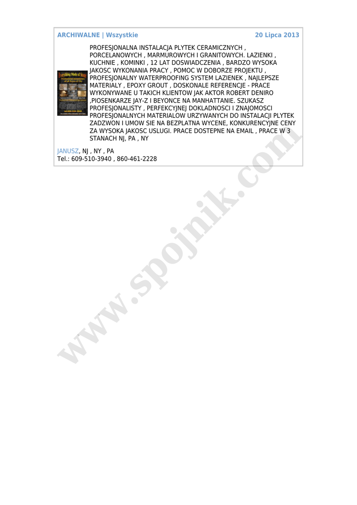 ARCHIWALNE | Wszystkie 20 Lipca 2013 w w w .s po .c o jn ik JANUSZ, NJ , NY , PA Tel.: 609-510-3940 , 860-461-2228 m PROFESJONALNA INSTALACJA PLYTEK CERAMICZNYCH , PORCELANOWYCH , MARMUROWYCH I GRANITOWYCH. LAZIENKI , KUCHNIE , KOMINKI , 12 LAT DOSWIADCZENIA , BARDZO WYSOKA JAKOSC WYKONANIA PRACY , POMOC W DOBORZE PROJEKTU , PROFESJONALNY WATERPROOFING SYSTEM LAZIENEK , NAJLEPSZE MATERIALY , EPOXY GROUT , DOSKONALE REFERENCJE - PRACE WYKONYWANE U TAKICH KLIENTOW JAK AKTOR ROBERT DENIRO ,PIOSENKARZE JAY-Z I BEYONCE NA MANHATTANIE. SZUKASZ PROFESJONALISTY , PERFEKCYJNEJ DOKLADNOSCI I ZNAJOMOSCI PROFESJONALNYCH MATERIALOW URZYWANYCH DO INSTALACJI PLYTEK ZADZWON I UMOW SIE NA BEZPLATNA WYCENE, KONKURENCYJNE CENY ZA WYSOKA JAKOSC USLUGI. PRACE DOSTEPNE NA EMAIL , PRACE W 3 STANACH NJ, PA , NY