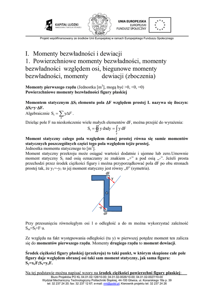Projekt współfinansowany ze środków Unii Europejskiej w ramach Europejskiego Funduszu Społecznego I. Momenty bezwładności i dewiacji 1. Powierzchniowe momenty bezwładności, momenty bezwładności względem osi, biegunowe momenty bezwładności, momenty dewiacji (zboczenia) Momenty pierwszego rzędu (Jednostka [m3], mogą być >0, <0, =0) Powierzchniowe momenty bezwładności figury płaskiej Momentem statycznym Sl elementu pola F względem prostej L nazywa się iloczyn: Sl=y·F. Algebraicznie Sl yF . F Dzieląc pole F na nieskończenie wiele małych elementów dF, można przejść do wyrażenia: Sl y dxdy y dF F Moment statyczny całego pola względem danej prostej równa się sumie momentów statycznych poszczególnych części tego pola względem tejże prostej. Jednostka momentu statycznego to [m3]. Moment statyczny przekroju może osiągać wartości dodatnie i ujemne lub zero.Umownie moment statyczny Si nad osią oznaczamy ze znakiem „+” a pod osią „-”. Jeżeli prosta przechodzi przez środek ciężkości figury i można przyporządkować pola dF po obu stronach prostej tak, że y1=-y1 to jej moment statyczny jest równy „0” (symetria). dF y -y dF Przy przesunięciu równoległym osi l o odległość a do m można wykorzystać zależność Sm=Sl+F·a. Ze względu na fakt występowania odległości (tu y) w pierwszej potędze moment ten zalicza się do momentów pierwszego rzędu. Momenty drugiego rzędu to moment dewiacji. Środek ciężkości figury płaskiej (przekroju) to taki punkt, w którym skupione całe pole figury daje względem obranej osi taki sam moment statyczny, jak sama figura: Sy=xcF;Sx=ycF. Na tej podstawie można napisać wzory na środek ciężkości powierzchni figury płaskiej: Biuro Projektów PO KL 04.01.02-128/10-00; 04.01.02-0026/10-00; 04.01.02-0027/10-00 Wydział Mechaniczny Technologiczny Politechniki Śląskiej, 44-100 Gliwice, ul. Konarskiego 18a p. 39 tel: 32 237 24 20; fax: 32 237 12 67; e-mail: [email protected]; Kierownik projektu tel: 32 237 24 26 Projekt współfinansowany ze środków Unii Europejskiej w ramach Europejskiego Funduszu Społecznego xc F x F i yc i i F y F i i i 4 Momenty drugiego rzędu (Jednostka [m ]) Moment bezwładności (geometryczny) pola względem osi(momenty bezwładności zawsze >0) Momentem bezwładności figury płaskiej o polu F względem osi x nazywa się wyrażenie: J x y 2dF F Momentem bezwładności figury płaskiej o polu F względem osi y nazywa się wyrażenie: J y x 2dF F Gdzie, x oznacza odległość elementu dF pola F od osi y, a y oznacza odległość dF od osi x. Biegunowym momentem bezwładności figury płaskiejo polu F względem punktu O nazywa się wyrażenie: (odległość ρ2=x2+y2) J O ρ 2dF x 2dF y 2dF F F F stąd JO J x J y Podsumowując, suma momentów bezwładności pola F względem dwóch osi prostopadłych do siebie równa jest biegunowemu momentowi bezwładności względem punktu O przecięcia się tych osi. Moment dewiacji – geometryczny – (moment zboczenia lub moment odśrodkowy) figury płaskiejo polu F względem osi x, y nazywa się wyrażenie: (momenty dewiacji mogą być >0, <0, =0) D xy xydF F y x ρ dF y x O Momenty drugiego rzędu wykorzystywane są często w wytrzymałości materiałów, gdzie liczy się je najczęściej względem prostych centralnych, tj. przechodzących przez środek ciężkości figury. Momenty takie nazywa się centralnymi momentami bezwładności figury płaskiej. Biuro Projektów PO KL 04.01.02-128/10-00; 04.01.02-0026/10-00; 04.01.02-0027/10-00 Wydział Mechaniczny Technologiczny Politechniki Śląskiej, 44-100 Gliwice, ul. Konarskiego 18a p. 39 tel: 32 237 24 20; fax: 32 237 12 67; e-mail: [email protected]; Kierownik projektu tel: 32 237 24 26 Projekt współfinansowany ze środków Unii Europejskiej w ramach Europejskiego Funduszu Społecznego W odróżnieniu od momentów statycznych, momenty bezwładności figur płaskich posiadają zawsze wartości dodatnie, ponieważ w wyrażeniach na nie odległość jest w drugiej potędze.Momenty dewiacji mogą być większe, mniejsze lub równe zero. Promień bezwładności Promieniem bezwładności pola F figury odpowiednio względem osi x i y oraz bieguna O nazywa się odpowiednio wyrażenia: J J J i x x , i y y , iO O , F F F 2 2 Na tej podstawie można zapisać równości: Jx=F·ix ,Jy=F·iy , JO=F·iO2, oraz iO2=ix2+iy2. Twierdzenie Steinera Moment bezwładności pola F figury względem prostej równa się momentowi bezwładności tej figury względem prostej do niej równoległej i przechodzącej przez środek ciężkości pola plus iloczyn pola F figury i kwadratu odległości obu prostych. y v a u Środek ciężkości b x O Jx=Ju+b2ForazJy=Jv+b2F Biuro Projektów PO KL 04.01.02-128/10-00; 04.01.02-0026/10-00; 04.01.02-0027/10-00 Wydział Mechaniczny Technologiczny Politechniki Śląskiej, 44-100 Gliwice, ul. Konarskiego 18a p. 39 tel: 32 237 24 20; fax: 32 237 12 67; e-mail: [email protected]; Kierownik projektu tel: 32 237 24 26 Projekt współfinansowany ze środków Unii Europejskiej w ramach Europejskiego Funduszu Społecznego Rysunek poglądowy Geometryczny moment bezwładności Wskaźnik wytrzymałości Biuro Projektów PO KL 04.01.02-128/10-00; 04.01.02-0026/10-00; 04.01.02-0027/10-00 Wydział Mechaniczny Technologiczny Politechniki Śląskiej, 44-100 Gliwice, ul. Konarskiego 18a p. 39 tel: 32 237 24 20; fax: 32 237 12 67; e-mail: [email protected]; Kierownik projektu tel: 32 237 24 26 Projekt współfinansowany ze środków Unii Europejskiej w ramach Europejskiego Funduszu Społecznego Przykład 1 Obliczyć z definicji moment statyczny pola prostokąta pokazanego na poniższym rysunku o bokach b i h względem prostej l, przechodzącej przez podstawę. b dF dy h y h½ l Oznaczając by·dy = ydF =dS1. Można na podstawie wcześniejszej definicji napisać: h h 0 0 Sl y dF y bdy b F bh2 h ydy F 2 2 Zad. 1. Dla figury przedstawionej w przykładzie 1 obliczyć z definicji momenty d