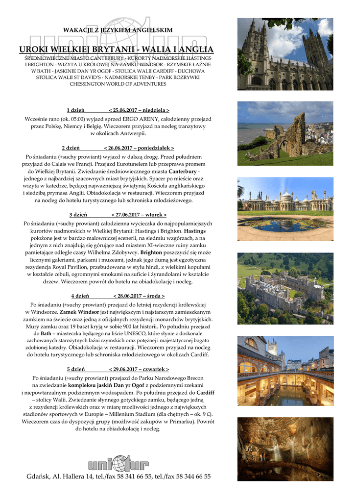 WAKACJE Z JĘZYKIEM ANGIELSKIM UROKI WIELKIEJ BRYTANII - WALIA I ANGLIA ŚREDNIOWIECZNE MIASTO CANTERBURY - KURORTY NADMORSKIE HASTINGS I BRIGHTON - WIZYTA U KRÓLOWEJ NA ZAMKU WINDSOR - RZYMSKIE ŁAŹNIE W BATH - JASKINIE DAN YR OGOF - STOLICA WALII CARDIFF - DUCHOWA STOLICA WALII ST DAVID’S - NADMORSKIE TENBY - PARK ROZRYWKI CHESSINGTON WORLD OF ADVENTURES 1 dzień < 25.06.2017 – niedziela > Wcześnie rano (ok. 05:00) wyjazd sprzed ERGO ARENY, całodzienny przejazd przez Polskę, Niemcy i Belgię. Wieczorem przyjazd na nocleg tranzytowy w okolicach Antwerpii. 2 dzień < 26.06.2017 – poniedziałek > Po śniadaniu (+suchy prowiant) wyjazd w dalszą drogę. Przed południem przyjazd do Calais we Francji. Przejazd Eurotunelem lub przeprawa promem do Wielkiej Brytanii. Zwiedzanie średniowiecznego miasta Canterbury jednego z najbardziej szacownych miast brytyjskich. Spacer po mieście oraz wizyta w katedrze, będącej najważniejszą świątynią Kościoła anglikańskiego i siedzibą prymasa Anglii. Obiadokolacja w restauracji. Wieczorem przyjazd na nocleg do hotelu turystycznego lub schroniska młodzieżowego. 3 dzień < 27.06.2017 – wtorek > Po śniadaniu (+suchy prowiant) całodzienna wycieczka do najpopularniejszych kurortów nadmorskich w Wielkiej Brytanii: Hastings i Brighton. Hastings położone jest w bardzo malowniczej scenerii, na siedmiu wzgórzach, a na jednym z nich znajdują się górujące nad miastem XI-wieczne ruiny zamku pamietające odlegle czasy Wilhelma Zdobywcy. Brighton poszczycić się może licznymi galeriami, parkami i muzeami, jednak jego dumą jest egzotyczna rezydencja Royal Pavilion, przebudowana w stylu hindi, z wielkimi kopułami w kształcie cebuli, ogromnymi smokami na suficie i żyrandolami w kształcie drzew. Wieczorem powrót do hotelu na obiadokolację i nocleg. 4 dzień < 28.06.2017 – środa > Po śniadaniu (+suchy prowiant) przejazd do letniej rezydencji królewskiej w Windsorze. Zamek Windsor jest największym i najstarszym zamieszkanym zamkiem na świecie oraz jedną z oficjalnych rezydencji monarchów brytyjskich. Mury zamku oraz 19 baszt kryją w sobie 900 lat historii. Po południu przejazd do Bath – miasteczka będącego na liście UNESCO, które słynie z doskonale zachowanych starożytnych łaźni rzymskich oraz potężnej i majestatycznej bogato zdobionej katedry. Obiadokolacja w restauracji. Wieczorem przyjazd na nocleg do hotelu turystycznego lub schroniska młodzieżowego w okolicach Cardiff. 5 dzień < 29.06.2017 – czwartek > Po śniadaniu (+suchy prowiant) przejazd do Parku Narodowego Brecon na zwiedzanie kompleksu jaskiń Dan yr Ogof z podziemnymi rzekami i niepowtarzalnym podziemnym wodospadem. Po południu przejazd do Cardiff – stolicy Walii. Zwiedzanie słynnego gotyckiego zamku, będącego jedną z rezydencji królewskich oraz w miarę możliwości jednego z największych stadionów sportowych w Europie – Millenium Stadium (dla chętnych – ok. 9 £). Wieczorem czas do dyspozycji grupy (możliwość zakupów w Primarku). Powrót do hotelu na obiadokolację i nocleg. Gdańsk, Al. Hallera 14, tel./fax 58 341 66 55, tel./fax 58 344 66 55 6 dzień < 30.06.2017 – piątek > Po śniadaniu (+suchy prowiant) całodzienna wycieczka na zachód Walii. Przed południem zwiedzanie najmniejszego miasta Wielkiej Brytanii – St David’s. Miasteczko uważane jest za religijną stolicę Walii, ponieważ to właśnie tu urodził się św. Dawid – patron kraju. Spacer po miasteczku oraz zwiedzanie Katedry i opactwa św. Dawida. Po południu wypoczynek w Tenby – nadmorskim miasteczku słynącym z długiej piaszczystej plaży. Wieczorem powrót do hotelu na obiadokolację i nocleg. 7 dzień < 01.07.2017 – sobota > Po śniadaniu (+suchy prowiant) przejazd do Parku Rozrywki Chessington World of Adventures Resort. W parku znajduje się ok. 30 różnych rollercoasterów. Cały obszar podzielono na dziesięć krain, a każda z nich odzwierciedla jeden z regionów świata. Ważną część parku stanowi ogród zoologiczny. Obecnie zamieszkuje go ok. 1 tys. gatunków zwierząt, w tym goryle, tygrysy sumatrzańskie oraz morsy. Obiadokolacja na terenie parku. Wieczorem wyjazd w drogę powrotną do Polski. Przejazd Eurotunelem lub przeprawa promem do Francji. Nocny przejazd przez Francję, Belgię i Niemcy. 8 dzień < 02.07.2017 – niedziela > Śniadanie w formie suchego prowiantu. Rozstrzygnięcie konkursu językowego. Przejazd przez Niemcy i Polskę. Obiadokolacja w restauracji. Zakończenie wycieczki w godzinach wieczornych. Podczas wycieczki będą organizowane warsztaty językowe dla uczestników połączone ze zwiedzaniem obiektów w języku angielskim. Cena obejmuje: warsztaty oraz konkursy językowe, przejazd komfortowym autokarem z klimatyzacją, WC, wideo, barem – 2 kierowców, przeprawa do Wielkiej Brytanii, opłaty drogowe, podatki, parkingi, 6 noclegów w hotelach turystycznych lub schroniskach młodzieżowych ( wg programu), wyżywienie: 7 suchych prowiantów, 6 śniadań, 7 obiadokolacji (wg programu), opiekę pilota/przewodnika wycieczki na całej trasie, ubezpieczenie KL i NNW „WARTA”, podatek vat. Cena nie obejmuje: biletów wstępu do zwiedzanych obiektów – ok. 90 GBP Dodatkowe informacje: wszyscy uczestnicy wyjazdu muszą posiadać ważne paszporty lub dowody osobiste. Gdańsk, Al. Hallera 14, tel./fax 58 341 66 55, tel./fax 58 344 66 55 DZIECI 51 – 55 46 – 50 CENA 2.290,2.390,-