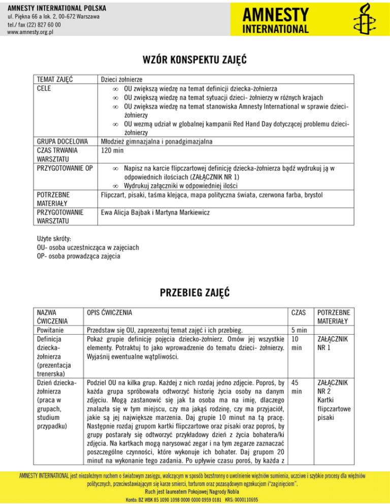 WZÓR KONSPEKTU ZAJĘĆ TEMAT ZAJĘĆ CELE GRUPA DOCELOWA CZAS TRWANIA WARSZTATU PRZYGOTOWANIE OP POTRZEBNE MATERIAŁY PRZYGOTOWANIE WARSZTATU Dzieci żołnierze • OU zwiększą wiedzę na temat definicji dziecka-żołnierza • OU zwiększą wiedzę na temat sytuacji dzieci- żołnierzy w różnych krajach • OU zwiększa wiedzę na temat stanowiska Amnesty International w sprawie dzieciżołnierzy • OU wezmą udział w globalnej kampanii Red Hand Day dotyczącej problemu dzieciżołnierzy Młodzież gimnazjalna i ponadgimazjalna 120 min • Napisz na karcie flipczartowej definicję dziecka-żołnierza bądź wydrukuj ją w odpowiednich ilościach (ZAŁĄCZNIK NR 1) • Wydrukuj załączniki w odpowiedniej ilości Flipczart, pisaki, taśma klejąca, mapa polityczna świata, czerwona farba, brystol Ewa Alicja Bajbak i Martyna Markiewicz Użyte skróty: OU- osoba uczestnicząca w zajęciach OP- osoba prowadząca zajęcia PRZEBIEG ZAJĘĆ NAZWA ĆWICZENIA Powitanie Definicja dzieckażołnierza (prezentacja trenerska) Dzień dzieckażołnierza (praca w grupach, studium przypadku) OPIS ĆWICZENIA CZAS Przedstaw się OU, zaprezentuj temat zajęć i ich przebieg. 5 min Pokaż grupie definicję pojęcia dziecko-żołnierz. Omów jej wszystkie 10 elementy. Potraktuj to jako wprowadzenie do tematu dzieci- żołnierzy. min Wyjaśnij ewentualne wątpliwości. Podziel OU na kilka grup. Każdej z nich rozdaj jedno zdjęcie. Poproś, by 45 każda grupa spróbowała odtworzyć historię życia osoby na danym min zdjęciu. Mogą zastanowić się jak ta osoba ma na imię, dlaczego znalazła się w tym miejscu, czy ma jakąś rodzinę, czy ma przyjaciół, jakie są jej największe marzenia. Daj grupie 10 minut na tą pracę. Następnie rozdaj grupom kartki flipczartowe oraz pisaki oraz poproś, by grupy postarały się odtworzyć przykładowy dzień z życia bohatera/ki zdjęcia. Na kartkach mogą narysować zegar i na tym zegarze zaznaczać poszczególne czynności, które wykonuje ich bohater. Daj grupom 20 minut na wykonanie tego zadania. Po upływie czasu poroś, by każda z POTRZEBNE MATERIAŁY ZAŁĄCZNIK NR 1 ZAŁĄCZNIK NR 2 Kartki flipczartowe pisaki Podstawowe fakty na temat dzieciżołnierzy (prezentacja trenerska) Zasięg terytorialny problemu dzieci-żołnierzy (praca w grupach, praca z mapą) Stanowisko Amnesty International grup zaprezentowała wyniki swojej pracy. Przedstaw podstawowe fakty na temat dzieci- żołnierzy zawarte w załączniku nr 3. Możesz wcześniej przygotować prezentację na jego podstawie bądź zaproponować jakąś inną formę przedstawienia tej wiedzy. 15 min Podziel OU na grupy. Każdej z grup rozdaj jedną z informacji 15 pochodzącą z raportów Amnesty International dotyczących problemu min dzieci-żołnierzy (ZAŁĄCZNIK NR 4). Poproś by grupa przeczytała otrzymaną informację. Następnie poproś każdą z grup, by zaznaczyła na mapie politycznej świata kraj, o którym mowa w materiałach jaki dostała oraz przedstawiła okoliczności, w jakich wykorzystywane są dzieci-żołnierze. Kiedy każda z grup zaznaczy swój kraj możesz wymienić również inne kraje, w których wykorzystywane są dzieci- żołnierze. Pełny raport na ten temat możesz znaleźć na stronie: http://www.child-soldiers.org/ Przedstaw stanowisko Amnesty International w sprawie wykorzystania 5 min dzieci żołnierzy: • AI sprzeciwia się przymusowemu lub dobrowolnemu poborowi dzieci (osób w wieku poniżej 18. roku życia) do wojska oraz wszelkim formom ich przynależności do sił zbrojnych. ZAŁĄCZNIK NR 3 Mapa polityczna świata ZAŁĄCZNIK NR 4 • Dotyczy to zarówno przypadków rekrutacji przez państwo jak i zbrojne ugrupowania polityczne. • Oparte jest to na przekonaniu o wysokiej szkodliwości dla zdrowia fizycznego i psychicznego dziecka, jaką niesie ze sobą udział w konflikcie zbrojnym. Podejmowanie działań: Red Hand Day Zakończenie • AI twierdzi, że wszystkie kraje powinny wspierać przyjęcie Traktatu o Handlu Bronią, który chroni prawa człowieka i pomaga zapobiegać wykorzystywaniu dzieci-żołnierzy, nakładając na państwa-strony obowiązek dokonania oceny, czy broń i amunicja wyprodukowane w danym kraju mogą zostać użyte do naruszeń międzynarodowych praw człowieka i prawa humanitarnego. Przedstaw OU ideę Red Hand Day, czyli kampanii, która polega na 20 tworzeniu i zbieraniu czerwonych odbitek dłoni jako wsparcia ochrony min dzieci w strefach wojennych. Zebrane w ten sposób odbitki dłoni wysyła się do Organizacji Narodów Zjednoczonych w celu wywarcia społecznej presji na decydentach. Red Hand Day Organizowany jest w 50 krajach świata już od 10 lat. Więcej informacji na ten temat: http://www.redhandday.org/index.php?id=4&L=0 Zaproponuj OU stworzenie plakatu z odbitkami ich dłoni. Podsumuj zajęcia. 5 min Czerwona farba, brystol ZAŁĄCZNIK NR 1 „ … osoba poniżej 18 roku życia, która jest członkiem lub została wcielona do sił zbrojnych lub grupy zbrojnej, podczas trwającego konfliktu zbrojnego lub w czasie pokoju. Dzieci-żołnierze mogą wykonywać zadania od bezpośredniego udziału w walce; przez działalność militarną taką jak zwiady, szpiegowanie, sabotaż, zastawianie pułapek, posłannictwo, wartownictwo czy ochrona; trening, musztrę oraz inne rodzaje przygotowań do walki; wypełniają także funkcje takie jak transportowanie bagażu czy prowadzenie gospodarstwa: niewolnictwo seksualne czy wykonywanie pracy pod przymusem.” (p.7) Child Soldiers 1379 Report, the Coalition to Stop the Use of Child Soldiers (CSC) „Dziecko-żołnierz (…) oznacza każdą osobę poniżej 18 roku życia, która jest częścią jakiejkolwiek regularnej czy nieregularnej siły zbrojnej lub grupy zbrojnej, pracującą w jakimkolwiek charakterze kucharza, odźwiernego, posłańca oraz innym oraz to dziecko ( te dzieci) które towarzyszą w/w grupom chyba, że są członkami rodziny. Zalicza się także dziewczęta zrekrutowa