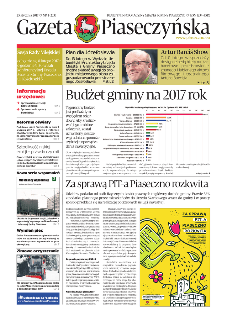 25 stycznia 2017 • NR 1 (223) BIULETYN INFORMACYJNY MIASTA I GMINY PIASECZNO • ISSN 1234-351X Gazeta Piaseczyńska www.piaseczno.eu Sesja Rady Miejskiej Plan dla Józefosławia Artur Barciś Show odbędzie się 8 lutego 2017 r. o godzinie 9.30 w sali konferencyjnej Urzędu Miasta i Gminy, Piaseczno, ul. Kościuszki 5 Do 13 lutego w Wydziale Urbanistyki i Architektury Urzędu Miasta i Gminy Piaseczno można składać uwagi do projektu miejscowego planu zagospodarowania przestrzennego Józefosławia. * str. 2 Od 7 lutego w sprzedaży dostępne będą bilety na kabaretowe przedstawienie znanego i lubianego aktora filmowego i teatralnego Artura Barcisia Informacje urzędowe: Budżet gminy na 2017 rok Sprawozdanie z sesji Rady Miejskiej Sprawozdanie z pracy burmistrza str. 2 str. 2 Reforma oświaty Podpisana przez Prezydenta w dniu 9 stycznia 2017 r. ustawa o reformie oświaty, wchodzi w życie, co oznacza, że samorządy muszą rozpocząć proces str. 2 jej wdrażania. Szkodliwość niskiej emisji - prawda czy mit Coraz częściej słyszymy sformułowanie „niska emisja”. Czy wiemy, czym faktycznie jest niska emisja i jakie są konsekwenstr. 3 cje tego zjawiska? Nowa seria wspomnień 2 Małgorzata Kawka-Piotrowska *str. 8 Tegoroczny budżet jest pod każdym względem rekordowy. Aby zrealizować jego ambitne założenia, został uchwalony jeszcze w grudniu, co pomoże szybciej rozpocząć zadania inwestycyjne. Okres międzyświąteczny, podobnie zresztą jak w roku poprzednim, okazał się dla gminnych radnych bardzo pracowity. Na sesji 28 grudnia większością dwudziestu głosów za, przy jednym przeciw przyjęto budżet, a zarazem plan działania dla piaseczyńskiego samorządu na najbliższy rok. Radni projekt budżetu omawiali wcześniej w komisjach problemowych, wprowadzając do niego swoje uwagi oraz szereg nowych za- dań, głównie inwestycyjnych i remontowych, które przyjęte zostały przez burmistrza. Projekt budżetu uzyskał pozytywną ocenę Komisji Finansów oraz Regionalnej Izby Obrachunkowej. więcej na str .4 Za sprawą PIT-a Piaseczno rozkwita Udział w podatku od osób fizycznych i osób prawnych to główny dochód gminy. Prawie 38% z podatku płaconego przez mieszkańców do Urzędu Skarbowego wraca do gminy i w prosty sposób przekłada się na realizację potrzebnych usług i inwestycji. Ukazała się druga część książki „Mieszkańcy wspominają” wydana przez Biuro Promocji str. 3 i Informacji Gminy Piaseczno. Wymień piec Gmina Piaseczno rozpoczęła nabór wniosków na udzielenie dotacji celowej na wymianę systemu ogrzewania na proekologiczny. str. 7 Zimowe oczyszczanie Kto odśnieży dach? Co zrobić, by nie zostać na lodzie? Przeczytaj, kto powinien zadbać o porządek podczas zimy. str. 5 To dzięki podatkom, ale tylko osób rozliczających się w Piasecznie, w tym roku gmina może przeznaczyć ponad 100 mln zł na inwestycje i remonty. – Korzystając z publicznego transportu, wysyłając dzieci do szkoły, narzekając na brak chodnika czy przyzwoitej drogi, pamiętajmy, że jakość usług i ilość nowych inwestycji uzależnione są od dochodów gminy, a te w przeważającej mierze pochodzą z udziału w podatkach od osób fizycznych i prawnych. Zamożność naszej gminy uzależniona jest więc od zamożności mieszkańców i ich rzetelności w płaceniu podatków – wyjaśnia Burmistrz Zdzisław Lis. To proste, wystarczy ZAP-3 Dzisiaj przepisy nie wymagają meldunku, aby płacić podatki w miejscu zamieszkania.Wypełniając PIT, wystarczy wskazać jako miejsce zamieszkania gminę Piaseczno oraz dołączyć wypełniony formularz aktualizacyjny ZAP-3. W ten sposób wspieramy okolicę, w której mieszkamy, a więc wpływamy na otaczającą nas rzeczywistość. Na co idą Twoje pieniądze? Na stronie www.piaseczno.nacoidamojepieniadze.pl można sprawdzić, jak pieniądze z naszych podatków wydawane są przez gminę Piaseczno. – Program, który jest swego rodzaju kalkulatorem mieszkańca, pokazuje, w jakim stopniu poszczególny podatnik przyczynia się do rozwoju swojej gminy, płacąc w niej podatki. Z drugiej strony jest to narzędzie, które każdemu pozwala ocenić, czy podział wydatków na konkretne dziedziny i zadania realizowane przez samorząd jest zgodny z jego oczekiwaniami – mówi Łukasz Wyleziński, kierownik Biura Promocji i Informacji Gminy Piaseczno. –Właśnie wprowadziliśmy do programu dane z budżetu na 2017 rok i wkrótce będzie można porównać wydatki tegoroczne z latami poprzednimi, gdyż korzystamy z tego systemu już od czterech lat – dodaje. Symulator internetowy jest oczywiście narzędziem poglądowym, odnosi się wyłącznie do podatku dochodowego od osób fizycznych, a poszczególne wyniki mogą delikatnie różnić się od stanu faktycznego, bo różne mogą być chociażby koszty uzyskania przychodu. Wyniki są też zaokrąglane. Program uwzględnia progi podatkowe, ale nie bierze pod uwagę odliczeń czy sytuacji, w której małżonkowie rozliczają się wspólnie. Dlatego wygenerowanych kwot nie należy przyjmować dosłownie, a jedynie orientacyjnie. biuro promocji informacji Gminy Piaseczno 2 Sprawozdanie z sesji Rady Miejskiej w Piasecznie SESJA 30 Gazeta Piaseczyńska 25 stycznia 2017, nr 1 (223) aktualności Sprawozdanie z pracy burmistrza od 28 grudnia 2016 r. do 18 stycznia 2017 r. 18 stycznia 2017 r. Na początku sesji radni przyjęli protokół z 29. sesji Rady Miejskiej. Sprawozdanie z działalności między sesjami przedstawił przewodniczący Rady Piotr Obłoza. Po wysłuchaniu wniosków i interpelacji skarbnik zapoznała radnych z sytuacją finansową gminy. Zmiany budżetowe Radni wprowadzili zmiany w budżecie na rok 2017: – radni przesunęli wydatki w wysokości 4 455 zł na zakup oprogramowania dla wydziału oświaty, – zwiększono wydatki inwestycyjne o kwotę 200 000 zł na koncepcje budowy ul. Wenus w Józefosławiu oraz o kwotę 20 000 zł na projekt poprawy obsługi komuni