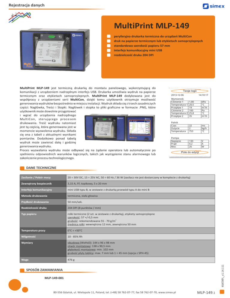 Rejestracja danych MultiPrint MLP-149 peryferyjna drukarka termiczna do urządzeń MultiCon druk na papierze termicznym lub etykietach samoprzylepnych standardowa szerokość papieru 57 mm interfejs komunikacyjny mini USB rozdzielczość druku 204 DPI MultiPrint MLP-149 jest termiczną drukarką do montażu panelowego, wykorzystującą do komunikacji z urządzeniem nadrzędnym interfejs USB. Drukarka umożliwia wydruk na papierze termicznym oraz etykietach samoprzylepnych. MultiPrint MLP-149 dedykowana jest do współpracy z urządzeniami serii MultiCon, dzięki temu użytkownik otrzymuje możliwość generowania wydruków bezpośrednio w miejscu instalacji. Wydruk składa się z trzech zasadniczych części: Nagłówka, Treści i Stopki. Nagłówek i stopka to pliki graficzne w formacie .PNG, które użytkownik może dowolnie przygotować i wgrać do urządzenia nadrzędnego MultiCon, sterującego procesem drukowania. Treść wydruku natomiast jest tą częścią, która generowana jest w momencie wyzwolenia wydruku. Składa się ona z tabeli z aktualnymi wynikami pomiarów. Dodatkowo ponad tabelą wydruk może zawierać datę i godzinę generowania wydruku. Proces wyzwalania wydruku może odbywać się na żądanie operatora lub automatycznie po spełnieniu odpowiednich warunków logicznych, takich jak wystąpienie stanu alarmowego lub zakończenie procesu technologicznego. Twoje logo 2013-12-06 14:10:17 Wymiennik Ciśnienie 1 Temperatura 1 Przepływ 1 Ciśnienie 2 Temperatura 2 Przepływ 2 1,00 20,5 19 100 25,8 35 kPa °C 3 m /h Pa °C 3 m /h Palnik Czas Zużycie Temperatura 22 2 753 ms kg/h °C Pompa Napięcie Prąd Moc 130 0,2 26 V A W Pole do edycji Zasilanie / Pobór mocy 20 ÷ 30V DC, 15 ÷ 25V AC, 50 ÷ 60 Hz / 36 W (zasilacz nie jest dostarczany w komplecie z drukarką) Zewnętrzny bezpiecznik 3,15 A, FF, topikowy, 5 x 20 mm Interfejs komunikacyjny mini USB typu B, w zestawie z drukarką przewód typu A do mini B Metoda drukowania termiczna, stała głowica Prędkość drukowania 50 mm/sek. Rozdzielczość druku 204 DPI (8 punktów / mm) Typ papieru rolki termiczne (2 szt. w zestawie z drukarką), etykiety samoprzylepne szerokość: 57 +/-0,5 mm grubość: rekomendowana 55 - 70 g/m2 średnica rolki: wewnętrzna 12 mm, zewnętrzna 50 mm Temperatura pracy 0°C ÷ +50°C Wilgotność 10 - 85% Rh Wymiary obudowa (WxHxD): 144 x 96 x 98 mm otwór montażowy: 138 x 90,5 mm głębokość montażowa: min. 102 mm grubość płyty tablicy: max. 7 mm lub 1 ÷ 45 mm (opcja z SPH-45) Waga 476 g KKATAPL_v1.14.111 DANE TECHNICZNE SPOSÓB ZAMAWIANIA MLP-149-001 80-556 Gdańsk, ul. Wielopole 11, Poland, tel. (+48) 58 762-07-77, fax 58 762-07-70, www.simex.pl MLP-149.1 Rejestracja danych WYMIARY 8 90 mm 96 mm 85 mm 90,5 mm 138 mm 88,5 mm 144 mm Widok z boku Wymiary otworu montażowego Wymiary zewnętrzne OPIS PŁYTY CZOŁOWEJ 2 4 1. Przycisk otwierający pojemnik z papierem wraz z diodą sygnalizacyjną (stany działania opisane są w poniższej tabeli) 2. Przycisk wysuwający papier 3. Pokrywa pojemnika na papier 4. Szczelina wyjścia papieru, z ząbkami do wygodnego odrywania wydruku Status Opis LED wyłączony Drukarka wyłączona LED włączony Drukarka włączona Migotanie wolne Brak papieru 1 Print 3 Migotanie szybkie Przekroczenie temperatury pracy lub niepoprawne zasilanie AKCESORIA SPH-05 uchwyty montażowe do paneli o grubości 1÷5 mm (2 szt.) SPH-07 uchwyty montażowe do paneli o grubości 1÷7 mm (2 szt.) dostarczane standardowo w komplecie z urządzeniem SPS-24/2,5 zasilacz impulsowy o mocy wyjściowej 60W na szynę DIN 35/7.5 lub 15 STP-57 Papierowa rolka termiczna do drukarek MultiPrint: - szerokość rolki: 57 mm, - długość: 30 m (2 szt.) SPH-45 uchwyty montażowe do paneli o grubości 1÷45 mm (2 szt.) KKATAPL_v1.14.111 SRH-99 adaptor do mocowania urządzeń na szynie DIN 35/7.5 lub 15 (2 szt.) UCC-AmB Kabel komunikacyjny USB 2.0 do połączenia drukarki MultiPrint z urządzeniami serii MultiCon 80-556 Gdańsk, ul. Wielopole 11, Poland, tel. (+48) 58 762-07-77, fax 58 762-07-70, www.simex.pl MLP-149.2