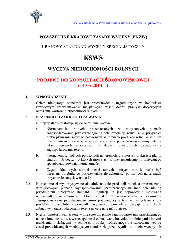 POLSKA FEDERACJA STOWARZYSZEŃ RZECZOZNAWCÓW MAJĄTKOWYCH POWSZECHNE KRAJOWE ZASADY WYCENY (PKZW) KRAJOWY STANDARD WYCENY SPECJALISTYCZNY KSWS WYCENA NIERUCHOMOŚCI ROLNYCH PROJEKT DO KONSULTACJI ŚRODOWISKOWEJ (14-05-2014 r.) 1. WPROWADZENIE Celem niniejszego standardu jest przedstawienie uzgodnionych w środowisku zawodowym rzeczoznawców majątkowych zasad dobrej praktyki dotyczących określania wartości nieruchomości rolnych. 2. PRZEDMIOT I ZAKRES STOSOWANIA 2.1. Niniejszy standard stosuje się do określania wartości: a. Nieruchomości rolnych przeznaczonych w miejscowych planach zagospodarowania przestrzennego na cele produkcji rolnej, a w przypadku braku planu miejscowego położonych na terenach produkcji rolnej w studium uwarunkowań i kierunków zagospodarowania przestrzennego gminy lub na takich terenach wskazanych w decyzji o warunkach zabudowy i zagospodarowania terenu. b. Nieruchomości rolnych położonych na terenach, dla których braku jest planu, studium lub decyzji, o których mowa ust. a, przy uwzględnieniu faktycznego sposobu użytkowania nieruchomości. c. Części składowych nieruchomości rolnych, których wartość może być określana odrębnie, co dotyczy także nieruchomości położonych na terenach innych wskazanych w ust. a i b. 2.2. Nieruchomości wykorzystywane aktualnie na cele produkcji rolnej, a przeznaczone w miejscowych planach zagospodarowania przestrzennego na inne cele nie są przedmiotem niniejszego standardu. Regulacja ta jest odpowiednio stosowana w przypadku nieruchomości, które w studium uwarunkowań i kierunków zagospodarowania przestrzennego gminy położone są na terenach innych niż strefa produkcji rolnej lub w przypadku wydania odpowiedniej decyzji o warunkach zabudowy i zagospodarowania terenu na cele inne niż rolnicze. 2.3. Nieruchomości przeznaczone w miejscowym planie zagospodarowania przestrzennego na cele inne niż rolne, a w szczególności zabudowane budynkami rolniczymi i innymi urządzeniami służącymi wyłącznie do produkcji rolnej, mogą być szacowane według zasad przewidzianych w niniejszym standardzie, jeżeli wynika to z celu wyceny lub KSWS Wycena nieruchomości rolnych 1 POLSKA FEDERACJA STOWARZYSZEŃ RZECZOZNAWCÓW MAJĄTKOWYCH z właściwych przepisów. Regulacja ta jest odpowiednio stosowana w przypadku nieruchomości, które według studium uwarunkowań i kierunków zagospodarowania przestrzennego gminy położone są na terenach innych strefa produkcji rolnej lub w przypadku wydania odpowiedniej decyzji o warunkach zabudowy i zagospodarowania terenu. 2.4. Niniejszy standard stosuje się do określania wartości rynkowej, wartości odtworzeniowej oraz innych rodzajów wartości. 2.5. Przedstawione rozwiązania metodyczne odnoszą się do wyceny nieruchomości gruntowych będących przedmiotem prawa własności, a odpowiednio można je wykorzystywać do innych rodzajów nieruchomości (budynkowych i lokalowych) oraz innych praw rzeczowych i zobowiązaniowych. 3. ZASADY OGÓLNE 3.1. Przedmiotem wyceny powinna być nieruchomość rolna w rozumieniu kodeksu cywilnego (tj. w ujęciu prawno-rzeczowym) lub w ujęciu wieczysto księgowym, jednak w każdym przypadku obejmować winna całość, dotyczącą gruntu z jego częściami składowymi. 3.2. Jeżeli z przepisów prawa lub umowy z zamawiającym wycenę wynika, że z zakresu wyceny wyłączana jest określona część składowa nieruchomości, w rozumieniu art. 48 kodeksu cywilnego, przynależność, pożytek lub grunt, to powinno to być w operacie szacunkowym wyraźnie zaznaczone i uzasadnione. 3.3. Przedmiotem wyceny może być także sam grunt lub określone części składowe nieruchomości rolnej, a w szczególności: zasiewy, uprawy, plantacje kultur wieloletnich, budynki i inne urządzenia a także wartość szkód związanych z uszkodzeniem gruntu, w tym z doprowadzeniem go do stanu poprzedniego. 3.4. Określenia wartości nieruchomości rolnej o wielu sposobach użytkowania i związanej z tym dużej różnorodności: użytków, budynków (np. mieszkalnych, inwentarskich, magazynowych, przetwórczych), budowli (np. stawy rybne, melioracje itp.) można dokonać poprzez wydzielenie funkcjonalnych części celem ich odrębnej wyceny. Rozwiązanie to można stosować odpowiednio w przypadku gdy wydzielona funkcjonalnie do celów wyceny część nieruchomości, wykorzystywana jest na cele produkcji rolnej a przeznaczona jest na inne cele. Oznacza to konieczność wyceny tej części nieruchomości przy uwzględnieniu jej innego niż rolnicze przeznaczenia. Podział nieruchomości na funkcjonalne części powinien uwzględniać granice geodezyjne, granice planistyczne lub granice wynikające z innych regulacji. 3.5. Przy określaniu wartości nieruchomości rolnych zaleca się korzystanie ze specjalistycznych źródeł informacji o tych nieruchomościach zawartych w: dokumentacji klasyfikacji gleboznawczej, mapach glebowo – rolniczych, mapach zasobności gleb, dokumentach gospodarczych na podstawie, których można ocenić poprawność i poziom agrotechniki, publikacjach specjalistycznych (w szczególności uczelni wyższych, instytutów naukowych i innych organizacji zajmujących się rolnictwem, ekonomiką tej dziedziny, doradztwem rolniczym), dokumentacji odnoszącej się do zgodności kierunków produkcji roślinnej i sposobu korzystania z budynków inwentarskich z planem zagospodarowania przestrzennego dla gruntów KSWS Wycena nieruchomości rolnych 2 POLSKA FEDERACJA STOWARZYSZEŃ RZECZOZNAWCÓW MAJĄTKOWYCH położonych w strefach szczególnej ochrony środowiska i ochrony przyrody lub strefach ochronnych zakładów przemysłowych i strefach ograniczonego użytkowania. 3.6. Zróżnicowana użyteczność nieruchomości rolnych wpływa na warunki funkcjonowania rynku i decyduje o jego podziale na segmenty charakteryzujące się podobnymi warunkami ekonomicznymi funkcjonowania. Należy to uwzględnić przy wykonywaniu analizy rynku. w szczeg