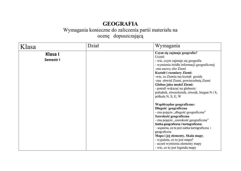 GEOGRAFIA Wymagania konieczne do zaliczenia partii materiału na ocenę dopuszczającą Dział Klasa Klasa I Semestr I Wymagania Czym się zajmuje geografia? Uczeń: - wie, czym zajmuje się geografia - wymienia źródła informacji geograficznej -zna nazwy sfer Ziemi Kształt i rozmiary Ziemi: -wie, ze Ziemia ma kształt geoidy -zna obwód Ziemi, powierzchnię Ziemi Globus jako model Ziemi: - potrafi wskazać na globusie: południk, równoleŜnik, równik, biegun N i S, półkule N, S, E, W Współrzędne geograficzne: Długość geograficzna - zna pojęcie „długość geograficzna” Szerokość geograficzna - zna pojęcie „szerokość geograficzna” Siatka geograficzna i kartograficzna: - wyjaśnia, co to jest siatka kartograficzna i geograficzna Mapa i jej elementy. Skala mapy. - wyjaśnia, co to jest mapa? - uczeń wymienia elementy mapy - wie, co to jest legenda mapy - wymienia rodzaje map - wyjaśnia pojęcie „generalizacja mapy” - wymienia metody prezentacji rzeźby i zjawisk na mapach - wie, co to jest wysokość bezwzględna i względna - potrafi odczytywać istotne informacje z mapy Budowa Układu Słonecznego Uczeń: - wymienia planety Układu Słonecznego - wie, jaka jest róŜnica miedzy gwiazdą a planetą - wie, kim był M. Kopernik, jakie są jego zasługi Ruch obrotowy Ziemi i jego następstwa: -wymienia następstwa ruchu obrotowego Ziemi, -zna cechy ruchu obrotowego Ziemi Obliczanie czasu miejscowego, słonecznego: - wymienia czasy: miejscowy - słoneczny, letni, zimowy, strefowy, uniwersalny - wie, co to jest linia zmiany daty - posługuje się mapą stref czasowych Ruch obiegowy Ziemi i jego następstwa - wymienia następstwa ruchu obiegowego - zna cechy ruchu obiegowego Strefy oświetlenia Ziemi i ich granice: - wymienia strefy oświetlenia Ziemi -wymienia pory roku i daty ich rozpoczęcia - uczeń wie, co to jest gnomon i do czego słuŜy Skład i budowa atmosfery: - zna skład chemiczny powietrza atmosferycznego - wyjaśnia pojęcia : pogoda, klimat - wymienia składniki ( elementy ) pogody, wie w jaki sposób dokonuje się ich pomiaru - wymienia warstwy atmosfery - potrafi obliczyć średnią roczną temperaturę powietrza oraz amplitudę Ciśnienie atmosferyczne i wiatr: - wie, co to jest ciśnienie atmosferyczne, w jakich jednostkach podaje się jego wartość - zna pojęcia: wyŜ, niŜ baryczny, izobara - zna rodzaje wiatrów: pasat, monsun, bryza, fen, wie, gdzie występują Wilgotność powietrza i opady atmosferyczne: - wymienia rodzaje opadów i osadów atmosferycznych - wymienia rodzaje chmur Klimaty na kuli ziemskiej: - uczeń wymienia strefy klimatyczne na kuli ziemskiej, wskazuje na mapie klimatycznej Zasoby wodne Ziemi -wskazuje na mapie i nazywa kontynenty i oceany - wymienia typy mórz i podaje przykłady - zna ruchy wody morskiej: prądy morskie, pływy morskie, falowanie - wie, co to jest gejzer Budowa wnętrza Ziemi -zna nazwy sfer wnętrza Ziemi Skały i minerały: - zna pojęcia: skała, minerał - przedstawia podział skał Płytowa budowa Ziemi: - wymienia procesy wewnętrzne kształtujące powierzchnię Ziemi - potrafi wymienić przyczyny i skutki trzęsień Ziemi Wulkanizm i obszary sejsmiczne: - zna budowę wulkanu - wymienia skutki erupcji wulkanicznych - potrafi wymienić przykłady wulkanów i wskazać je na mapie Powstawanie gór: - wymienia wielkie formy ukształtowania dna oceanu - wielkie formy ukształtowania powierzchni lądów ( góry, wyŜyny, niziny ) - zna najwaŜniejsze ruchy górotwórcze w dziejach Ziemi - wymienia rodzaje gór Procesy zewnętrzne kształtujące powierzchnię Ziemi: -uczeń wymienia procesy zewnętrzne - zna rodzaje wietrzenia( fizyczne, chemiczne, biologiczne ) Procesy i formy krasowe: - wie, co to są procesy krasowe - wymienia formy krasu podziemnego i powierzchniowego Rzeźbotwórcza działalność rzek: - zna pojęcia: rzeka główna, dopływ, źródło, dział wodny, dorzecze - wymienia typy ujść - wskazuje na mapie najdłuŜsze rzeki świata - wymienia formy działalności rzeki w biegu górnym, środkowym i dolnym Rzeźbotwórcza działalność lodowców górskich i lądolodów: -Wymienia elementy budowy lodowca górskiego - wymienia formy działalności lodowców górskich - wymienia formy działalności lądolodów Rzeźbotwórcza działalność morza: - zna pojęcia: abrazja, -wymienia typy wybrzeŜy Rzeźbotwórcza działalność wiatru: - zna pojęcia: korazja, deflacja - wymienia rodzaje wydm - wymienia rodzaje pustyń Gleby i roślinność na Ziemi: - uczeń wymienia czynniki glebotwórcze - wymienia poziomy glebowe -zna pojęcie” gleba” - potrafi wymienić formacje roślinne - potrafi wskazać na mapie największe kompleksy leśne świata Warunki naturalne Afryki: - określa połoŜenie Afryki na kuli ziemskiej - wymienia strefy klimatyczne Afryki - wskazuje na mapie i odczytuje waŜniejsze formy ukształtowania powierzchni: góry, rzeki, jeziora, - potrafi na mapie wskazać pustynię Sahara Egipt- pustynny kraj nad Nilem: - lokalizuje na mapie państwo, podaje jego stolicę - omawia znaczenie Nilu dla Egiptu - wskazuje na mapie Kanał Sueskiego - wymienia główne uprawy Republika Południowej Afryki: - lokalizuje na mapie państwo, podaje jego stolicę - wymienia główne surowce mineralne - wyjaśnia terminy: step, sawanna Problemy Afryki: - wymienia główne problemy: głód, wysoki przyrost naturalny, AIDS, analfabetyzm, Warunki naturalne Ameryki: Ameryka Południowa: - połoŜenie geograficzne, strefy klimatyczne, formy terenu ( waŜniejsze góry, niziny, jeziora, wyŜyny, rzeki), najwyŜszy szczyt Środowisko przyrodnicze, ludność i gospodarka Brazylii : - wielkie miasta, stolica - główne uprawy, waŜne surowce mineralne - wycinanie lasów równikowych i jej skutki dla świata Ameryka Północna: - cechy połoŜenia, najwyŜszy szczyt - strefy klimatyczne - główne jeziora, rzeki, góry, niziny, wyŜyny (wskazać na mapie) Środowisko przyrodnicze, ludność i gosp