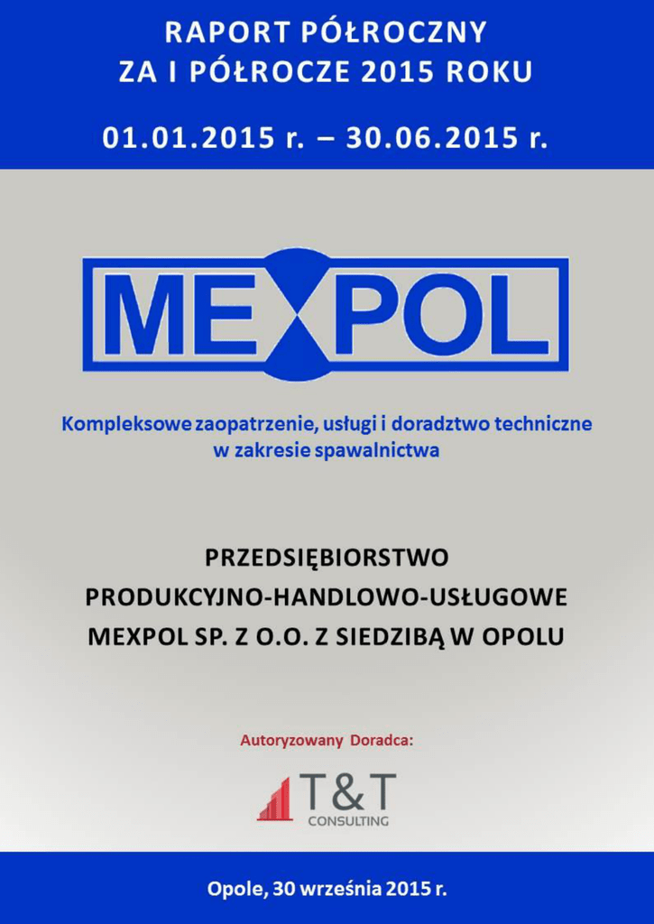 Spis treści 1. Podstawowe dane o Emitencie ........................................................................................................................ 3 2. Wybrane dane finansowe ................................................................................................................................. 3 2.1. Zasady przyjęte przy przeliczaniu PLN na EUR ......................................................................... 4 3. Półroczne skrócone sprawozdanie finansowe ............................................................................................. 5 4. Grupa kapitałowa Emitenta ............................................................................................................................. 5 5. Półroczne sprawozdanie z działalności Emitenta ....................................................................................... 5 5.1. Informacje na temat działalności Emitenta.................................................................................... 5 5.1.1. Zawarcie istotnej umowy z Siemens ............................................................................ 5 5.1.2. Nawiązanie współpracy handlowej z PIONIER Absaugtechnik GmbH z siedzibą w Neukirchen-Vluyn, Niemcy ................................................................... 6 5.1.3. Nawiązanie współpracy handlowej z TRACTEL SOLUTIONS S.A.S. z siedzibą w Saint-Genis-Laval, Francja.......................................................................................... 6 5.1.4. Udział w targach ............................................................................................................... 7 5.1.5. Zmiana siedziby oddziału Spółki w Warszawie ....................................................... 7 5.2. Zatrudnienie ......................................................................................................................................... 7 5.3. Zasady sporządzenia półrocznego skróconego sprawozdania finansowego ....................... 7 5.4. Podstawowe zagrożenia i ryzyka .................................................................................................... 8 5.4.1. Czynniki ryzyka związane z otoczeniem rynkowym Emitenta ............................ 8 5.4.2. Czynniki ryzyka związane z działalnością Emitenta ............................................... 9 5.4.3. Czynniki ryzyka związane z Obligacjami................................................................. 11 5.4.4. Czynniki ryzyka związane z notowaniem Obligacji w alternatywnym systemie obrotu na Catalyst........................................................................................................... 12 6. Oświadczenie Zarządu .................................................................................................................................... 13 RAPORT PÓŁROCZNY ZA I PÓŁROCZE 2015 ROKU Strona 2 z 13 1. Podstawowe dane o Emitencie Nazwa (firma) Przedsiębiorstwo Produkcyjno-Handlowo-Usługowe Mexpol Spółka z ograniczoną odpowiedzialnością Nazwa skrócona Mexpol Sp. z o.o. Data powstania 3 grudnia 1997 r. (jako kontynuacja spółki cywilnej o nazwie Przedsiębiorstwo Mexpol) Siedziba Opole, Polska ul. Głogowska 23 Adres 45-315 Opole Telefon +48 77 402 92 56 E-mail [email protected] Strona internetowa www.mexpol.com.pl Identyfikator PKD 46.69.Z – sprzedaż hurtowa pozostałych maszyn i urządzeń Forma prawna Spółka z ograniczoną odpowiedzialnością NIP 7542480402 REGON 531301704 Kapitał zakładowy 177.000,00 PLN – w pełni opłacony Numer KRS 0000016581 Zarząd Kazimierz Adamus – Dyrektor Zarządu (Zarząd jednoosobowy) 2. Wybrane dane finansowe BILANS Wyszczególnienie 30.06.2015 r. 30.06.2014 r. 30.06.2015 r. 30.06.2014 r. [PLN] [PLN] [EUR] [EUR] Aktywa trwałe 5 106 649,71 4 851 051,90 1 217 492,30 1 165 866,01 Aktywa obrotowe 8 483 502,80 7 890 106,38 2 022 578,39 1 896 249,94 Kapitał własny 2 362 713,70 2 331 687,15 563 301,95 560 380,48 177 000,00 177 000,00 42 199,12 42 538,87 11 227 438,81 10 409 471,13 2 676 768,74 2 501 735,47 Zobowiązania długoterminowe 2 130 595,64 2 206 964,51 507 961,96 530 405,56 Zobowiązania krótkoterminowe 8 026 168,59 7 456 102,48 1 913 543,91 1 791 944,65 13 590 152,51 12 741 158,28 3 240 070,69 3 062 115,96 Kapitał podstawowy Zobowiązania i rezerwy na zobowiązania Suma bilansowa RAPORT PÓŁROCZNY ZA I PÓŁROCZE 2015 ROKU Strona 3 z 13 RACHUNEK ZYSKÓW I STRAT Wyszczególnienie Przychody netto ze sprzedaży i zrównane z nimi 01.01.2015 r. - 01.01.2014 r. - 01.01.2015 r. - 01.01.2014 r. - 30.06.2015 r. 30.06.2014 r. 30.06.2015 r. 30.06.2014 r. [PLN] [PLN] [EUR] [EUR] 11 102 917,16 10 810 504,69 2 685 691,48 2 587 235,47 Zysk (strata) ze sprzedaży 175 893,61 180 193,32 42 547,01 43 124,96 Zysk (strata) z działalności operacyjnej 234 871,82 204 547,74 56 813,29 48 953,60 Zysk (strata) brutto 39 004,49 8 120,97 9 434,82 1 943,56 Zysk (strata) netto 29 301,49 2 338,97 7 087,76 559,78 RACHUNEK PRZEPŁYWÓW PIENIĘŻNYCH 01.01.2015 r. - 01.01.2014 r. - 01.01.2015 r. - 01.01.2014 r. - 30.06.2015 r. 30.06.2014 r. 30.06.2015 r. 30.06.2014 r. [PLN] [PLN] [EUR] [EUR] Przepływy pieniężne netto z działalności operacyjnej 495 274,43 -149 599,53 119 802,24 -35 803,07 Przepływy pieniężne netto z działalności inwestycyjnej -23 369,32 -1 286 872,54 -5 652,82 -307 982,13 Przepływy pieniężne netto z działalności finansowej -394 729,75 1 498 602,25 -95 481,42 358 654,57 77 175,36 62 130,18 18 668,00 14 869,37 201 410,42 62 130,18 48 719,29 14 869,37 86 132,45 97 861,26 20 834,63 23 420,75 163 307,81 159 991,44 39 502,63 38 290,12 Wyszczególnienie Przepływy pieniężne netto razem Bilansowa zmiana stanu środków pieniężnych Środki pieniężne na początek okresu Środki pieniężne na koniec okresu 2.1. Zasady przyjęte przy przeliczaniu PLN na EUR Pozycje bilansu zostały przeliczone według średniego kursu ogłoszonego przez NBP obowi