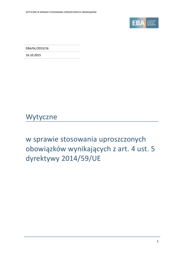 WYTYCZNE W SPRAWIE STOSOWANIA UPROSZCZONYCH OBOWIĄZKÓW EBA/GL/2015/16 16.10.2015 Wytyczne w sprawie stosowania uproszczonych obowiązków wynikających z art. 4 ust. 5 dyrektywy 2014/59/UE 1 WYTYCZNE W SPRAWIE STOSOWANIA UPROSZCZONYCH OBOWIĄZKÓW 1. Zgodność i obowiązki sprawozdawcze Status niniejszych wytycznych 1. Niniejszy dokument zawiera wytyczne wydane zgodnie z art. 16 rozporządzenia (UE) nr 1093/20101. Zgodnie z art. 16 ust. 3 rozporządzenia (UE) nr 1093/2010 właściwe organy i instytucje finansowe dokładają wszelkich starań, aby zastosować się do tych wytycznych i zaleceń. 2. Wytyczne przedstawiają stanowisko EUNB w sprawie odpowiednich praktyk nadzoru w ramach Europejskiego Systemu Nadzoru Finansowego lub tego, jak należy stosować prawo europejskie w konkretnym obszarze. Właściwe organy określone w art. 4 ust. 2 rozporządzenia (UE) nr 1093/2010, do których wytyczne mają zastosowanie, powinny stosować się do wytycznych poprzez wprowadzenie ich odpowiednio do swoich praktyk (np. poprzez dostosowanie swoich ram prawnych lub procesów nadzorczych), również jeżeli wytyczne są skierowane przede wszystkim do instytucji. Wymogi dotyczące sprawozdawczości 3. Zgodnie z art. 16 ust. 3 rozporządzenia (UE) nr 1093/2010 właściwe organy muszą poinformować EUNB, czy stosują się lub czy zamierzą zastosować się do niniejszych wytycznych lub danego zalecenia lub podają powody niestosowania się do dnia 16.12.2015. W przypadku braku informacji w tym terminie właściwe organy zostaną uznane przez EUNB za niestosujące się do niniejszych wytycznych. Informacje należy przekazać poprzez wysłanie formularza dostępnego stronie internetowej EUNB na [email protected] z dopiskiem „EBA/GL/2015/16”. Informacje przekazują osoby upoważnione do informowania o niestosowaniu się do wytycznych w imieniu właściwych organów. Wszelkie zmiany dotyczące stosowania się do wytycznych także należy zgłaszać do EUNB. 4. Zgodnie z art. 16 ust. 3 przekazywane informacje publikuje się na stronie internetowej EUNB. 1 Rozporządzenie Parlamentu Europejskiego i Rady (UE) nr 1093/2010 z dnia 24 listopada 2010 r. w sprawie ustanowienia Europejskiego Urzędu Nadzoru (Europejskiego Urzędu Nadzoru Bankowego), zmiany decyzji nr 716/2009/WE oraz uchylenia decyzji Komisji 2009/78/WE (Dz.U. L 331 z 15.12.2010, s. 12). 2 WYTYCZNE W SPRAWIE STOSOWANIA UPROSZCZONYCH OBOWIĄZKÓW 2. Przedmiot, zakres i definicje Przedmiot 5. Niniejsze wytyczne, o których mowa w art. 4 ust. 5 dyrektywy 2014/59/UE2 (dyrektywa), określają kryteria oceny, zgodnie z art. 4 ust. 1, wpływu upadłości instytucji i przeprowadzonej w jej następstwie likwidacji w ramach standardowego postępowania upadłościowego na rynki finansowe, inne instytucje i na warunki finansowania w celu określenia, czy w odniesieniu do danej instytucji należy zastosować uproszczone obowiązki. 6. Wynik ustalenia przez właściwy organ lub organ ds. restrukturyzacji i uporządkowanej likwidacji, czy dana instytucja lub kategoria instytucji kwalifikuje się do zastosowania uproszczonych obowiązków, może zostać przekazany danej instytucji zgodnie z wymogami zachowania tajemnicy służbowej obowiązującymi w danym państwie członkowskim instytucji. Zakres stosowania 7. Niniejsze wytyczne mają zastosowanie w odniesieniu do kryteriów wymienionych w art. 4 ust. 1 dyrektywy (kryteria) w celu ustalenia, czy instytucje powinny podlegać obowiązkom uproszczonym na podstawie tego ustępu. Dyrektywa ta nie przypisuje wag poszczególnym kryteriów. W związku z tym w wytycznych nie przypisuje się wag poszczególnym kryteriom i wskaźnikom opisanym w wytycznych. Niemniej jednak dyrektywa i wytyczne nie uniemożliwiają właściwym organom i organom ds. restrukturyzacji i uporządkowanej likwidacji zastosowania wag (np. wagi de minimis w odniesieniu do niektórych kryteriów), jeśli uznają to za właściwe do celów przeprowadzenia oceny. Ponadto właściwe organy i organy ds. restrukturyzacji i uporządkowanej likwidacji mogą dokonywać oceny kwalifikowalności w zależności od specyfiki danej instytucji lub na podstawie kategorii. To drugie podejście można zastosować, gdy dwie lub więcej instytucji wykazuje podobne cechy, w celu zastosowania kryteriów (np. mieszczą się one w danym zakresie wielkości pod względem aktywów ogółem lub aktywów ogółem/PKB). Do obowiązków właściwych organów i organów ds. restrukturyzacji i uporządkowanej likwidacji należy wybór podejścia do kategoryzacji (lub, inaczej mówiąc, określania przedziałów). Na przykład organy mogą zdecydować o ustaleniu parametrów każdej kategorii w odniesieniu do obowiązkowych wskaźników przypisanych kryteriom wielkości (a potencjalnie także innym kryteriom), a następnie ocenić każdą kategorię lub przedział instytucji na podstawie kryteriów. Innym rozwiązaniem byłoby ustalenie parametrów każdej kategorii w odniesieniu do wszystkich kryteriów (co w zasadzie 2 Dyrektywa Parlamentu Europejskiego i Rady 2014/59/UE z dnia 15 maja 2014 r. ustanawiająca ramy na potrzeby prowadzenia działań naprawczych oraz restrukturyzacji i uporządkowanej likwidacji w odniesieniu do instytucji kredytowych i firm inwestycyjnych oraz zmieniająca dyrektywę Rady 82/891/EWG i dyrektywy Parlamentu Europejskiego i Rady 2001/24/WE, 2002/47/WE, 2004/25/WE, 2005/56/WE, 2007/36/WE, 2011/35/UE, 2012/30/UE i 2013/36/UE oraz rozporządzenia Parlamentu Europejskiego i Rady (UE) nr 1093/2010 i (UE) nr 648/2012 (Dz.U. L 173 z 12.6.2014, s. 190-348). 3 WYTYCZNE W SPRAWIE STOSOWANIA UPROSZCZONYCH OBOWIĄZKÓW oznaczałoby skonstruowanie „drzewa decyzyjnego” w celu ustalenia, czy dana instytucja kwalifikuje się do uproszczonych obowiązków), jak wyjaśniono w ust. 15. Adresaci 8. Niniejsze wytyczne są skierowane do właściwych organów określonych w pkt. (i) oraz do organów ds. restrukturyzacji i uporządkowanej likwidacji określonych w