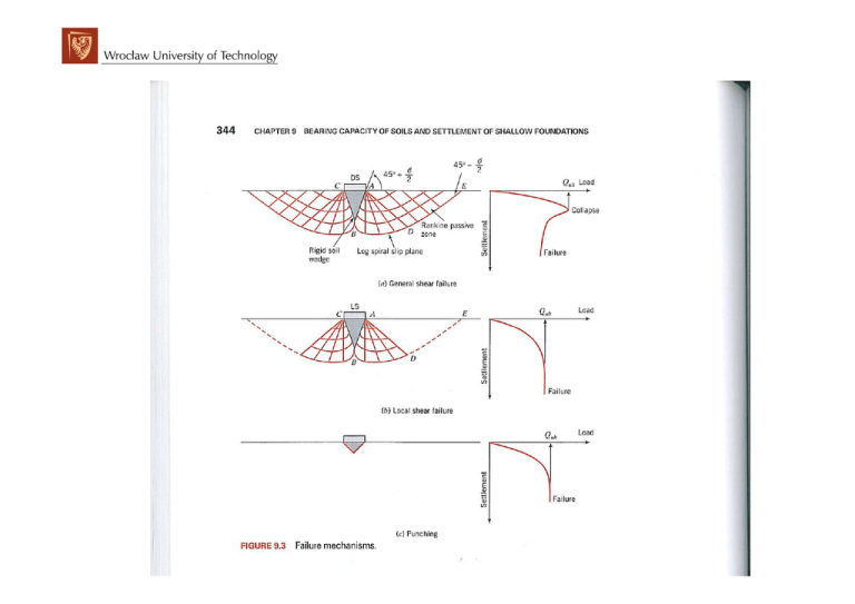 Uwagi dotyczące mechanizmu zniszczenia • Grunty zagęszczone zapadają się gwałtownie po „dobrze zdefiniowanych” powierzchniach poślizgu według „ogólnego mechanizmu ścinania. •Grunty luźne nie tracą nośności gwałtownie a powierzchnie poślizgu nie są „dobrze zdefiniowane”. Zwykle jest to lokalny mechanizm ścinania. •Bardzo luźne grunty mogą tracić nośność przez przebicie. •Większych osiadań można oczekiwać w gruntach luźnych aniżeli w gruntach zagęszczonych. Wybór głębokości posadowienia fundamentów Na wybór głębokości posadowienia mają wpływ następujące czynniki: •głębokość występowania gruntów nośnych, na których budowla może być bezpiecznie posadowiona; minimalną konstrukcyjną głębokość posadowienia przyjmuje się 0,5 m w stosunku najniżej przyległego terenu; •głębokość przemarzania w gruntach wysadzinowych; według PN-81/B-3020 minimalne głębokości posadowienia fundamentów ze względu na przemarzanie gruntów od poziomu terenu projektowanego do spodu fundamentu wynoszą 0,8 – 1,4 m; •głębokość rozmycia gruntu przy fundamentach podpór mostowych (np.. Poziom rozmycia dna Wisły w Warszawie dochodzi do 8 – 10 m); •poziom zwierciadła wody gruntowej; •wymagania eksploatacyjne dotyczące budowli, np. konieczności podpiwniczenia; •poziom posadowienia sąsiednich fundamentów. Wymiary podstawy fundamentu ustala się z zachowaniem następujących założeń i warunków normowych: • • przyjmuje się liniowy rozkład obliczeniowych obciążeń jednostkowych q w poziomie posadowienia według rysunku 3.1. a-c; (W obliczeniach q należy uwzględniać fakt, że w przypadku gdy wypadkowa obciążeń znajduje się poza rdzeniem przekroju podstawy fundamentu, powstaje szczelina między podłożem i podstawą fundamentu. Oznacza to, że nie mogą wstąpić naprężenia rozciągające między podłożem i podstawą fundamentu.); wypadkowa sił od obliczeniowych obciążeń stałych oraz zmiennych długotrwałych nie powinna wychodzić poza rdzeń podstawy fundamentu; c) d) eB eL 1 + <6 B L Nr eL q r min eB B Nr eB eL 1 + >6 B L eL q r max szczelina eB q r max C rdzeń podstawy L C' oś obojętna Rys. 3.1. Rozkłady obciążeń jednostkowych podłoża gruntowego obciążonego mimośrodowo: a),b) - ławą fundamentową, c),d) - stopą fundamentową • dla fundamentów o podstawie prostokątnej, gdy eB ≠ 0 oraz eL = 0, otrzymamy C ≤ B/4; • w budowlach wysokich mających fundament płytowy lub pierścieniowy (gdy wypadkowa jest zaczepiona na wysokości większej niż 3-krotna szerokość fundamentu) oraz w fundamentach słupów hal obciążonych suwnicami, wypadkowa siła od obliczeniowych obciążeń stałych oraz zmiennych długo- i krótkotrwałych nie może wychodzić poza rdzeń podstawy fundamentu. Wymagania dodatkowe Dla konstrukcji budynku wrażliwej na nierównomierne osiadania (konstrukcje statycznie niewyznaczalne) przy posadowieniu na gruntach bardzo ściśliwych ( spoiste i organiczne o module ściśliwości M < 5 MPa): q max ≤ 1,3 q min dla konstrukcji niewrażliwej na nierównomierne osiadanie (konstrukcje statycznie wyznaczalne) i posadowieniu na gruntach mało ściśliwych (piaski, żwiry i grunty spoiste o M > 20 MPa): q max ≤ 3,0 q min dla warunków konstrukcyjnych i gruntowych pośrednich, np. dla konstrukcji wrażliwej na nierównomierne osiadania i posadowieniu na gruntach mało ściśliwych o M > 20 MPa: q max ≤ 2,0 q min Na rozkłady oddziaływań miedzy fundamentem i podłożem, a także na nośność podłoża gruntowego bardzo istotny wpływ ma usytuowanie środka ciężkości podstawy fundamentu w stosunku do położeń wypadkowych obciążeń w rozpatrywanych schematach sił działających na fundament. Bardzo istotnym w projektowaniu stóp fundamentowych jest przyjęcie odpowiedniego stosunku boków B:L. Dla zadanych obciążeń, można znaleźć fundament o takich proporcjach B:L, że przy spełnieniu wszystkich wymagań jest to fundament najmniejszy, a więc najbardziej ekonomiczny. Przykład obliczeniowy Ława fundamentowa na podłożu jednorodnym W podłożu stwierdzono występowanie piasków drobnych wilgotnych, których stopień zagęszczenia określony bezpośrednimi badaniami w terenie wynosi ID= 0,40. Piaski drobne określono jako wysadzinowe. Pozostałe parametry geotechniczne wyznaczone metodą B wynoszą: ciężar objętościowy: ( n) −3 γ = 1,75 ⋅ 9,81 = 17,17 kN ⋅ m kąt tarcia wewnętrznego: Φ(u ) = 300 n Obciążenia: stałe i zmienne długotrwałe Pr1 = 180 kN⋅m-1, Hr1 = 5,4 KN⋅m-1, Mr1 = 23,2 kN⋅m⋅m-1 stałe i zmienne długo- i krótkotrwałe Pr2 = 200 kN⋅m-1, Hr2 = 5,8 kN⋅m-1 Mr2 = 28,8 kN⋅m⋅m-1. Wstępne przyjęcie wymiarów fundamentu i głębokości posadowienia Przyjęta głębokość posadowienia 1,95 m jest większa od umownej głębokości przemarzania 1,0 m. Przemarzanie podłoża z gruntu wsadzinowego nie nastąpi Przyjęto wstępnie wysokość ławy 0,35 m, szerokość 1,4 m. W celu zilustrowania racjonalnego projektowania fundamentów będą rozpatrzone dwa przypadki: A. Ława jest usytuowana symetrycznie względem osi ściany (rys. 3.5.a) B. Środek ławy jest przesunięty względem osi ściany (3.5.b). PRZYPADEK A. Ława jest usytuowana symetrycznie względem osi ściany. Obliczenia ciężarów ławy i gruntu na odsadzkach Wartości charakterystyczne obciążeń: ciężar ławy: G1n = 0,35 ⋅ 1,4 ⋅ 24,0 = 11,76 kN ⋅ m−1 ciężar gruntu nad odsadzką ławy z zewnątrz budynku: G 2 n = 0,55 ⋅ 1,6 ⋅ 18,0 = 15,84 kN ⋅ m−1 ciężar gruntu nad odsadzką ławy od strony piwnicy: G 3n = 0,55 ⋅ 0,3 ⋅ 18,0 = 2,97 kN ⋅ m−1 ciężar posadzki od strony piwnicy (w uzasadnionych przypadkach należy uwzględniać obciążenia użytkowe przekazywane przez posadzkę na fundament): G 4 n = 0,55 ⋅ 0,15 ⋅ 23,0 = 1,90 kN ⋅ m−1. Wartość obliczeniowa obciążenia: G r = ΣG in ⋅γ ≅ 3 8 ,