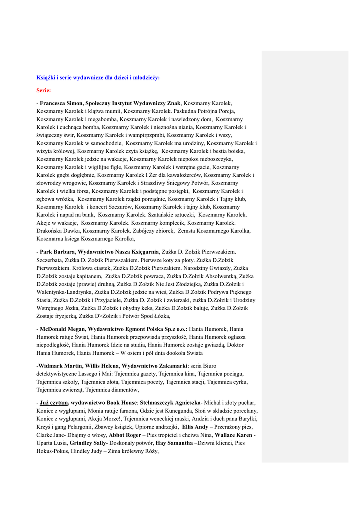 Książki i serie wydawnicze dla dzieci i młodzieży: Serie: - Francesca Simon, Społeczny Instytut Wydawniczy Znak, Koszmarny Karolek, Koszmarny Karolek i klątwa mumii, Koszmarny Karolek. Paskudna Potrójna Porcja, Koszmarny Karolek i megabomba, Koszmarny Karolek i nawiedzony dom, Koszmarny Karolek i cuchnąca bomba, Koszmarny Karolek i nieznośna niania, Koszmarny Karolek i świąteczny świr, Koszmarny Karolek i wampirpzpmbi, Koszmarny Karolek i wszy, Koszmarny Karolek w samochodzie, Koszmarny Karolek ma urodziny, Koszmarny Karolek i wizyta królowej, Koszmarny Karolek czyta książkę, Koszmarny Karolek i bestia boiska, Koszmarny Karolek jedzie na wakacje, Koszmarny Karolek niepokoi nieboszczyka, Koszmarny Karolek i wigilijne figle, Koszmarny Karolek i wstrętne gacie, Koszmarny Karolek gnębi dogłębnie, Koszmarny Karolek I Żer dla kawałożerców, Koszmarny Karolek i złowrodzy wrogowie, Koszmarny Karolek i Straszliwy Śniegowy Potwór, Koszmarny Karolek i wielka forsa, Koszmarny Karolek i podstępne postępki, Koszmarny Karolek i zębowa wróżka, Koszmarny Karolek rządzi porządnie, Koszmarny Karolek i Tajny klub, Koszmarny Karolek i koncert Szczurów, Koszmarny Karolek i tajny klub, Koszmarny Karolek i napad na bank, Koszmarny Karolek. Szatańskie sztuczki, Koszmarny Karolek. Akcje w wakacje, Koszmarny Karolek. Koszmarny komplecik, Koszmarny Karolek. Drakońska Dawka, Koszmarny Karolek. Zabójczy zbiorek, Zemsta Koszmarnego Karolka, Koszmarna ksiega Koszmarnego Karolka, - Park Barbara, Wydawnictwo Nasza Księgarnia, Zuźka D. Zołzik Pierwszakiem. Szczerbata, Zuźka D. Zołzik Pierwszakiem. Pierwsze koty za płoty. Zuźka D.Zołzik Pierwszakiem. Królowa ciastek, Zuźka D.Zołzik Pierszakiem. Narodziny Gwiazdy, Zuźka D.Zołzik zostaje kapitanem, Zuźka D.Zołzik powraca, Zuźka D.Zołzik Absolwentką, Zuźka D.Zołzik zostaje (prawie) druhną, Zuźka D.Zołzik Nie Jest Złodziejką, Zuźka D.Zołzik i Walentynka-Landrynka, Zuźka D.Zołzik jedzie na wieś, Zuźka D.Zołzik Podrywa Pięknego Stasia, Zuźka D.Zołzik i Przyjaciele, Zuźka D. Zołzik i zwierzaki, zuźka D.Zołzik i Urodziny Wstrętnego Józka, Zuźka D.Zołzik i ohydny keks, Zuźka D.Zołzik baluje, Zuźka D.Zołzik Zostaje fryzjerką, Zuźka D>Zołzik i Potwór Spod Łózka, - McDonald Megan, Wydawnictwo Egmont Polska Sp.z o.o.: Hania Humorek, Hania Humorek ratuje Świat, Hania Humorek przepowiada przyszłość, Hania Humorek ogłasza niepodległość, Hania Humorek Idzie na studia, Hania Humorek zostaje gwiazdą, Doktor Hania Humorek, Hania Humorek – W osiem i pół dnia dookoła Swiata -Widmark Martin, Willis Helena, Wydawnictwo Zakamarki: seria Biuro detektywistyczne Lassego i Mai: Tajemnica gazety, Tajemnica kina, Tajemnica pociągu, Tajemnica szkoły, Tajemnica złota, Tajemnica poczty, Tajemnica stacji, Tajemnica cyrku, Tajemnica zwierząt, Tajemnica diamentów, - Już czytam, wydawnictwo Book House: Stelmaszczyk Agnieszka- Michał i złoty puchar, Koniec z wygłupami, Monia ratuje faraona, Gdzie jest Kunegunda, Słoń w składzie porcelany, Koniec z wygłupami, Akcja Morze!, Tajemnica weneckiej maski, Andzia i duch pana Baryłki, Krzyś i gang Pelargonii, Zbawcy książek, Upiorne andrzejki, Ellis Andy – Przerażony pies, Clarke Jane- Dbajmy o włosy, Abbot Roger – Pies tropiciel i chciwa Nina, Wallace Karen Uparta Lusia, Grindley Sally- Doskonały potwór, Hay Samantha –Dziwni klienci, Pies Hokus-Pokus, Hindley Judy – Zima królewny Róży, - To lubię, wydawnictwo Literatura: Anna Onichimowska – Duch starej kamienicy, Maciek i łowcy duchów, Gdzie jesteś tatusiu?, Najwyższa góra świata, Barbara Stenka- Oj, Hela!, Hela i zajęcia pozaszkolne, Joanna Papuzińska- Wędrowcy, Rokiś powraca. Rokiś i kraina dachów, Rokiś. Gdzie ja się, biedniuteńki, podzieję, Tomasz Trojanowski- Kocie historie, Kosmiczne komplikacje,Kocie historie – nowe przygody, Julka i koty kocich historii część II, Paweł Beręsewicz – Tajemnica człowieka z blizną, Na przykład Malgośka, Beata Ostrowicka- Niezwykłe wakacje, Irena Landau – Witaj Córeczko, Kalina JerzykowskaWidma z ulicy Wydmowej Upiorne przygody Koszmariusza i Horroraty, Paweł Wakuła- Co w trawie piszczy, Ewa Chotomska- Pamiętnik Felka Parerasa, Moja babcia gra na trąbie, Stanisławska-Meysztowicz Mira, Kasdepke Grzegorz- Przyjaciele, Jerzykowska Kalina, Karwacki Wojciech – 13.skrytka, - Masini Beatrice, Wydawnictwo Nasza Księgarnia, Różowe Baletki. Tanecznym krokiem, Różowe Baletki. Co za charakter, - Tytus, Romek i A’Tomek – komiksy, ale to już chyba kultowa seria -Kinney Jeff, Wydawnictwo Nasza Księgarnia: Dziennik Cwaniaczka, Dziennik Cwaniaczka. Rodrick Rządzi, Dziennik Cwaniaczka. Ubaw po Pachy, Dziennik Cwaniaczka. Przykra Prawda, Dziennik Cwaniaczka. Szczyt wszystkiego, - Beręsewicz Paweł, Wydawnictwo Skrzat: Przygody Ciumków, Wielka Wyprawa Ciumków, - Lewis Clive Staples, Opowieści z Narni : Lew, Czarownica i stara szafa, Książę Kaspian, Podróż Wędrowca Do Świtu, Srebrne krzesło, Koń i jego chłopiec, Siostrzeniec czarodzieja, Ostatnia bitwa, - Sempe Jean-Jacques: Mikołajek, Nowe Przygody Mikołajka - Sommer-Bodenburg Angela, Wydawnictwo W.A.B., seria Wampirek: Wampirek, Wampirek na wsi, Wampirek na szkolnej wycieczce, Wampirek i wielki spisek, Wampirek się opala, Wampirek się opala, Wampirek w jaskini lwa, Wampirek i dziwny pacjent, Wampirek i kronika rodzinna, Wampirek w podróży, Wampirek w dolinie lamentu, Wampirek w niebezpieczeństwie, Wampirek przeprowadza się, Wielka miłość Wampirka, - Drzewiecka Krystyna: Piątka z zakątka, Banda z uroczyska, Nowe przygody Piątki z Zakątka, Wielka wyprawa Karmuli - Kosik Rafał, Wydawnictwo Powergraph, seria Felix, Net i Nika - Baccalario Pierdomenico, Wydawnictwo Oleksiejuk, seria Ulysses Moore: Wrota czasu, Antykwariat ze starymi mapami, Dom luster, Wyspa Masek, Kamienni strażnicy, Pierwszy klucz, Ukryte miasto, Mistrz piorunów, Labir