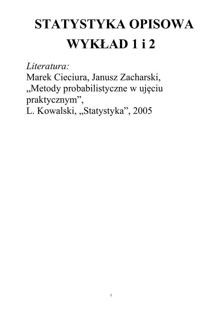 STATYSTYKA OPISOWA WYKŁAD 1 i 2 Literatura: Marek Cieciura, Janusz Zacharski, „Metody probabilistyczne w ujęciu praktycznym”, L. Kowalski, „Statystyka”, 2005 1 2 Statystyka to dyscyplina naukowa, której zadaniem jest wykrywanie, analiza i opis prawidłowości występujących w procesach masowych. 3 Populacja to zbiorowość podlegająca badaniu statystycznemu. Aby populację określić jednoznacznie charakteryzujemy ją pod względem: –rzeczowym –czasowym –przestrzennym (terytorialnym). 4 Cecha to właściwość elementów populacji ze względu na którą prowadzimy badanie statystyczne. Warianty to wartości cechy (cecha powinna mieć przynajmniej dwa warianty). 5 Przykład Populacja: Studenci II semestru Wydziału Elektroniki WAT, wg stanu na 1.10.2010. Cechy: • płeć, • wzrost, • kolor oczu, • ocena na egzaminie z matematyki po I semestrze, • ulubiony tygodnik, • wysokość miesięcznych dochodów, • czas poświęcony na naukę w tygodniu poprzedzającym ostatnią sesję egzaminacyjną. 6 Przykład Populacja: Samochody osobowe zarejestrowane w Warszawie, wg stanu na 1.09.2010. Cechy: • kolor karoserii, • przebieg, • średnie zużycie paliwa na 100 km, • marka, • czas osiągania prędkości 100 km/godz. 7 Uproszczona klasyfikacja cech: 8 Badanie statystyczne może być: – pełne (obejmuje całą populację), – częściowe (obejmuje część populacji – próbę). 9 Próba powinna być reprezentatywna tzn. rozkład wariantów badanej cechy w próbie powinien być zbliżony do rozkładu w całej populacji. 10 George Gallup 1901-1984 Pionier w dziedzinie badania opinii publicznej. Rozwinął technikę doboru grupy reprezentatywnej 11 Uwaga Badania pełne nie zawsze są możliwe lub celowe (badania niszczące, duża poplacja, wysokie koszty). 12 „Humor Polski” – lata 80-te 13 Liczebność próby. Dla reprezentatywnej próby dorosłej liczebności Polski zwykle 1000 – 1300 osób. Jerzy Spława-Neyman (1894 - 1981) polski i amerykański matematyk i statystyk. Wprowadził pojęcie przedziału ufności. 14 CHARAKTERYSTYKI LICZBOWE Charakterystyki liczbowe to wielkości wyznaczone na podstawie danych statystycznych, charakteryzujące własności badanej cechy. Zakładamy, że badana cecha jest mierzalna. 15 Klasyfikacja charakterystyk: – charakterystyki położenia (np. średnia, mediana, dominanta), – charakterystyki rozproszenia (np. wariancja, odchylenie standardowe, odchylenie ćwiartkowe, współczynnik zmienności), – charakterystyki asymetrii (np. współczynnik asymetrii, wskaźnik asymetrii), – charakterystyki spłaszczenia (np. kurtoza). 16 Charakterystyki mogą być: – klasyczne (wyznaczone przez wszystkie wartości danych statystycznych, np. średnia, wariancja, odchylenie standardowe, współczynnik zmienności, współczynnik asymetrii), – pozycyjne (wyznaczone przez niektóre (decyduje ich pozycja) wartości danych statystycznych, np. mediana, dominanta, kwartyle), – mieszane (np. wskaźnik asymetrii). 17 Dane statystyczne prezentujemy zwykle w postaci • Szeregu prostego (stosujemy w przypadku małej liczby danych), • Szeregu rozdzielczego punktowego (stosujemy gdy dane się powtarzają), • Szeregu rozdzielczego przedziałowego (stosujemy gdy danych jest dużo i się nie powtarzają), 18 Szereg prosty Oznaczenia: X – badana cecha, n – liczba danych statystycznych, xi – dane statystyczne (i = 1, 2, ..., n), Przykład X – czas dojazdu do pracy (min), Dane od 20 pracowników: 18, 26, 35, 12, 38, 45, 25, 54, 32, 15, 28, 22, 15, 18, 48, 42, 55, 14, 36, 16, tzn. x1 = 18, x2 = 26, …., x20 = 16, 19 Średnia (arytmetyczna) 1 n x = ∑ xi n i =1 Np. dla danych 2, 5, 3, 4, 6, średnia wynosi 4 (sumujemy dane i sumę dzielimy przez liczbę danych). 20 21 Uwaga Własność (suma odchyleń od średniej jest równa zero) n ∑ (x i =1 i − x ) =0 22 EXCEL: ŚREDNIA Zwraca wartość średnią (średnią arytmetyczną) argumentów. Składnia ŚREDNIA(liczba1;liczba2;...) Liczba1; liczba2;... to od 1 do 255 argumentów liczbowych, 23 Dominanta d = wariant cechy występujący najczęściej (o ile taki istnieje). Np. dla danych 2, 3, 4, 3, 2, 5, 3, 2, 3 dominantą jest 3. Natomiast dla danych 2, 3, 4, 3, 2, 5, 3, 2, 3, 2 dominanta nie jest określona (mówimy, że jest to rozkład dwumodalny). 24 EXCEL: WYST.NAJCZĘŚCIEJ Zwraca wartość najczęściej występującą lub powtarzającą się w tablicy albo w zakresie danych. Składnia WYST.NAJCZĘŚCIEJ(liczba1;liczba2;...) Liczba1; liczba2;... to 1 do 255 argumentów, Zamiast listy argumentów rozdzielonych średnikami można zastosować także pojedynczą tablicę lub odwołanie do tablicy. Jeśli zbiór danych nie zawiera zduplikowanych punktów danych, funkcja WYST.NAJCZĘŚCIEJ zwraca wartość błędu #N/D!. 25 Mediana (wartość środkowa) Jeśli x1 ≤ x2 ≤...... ≤ xn dane uporządkowane to x n+1 dla n nieparzystych 2 me = 1 x n + x n+2 dla n parzystych 2 2 2 26 Przykład Dla danych (po uporządkowaniu) 2, 2, 3, 3, 4, 5, 5, 5, 5 medianą jest 4. Dla danych (po uporządkowaniu) 2, 2, 2, 3, 3, 4, 5, 5, 5, 5 medianą jest 3,5. 27 EXCEL: MEDIANA Zwraca wartość mediany dla podanych liczb. Mediana jest liczbą w środku zbioru liczb. Składnia MEDIANA(liczba1;liczba2;...) Liczba1; liczba2;... to 1 do 255 liczb, dla których należy wyznaczyć medianę. 28 Podział co 50% - mediana, Podział co 25% - kwartyle, q1, q2 = me, q3, Podział co 10% - decyle, Podział co 1% - percentyle (centyle), 29 Obliczanie kwartyli. Jeśli x1 ≤ x2 ≤...... ≤ xn dane uporządkowane to dla n = 4 k + 3 x n +1 4 x dla n = 4 k + 2 n +4 2 q1 = 1 x n + 3 + x n + 3 dla n = 4 k + 1 2 −1 4 4 1 dla n = 4 k x n + x n + 1 2 4 4 x 3n +3 4 x 3 n4+ 2 q3 = 1 x 3 n +1 + x 3 n + 5 2 4 4 1 x 3 n + x 3 n +1 2 4 4 dla n = 4 k + 3 dla n = 4 k + 2 dla n = 4 k + 1 dla n = 4 k 30 EXCEL: KWARTYL Zwraca kwartyl zbioru danych. Składnia KWARTYL(tablica;kwartyl) Tablica to tablica lub zakres komórek