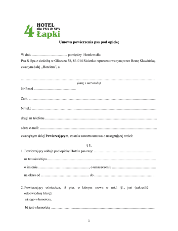 Umowa powierzenia psa pod opiekę W dniu ..................... .................. pomiędzy Hotelem dla Psa & Spa z siedzibą w Gliszczu 38, 86-014 Sicienko reprezentowanym przez Beatę Klawińską, zwanym dalej „Hotelem”, a …………………………………………………………………………………………………….. (imię i nazwisko) Nr Pesel ................................................ Zam. ………………………………………………………………………………......................... Nr tel.: ………………………………............................................................................................... drugi nr telefonu ................................................................................................................................ adres e-mail: ...................................................................................................................................... zwaną/nym dalej Powierzającym, została zawarta umowa o następującej treści: § 1. 1. Powierzający oddaje pod opiekę Hotelu psa rasy: ……………………………....................... nr tatuażu/chipu............................................................................................................................. o imieniu ………………….............................., o umaszczeniu .................................................. na okres od ……………………………….….. do …………………………………………… . 2. Powierzający oświadcza, iż pies, o którym mowa w ust.1 §1, jest (zakreślić odpowiednią literę): a) jego własnością, b) jest własnością …………………........................................................................................... 1 3. Powierzający oświadcza, iż w przypadku, o którym mowa w ust. 2 pkt b §2, ma pełne prawo oddania psa pod opiekę Hotelu, dane mu przez Właściciela psa. § 2. 1. Powierzający oświadcza, iż oddawany pod opiekę Hotelu pies: a) posiada aktualne szczepienia, b) został zabezpieczony przed kleszczami. 2. Powierzający oświadcza, iż oddawany pod opiekę Hotelu pies jest (zakreślić odpowiednią literę): a) zdrowy . b) leczony na .............................................................................................................................. 3. Na okres pobytu w Hotelu Powierzający pozostawia: a) książeczkę zdrowia psa, b) obrożę, smycz, kaganiec. § 3. 1. Powierzający przekazuje psa pod opiekę Hotelu. Koszt pobytu psa w Hotelu w okresie od …………..................................... do …………............................ został ustalony i wynosi łącznie kwotę ......................................... , którą zapłacono w dniu przyjęcia psa. § 4. 1. W związku z zawarciem niniejszej umowy, Hotel zobowiązuje się do: a) właściwej opieki nad psem (dbanie o jego stan psychiczny i fizyczny), b) maksymalnego skrócenia czasu aklimatyzacji psa w Hotelu, c) zgodnie z wcześniejszymi ustaleniami z Powierzającym informowania Go o przebiegu pobytu psa, 2 d) karmienia psa według zasad określonych przez Powierzającego, e) w razie konieczności – otoczenia go opieką weterynaryjną, informując o tym Powierzającego. 2. W związku z zawarciem niniejszej umowy, Powierzający zobowiązuje się do: a) poinformowania Hotelu o aktualnym stanie zdrowia przekazywanego psa i przebytych chorobach, b) informacji o charakterze przekazywanego psa (agresja wobec ludzi lub zwierząt, fobie, przyzwyczajenia), c) podania innych istotnych informacji dotyczących powierzonego psa („informacja o psie”) , d) uregulowania płatności, e) odebrania psa z Hotelu w ustalonym w umowie terminie. § 5. 1. Ustalony w niniejszej umowie okres pobytu psa w Hotelu może być – za zgodą Hotelu – zmieniony. 2. Gdy nastąpi skrócenie terminu pobytu psa, Powierzający jest zobowiązany zapłacić pełną kwotę. 3. W przypadku wydłużenia terminu pobytu psa – za zgodą Hotelu, Powierzający jest zobowiązany do pokrycia kosztów ustalonych z Hotelem. 4. W sytuacji, gdy Powierzający: a) nie przekaże pełnych wpłat, o których mowa w ust. 3, b) nie będzie się kontaktował z Hotelem w sprawie wydłużenia pobytu psa oraz będzie nieosiągalny pod podanym numerem telefonu, 3 c) okaże się, że podany w Formularzu Zgłoszeniowym numer telefonu jest nieaktualny, a Powierzający nie poinformował Hotelu o tym fakcie i nie dokonał zmiany numeru na aktualny, d) nie dopełnił wymogów, o których mowa w ust. 2 i 3 § 5. oraz nie odebrał psa osobiście lub przez osobę upoważnioną przez niego na piśmie w ciągu tygodnia po upływie terminu odbioru określonego w niniejszej umowie, strony ustalają, iż zastosowanie znajduje § 6 niniejszej umowy. § 6. 1. W sytuacjach, o których mowa w ust. 4 punkt a, b, c, d § 5. niniejszej umowy, Powierzający zrzeka się na rzecz Hotelu wszelkich praw do psa, o którym mowa w ust. 1 § 1 niniejszej umowy i nie będzie zgłaszał w stosunku do Hotelu żadnych roszczeń. § 7. 1. Koszty związane z opieką weterynaryjną, ponosi Powierzający. § 8. 1. Powyższa umowa została sporządzona w dwóch egzemplarzach, po jednym dla każdej ze stron. Powierzający Hotel (data i czytelny podpis) (data i czytelny podpis) Kwituję odbiór psa z Hotelu w dniu ................................... o godz. ……………………… Powierzający Hotel (data i czytelny podpis) (data i czytelny podpis) 4