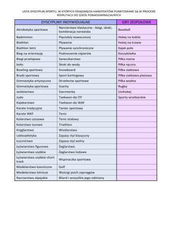 LISTA DYSCYPLIN SPORTU, W KTÓRYCH OSIĄGNIĘCIA KANDYDATÓW PUNKTOWANE SĄ W PROCESIE REKRUTACJI DO SZKÓŁ PONADGIMNAZJALNYCH DYSCYPLINY INDYWIDUALNE GRY ZESPOŁOWE Akrobatyka sportowa Narciarstwo klastyczne -‐ biegi, skoki, kombinacja norweska Baseball Badminton Pięciobój nowoczesny Hokej na lodzie Biathlon Pływanie Hokej na trawie Biathlon letni Pływanie synchroniczne Kajak polo Bieg na orientację Podnoszenie ciężarów Koszykówka Biegi przełajowe Saneczkarstwo Piłka nożna boks Skoki do wody Piłka ręczna Bowling sportowy Snowboard Piłka siatkowa Brydż sportowy Sport kartingowy Piłka siatkowa plażowa Gimnastyka artystyczna Strzelectw sportowe Piłka wodna Gimnastyka sportowa Szachy Rugby Jeździectwo Szermierka Unihokej Judo Taekwon-‐do ITF Sporty wrotkarskie Kajakarstwo Taekwon-‐do WAF Karate tradycyjne Taniec sportowy Karate WKF Tenis Kolarstwo szosowe Tenis stołowy Kolarstwo torowe Triathlon Kręglarstwo Wioślarstwo Lekkoatletyka Zapasy styl klasyczny Łucznictwo Zapasy styl wolny Łyżwiarstwo figurowe Żeglarstwo Łyżwiarstwo szybkie Żeglarstwo lodowe Łyżwiarstwo szybkie-‐short Wspinaczka sportowa track Modelarstwo kosmiczne Golf Modelarstwo lotnicze Wyścigi psich zaprzęgów Narciarstwo alpejskie Bilard i wszystkie jego odmiany